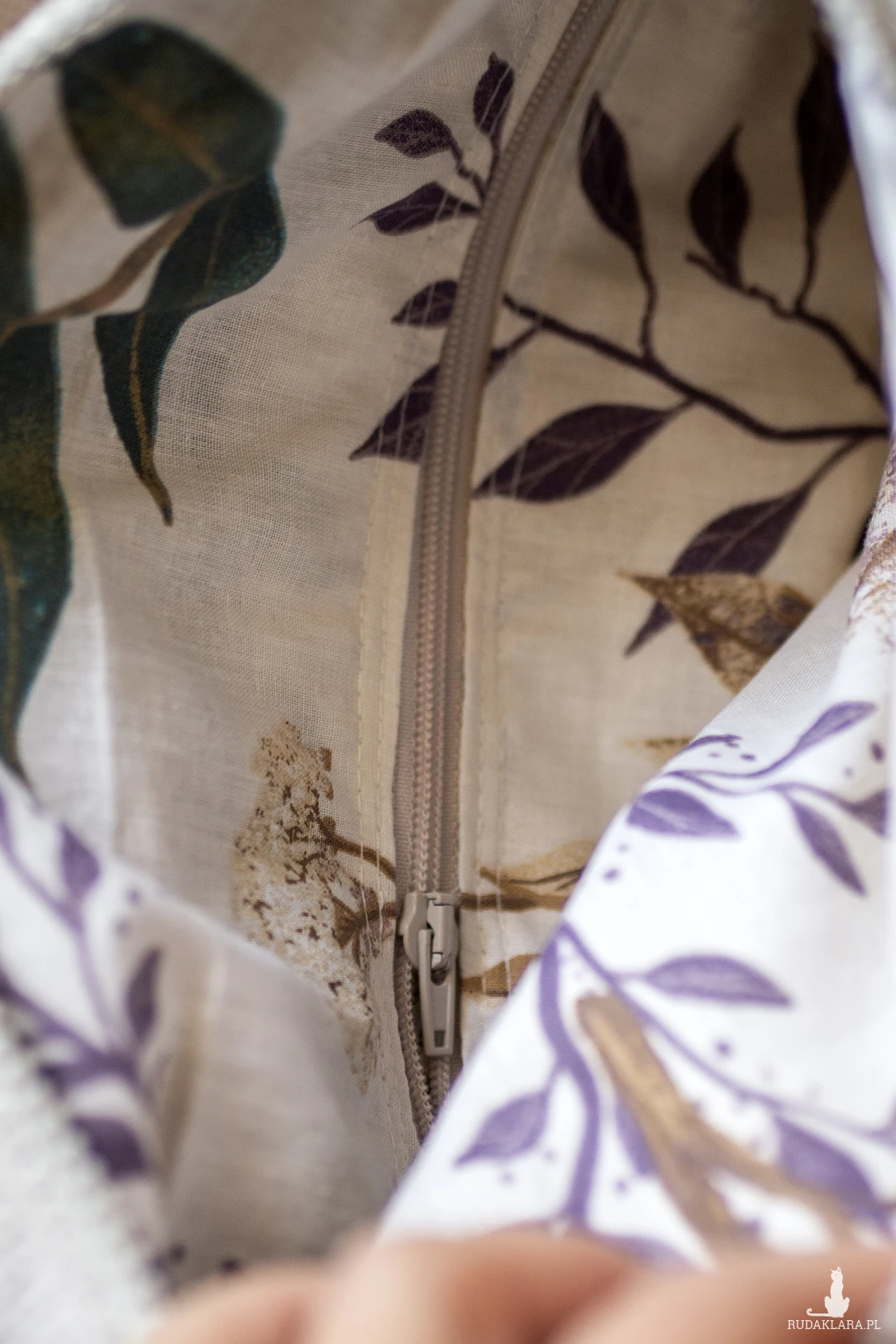 Regulowane paski. W środku kremowa, bawełniana podszewka w kwiaty oraz mała kieszonka na suwak.