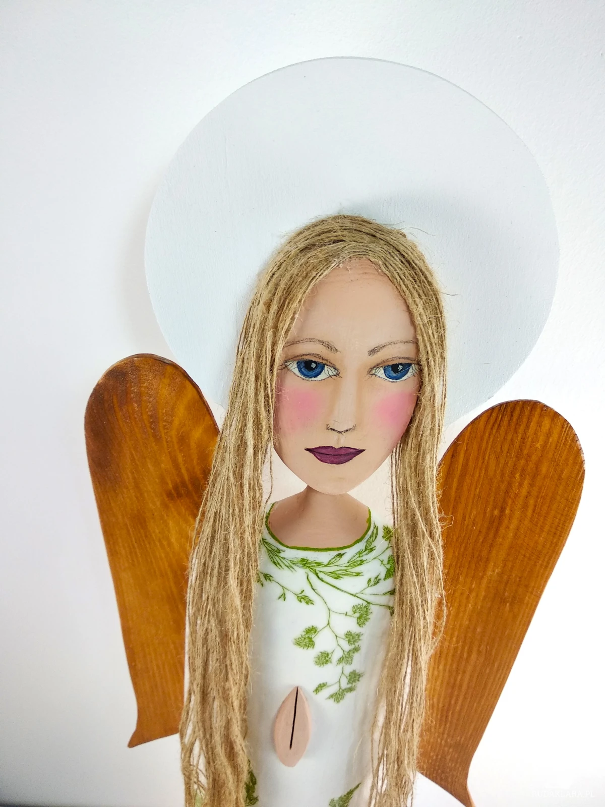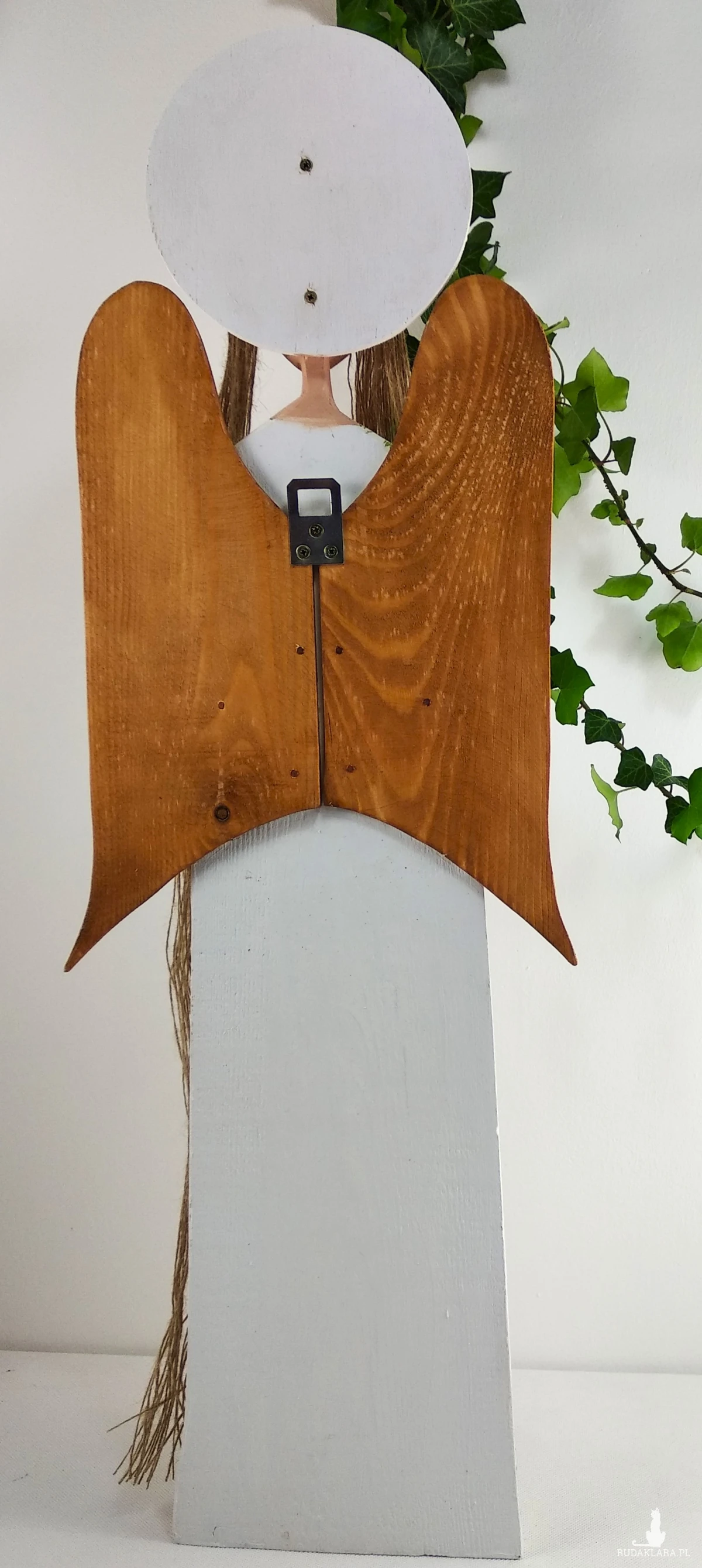 Drewniane skrzydła w naturalnym kolorze oraz jutowe włosy podkreślają organiczny charakter anioła. Twarz pełna spokoju i łagodności sprawia, że dekoracja wprowadza do wnętrza poczucie ciszy i ukojenia — jakby niosła ze sobą szept łąkowego wiatru.