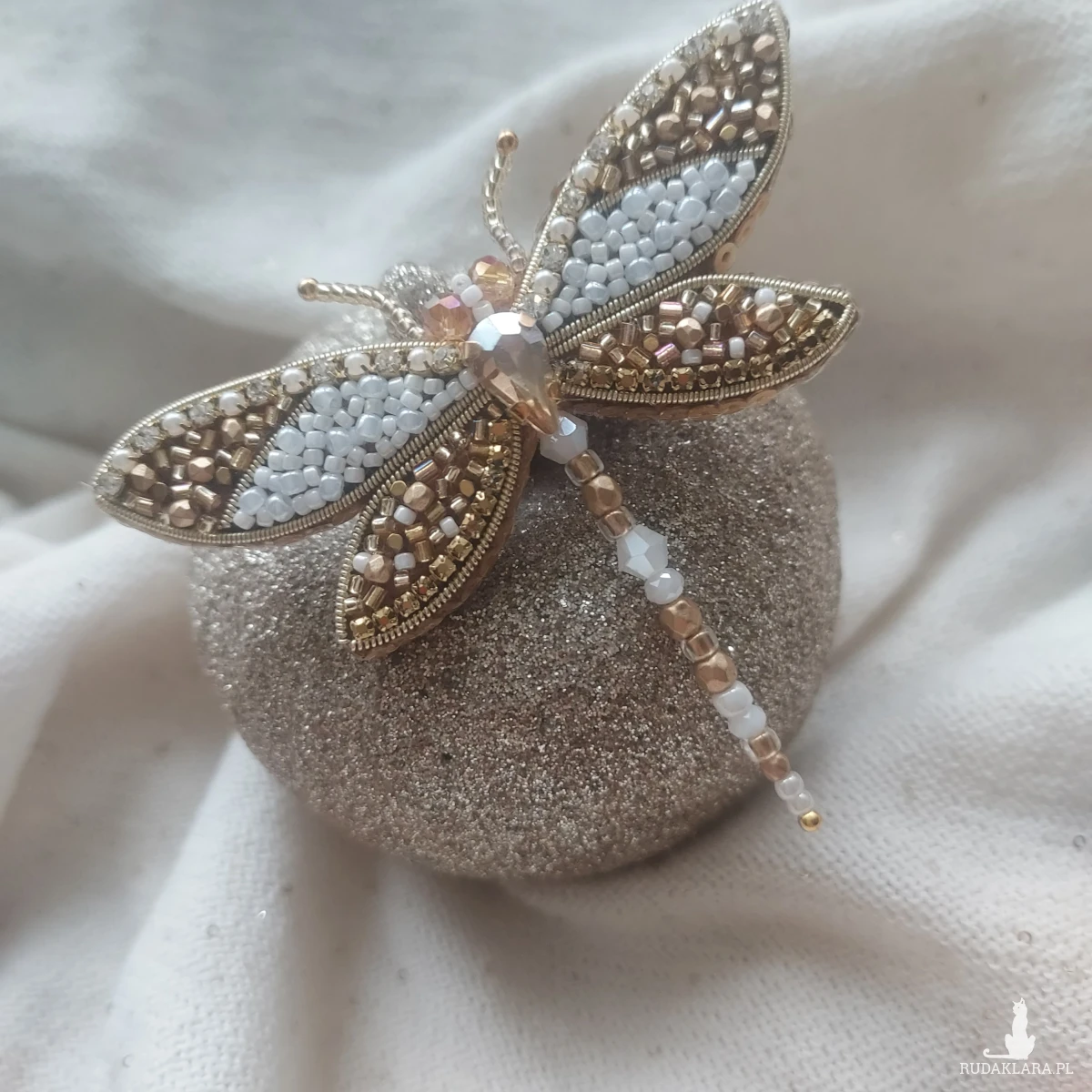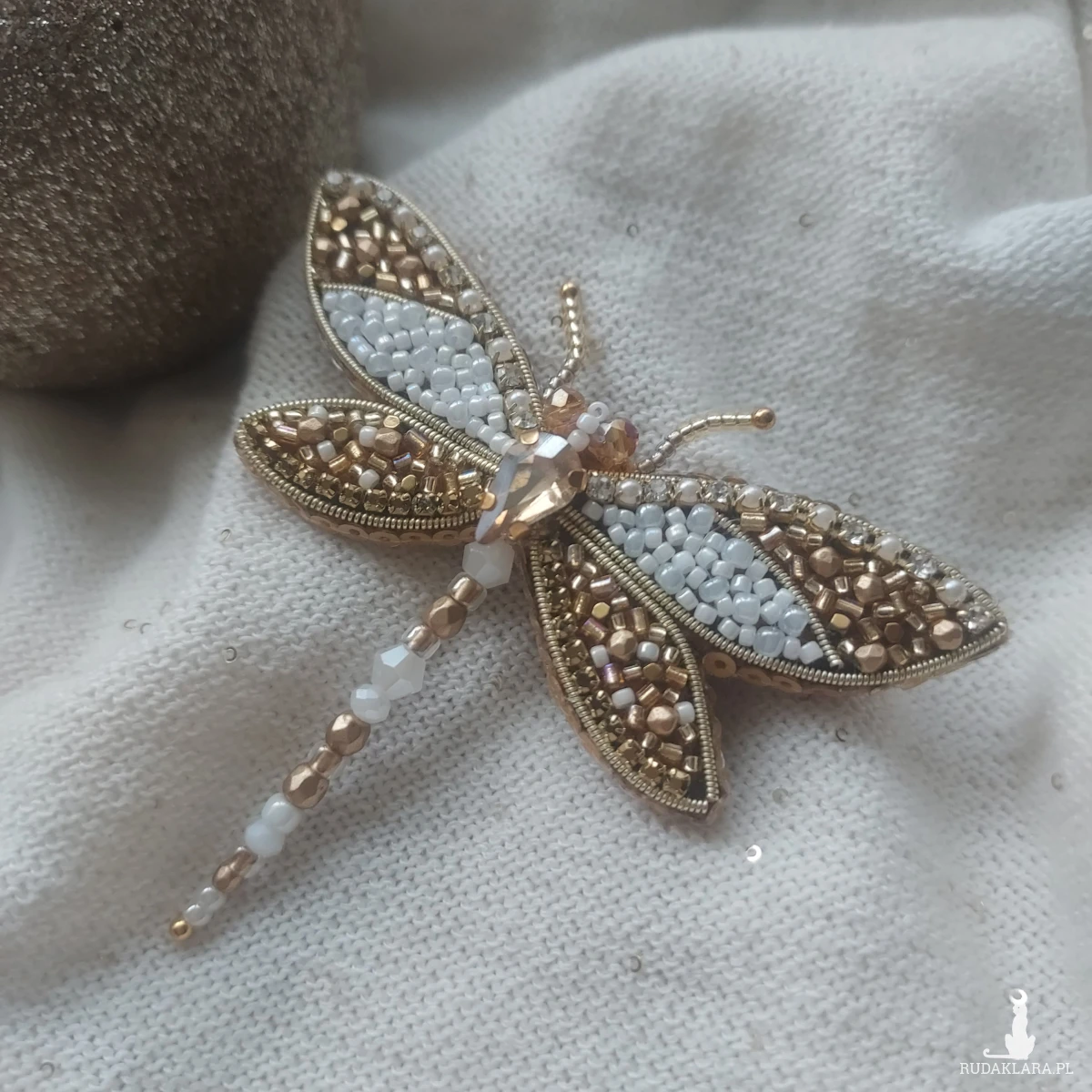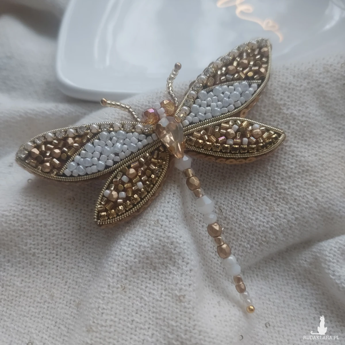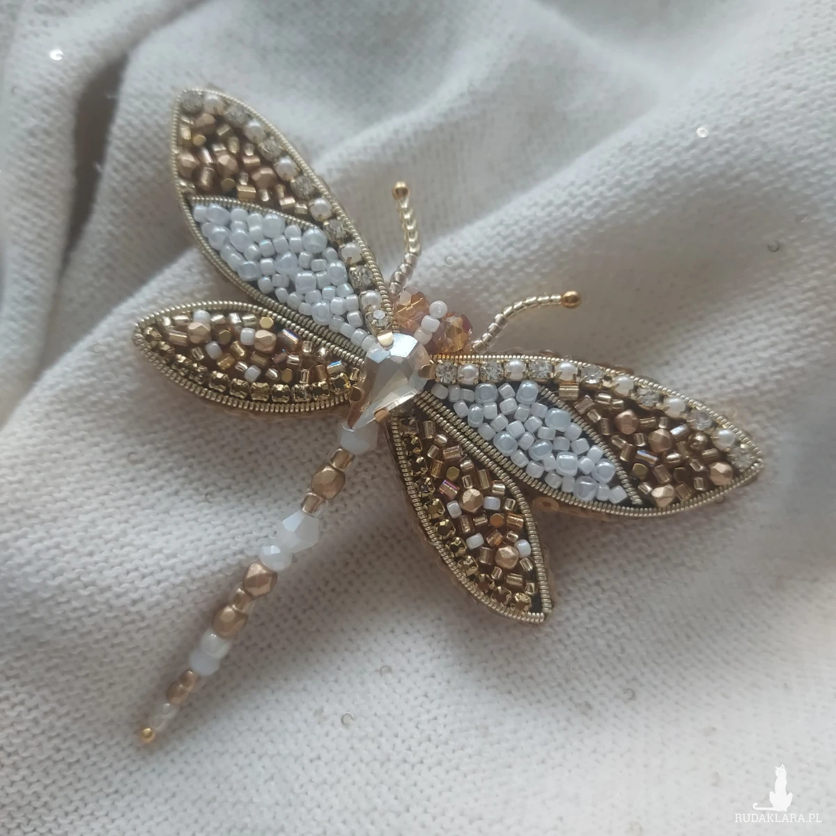 Broszka ważka w kolorze perłowo-złotym - wiosenno-letnie szaleństwo piękna oraz delikatności. Broszka powstała haftem koralikowym z dbałością o każdy szczegół.