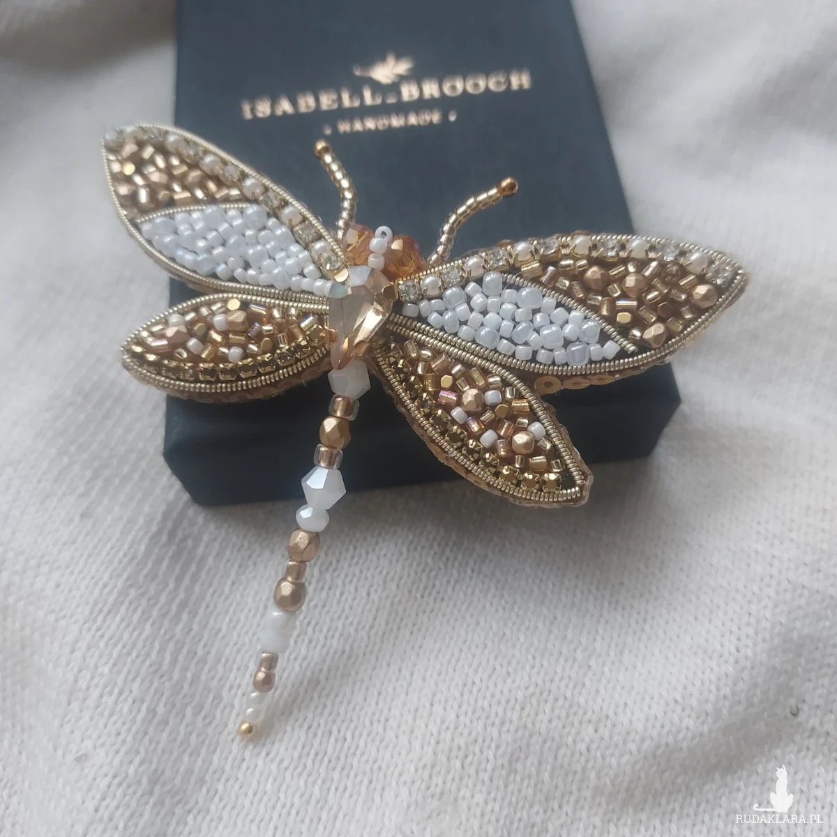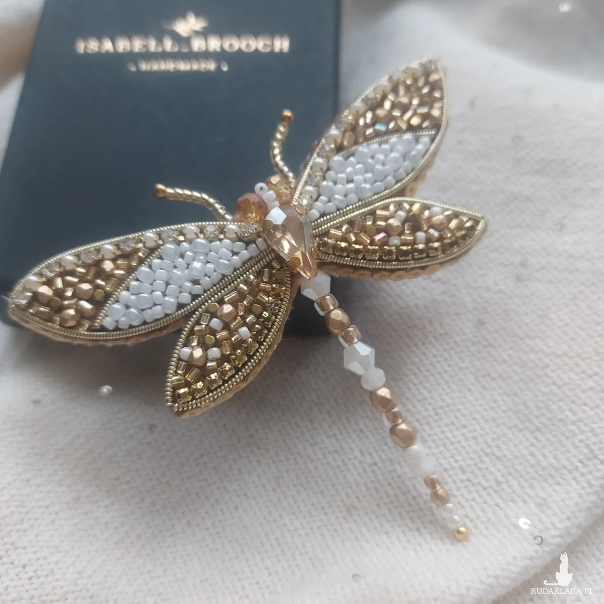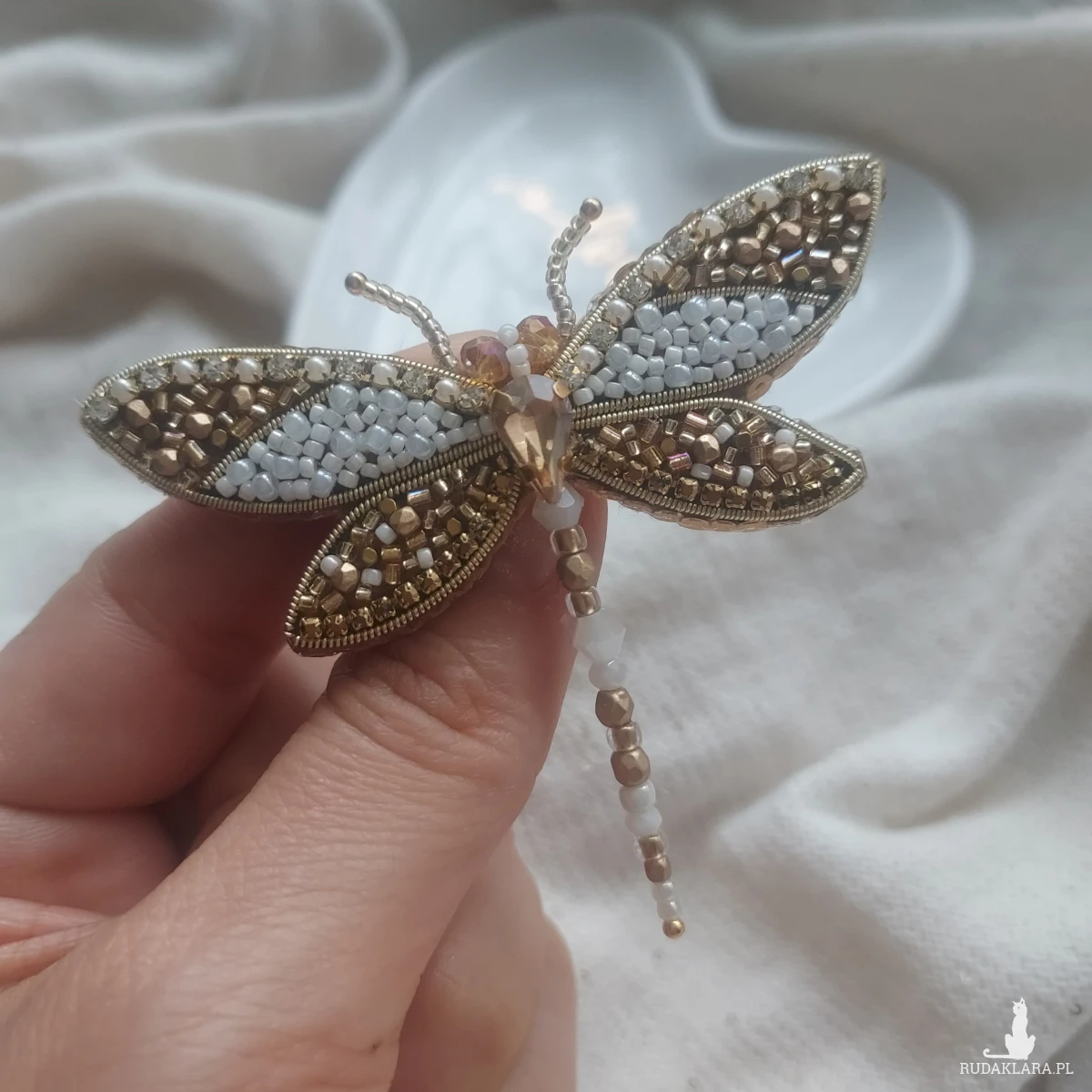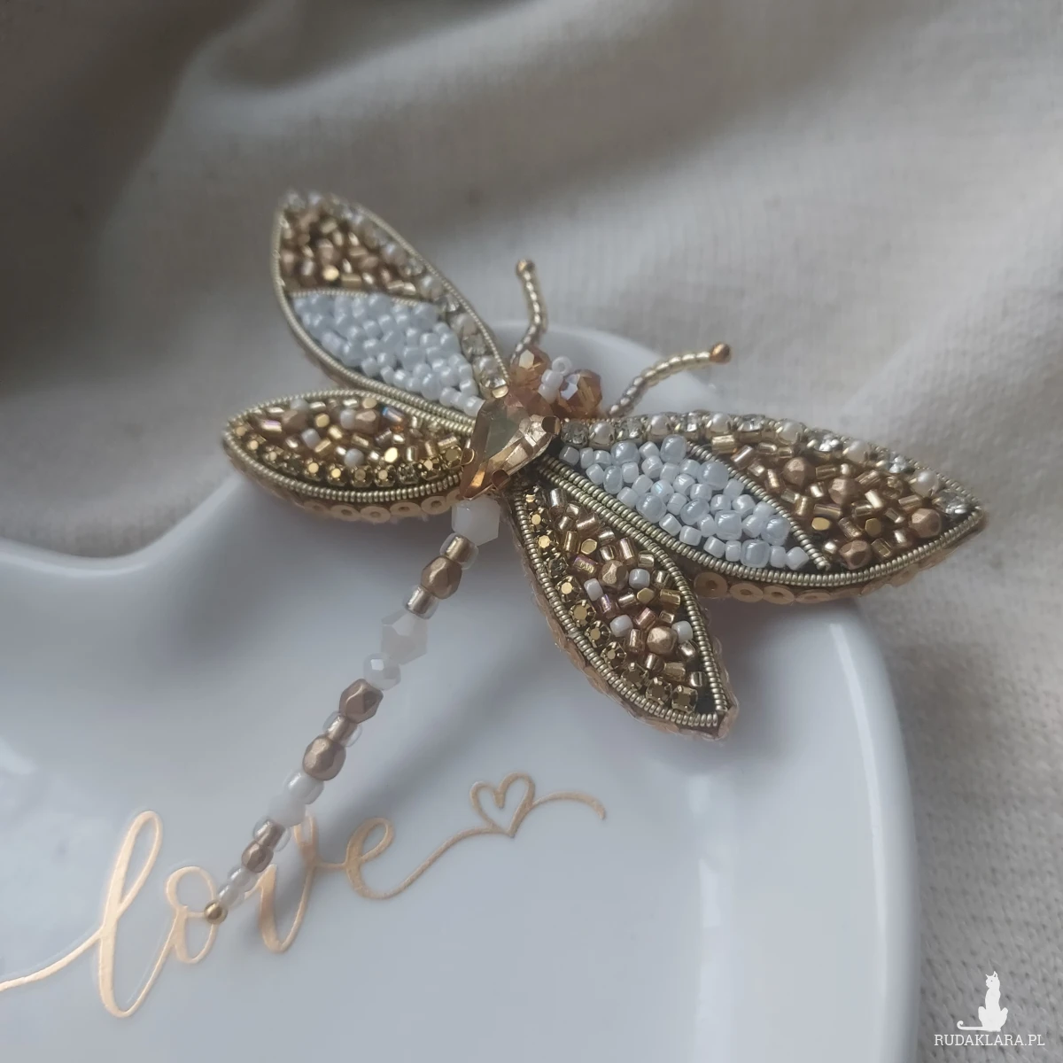 Broszka ważka w kolorze perłowo-złotym - wiosenno-letnie szaleństwo piękna oraz delikatności. Broszka powstała haftem koralikowym z dbałością o każdy szczegół.