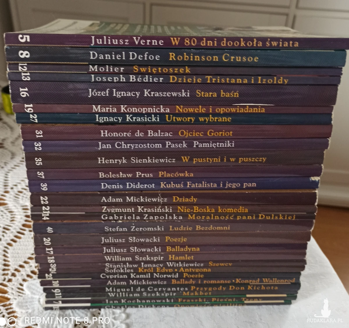Seria 27 lektur wszech czasów dla podstawówki i szkoły średniej wydawnictwo Orkla Press Polska . Kolekcja zebrana drogą subskrypcji. Oprawa miękka, stan idealny bez śladów używania. Format bliski A5. Wydanie adresowane do nauczycieli oraz uczniów w różnym wieku / szkoła podstawowa i średnia/. Do wykorzystania w pracy nauczyciela i ucznia. Wygodna biblioteczka dla każdego domu. Doskonała seria na prezent. Gorąco polecam. Wykaz tytułów: W pustyni i w puszczy H.Sienkiewicz, Nowele i opowiadania M.Konopnicka, W 80 dni dookoła świata J.Verne, Robinson Crusoe D.Defoe, Świętoszek Molier, Dzieje Tristana i Izoldy J.Bedier, Stara baśń J.I.Kraszewski, Utwory wybrane I.Krasicki, Ojciec Goriot H.Balzac, Pamiętniki J.C Pasek, Placówka B.Prus, Kubuś Filatelista i jego pan D.Diderot, Dziady A. Mickiewicz, Nie-Boska komedia Z.Krasiński, Moralność Pani Dulskiej G.Zapolska, Ludzie bezdomni S.Żeromski, Poezje J.Słowacki, Balladyna J.Słowacki, Hamlet W.Szekspir, Szewcy I.Witkiewicz, Król Edyp Sofokles, Poezje C.K.Norwid, Ballady i romanse, Konrad Wallenrod A.Mickiewicz, Przygody Don Kichota M.Cervantes, Makbet W.Szekspir, Fraszki, Pieśni, Treny J.Kochanowski, Opowieść wigilijna Ch.Dikens.