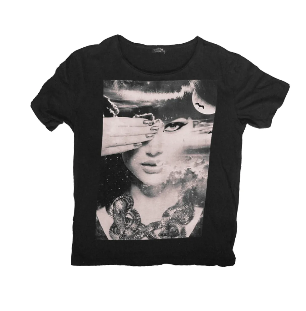 Nowa koszulka w czarnym kolorze i w rozmiarze M. T-shirt z nadrukiem- wzór z twarzą dziewczyny, kobiety. Materiał: bawełna 100%. Wymiary: