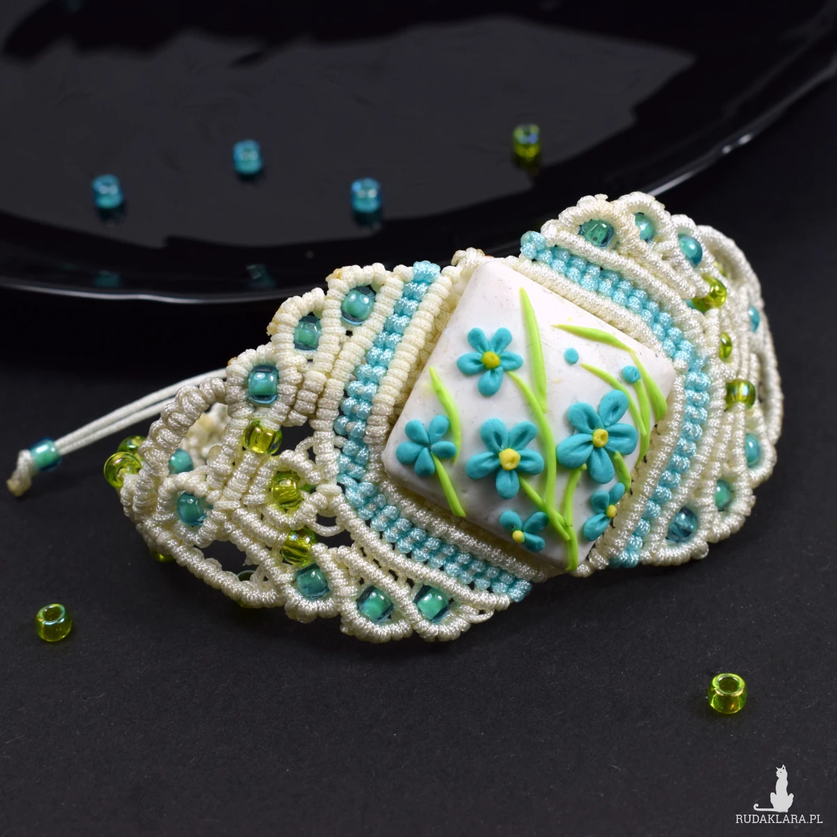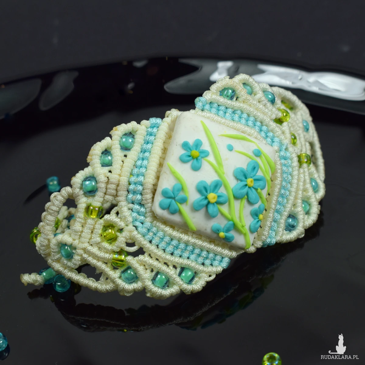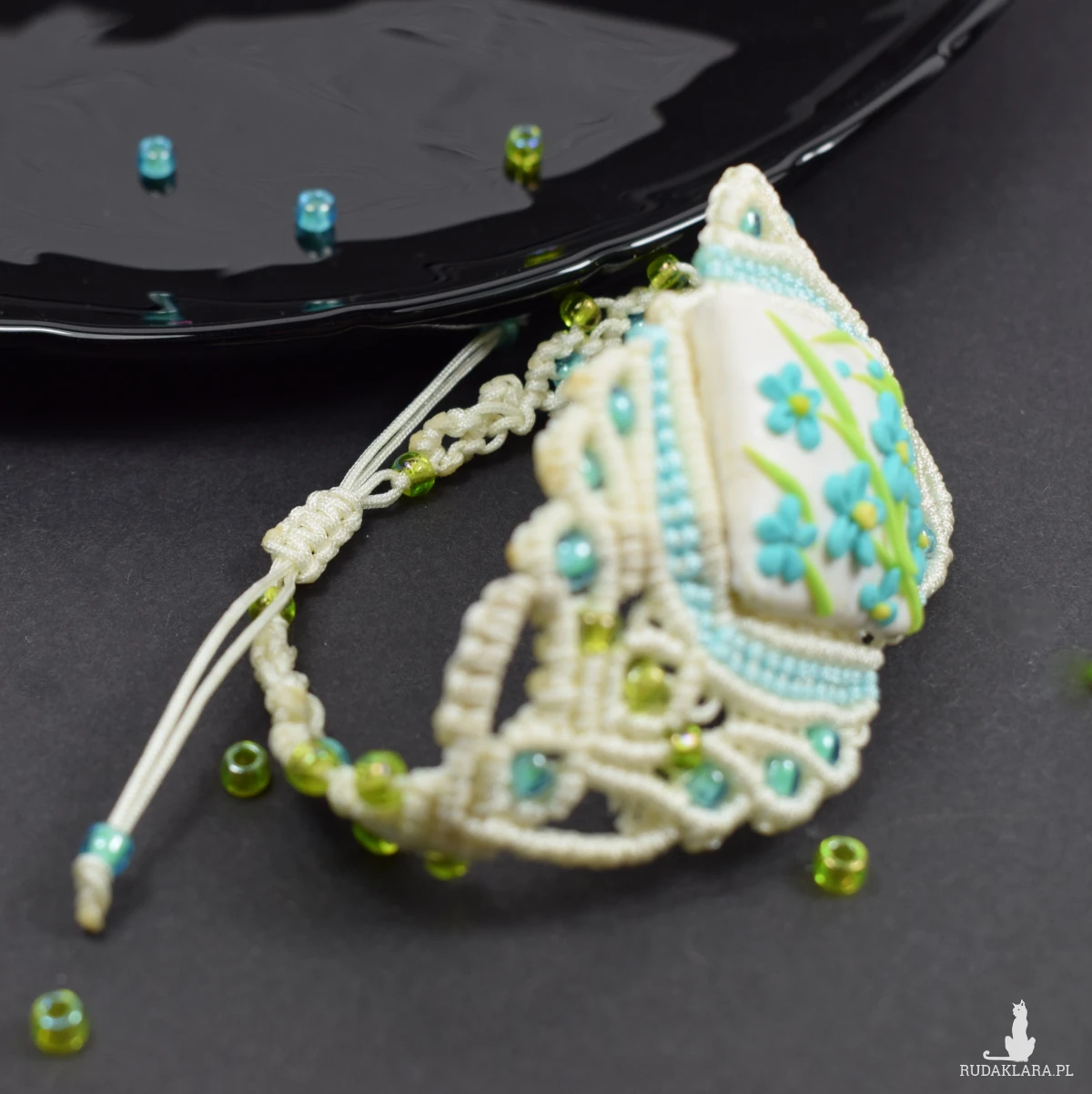 oraz ozdobiona szklanymi koralikami w delikatnych odcieniach błękitu i