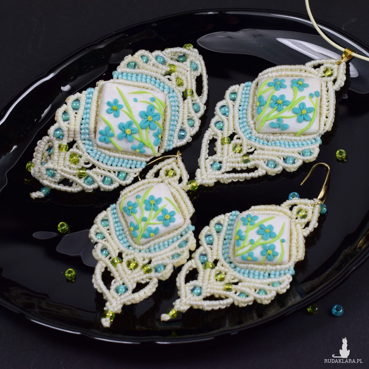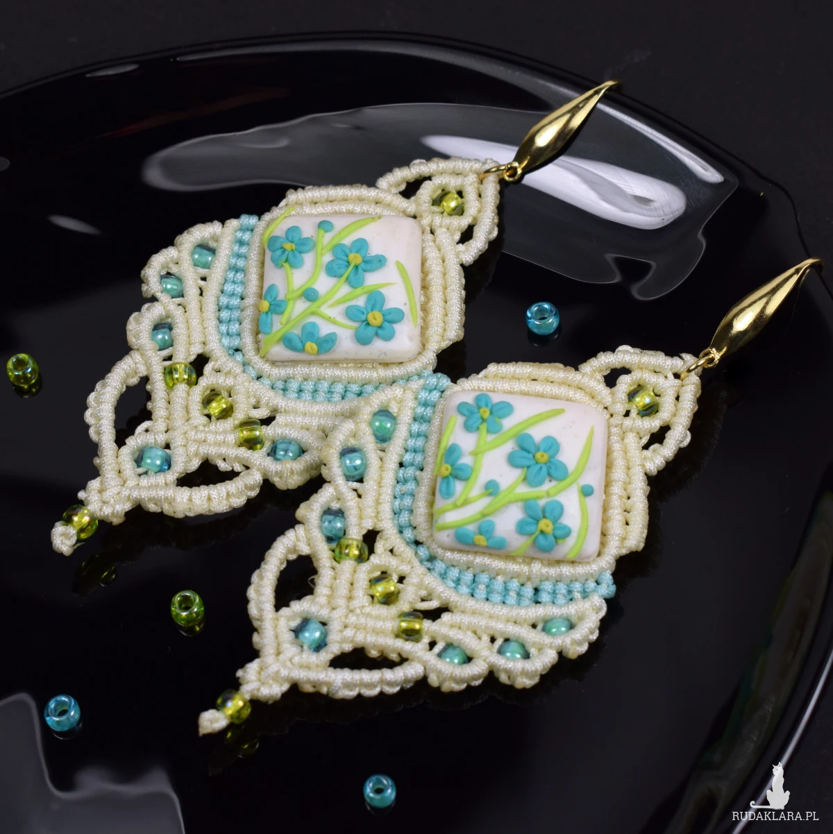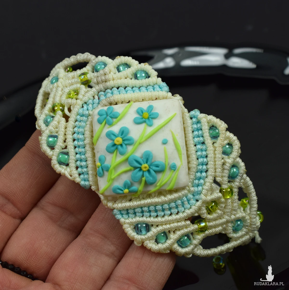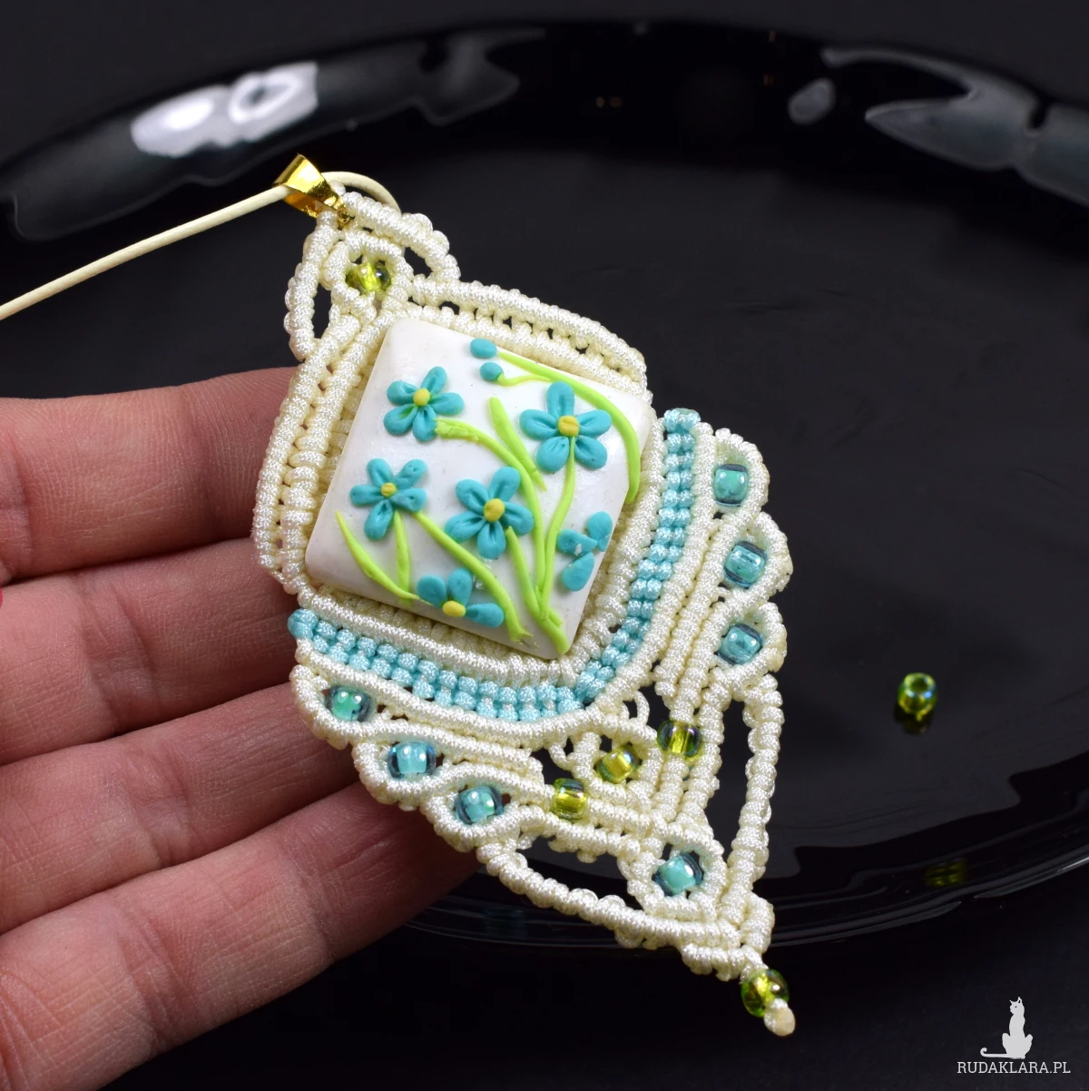 Materiał: sznurek makrama (kolor kremowy), szklane koraliki (błękit, zieleń), glinka polimerowa