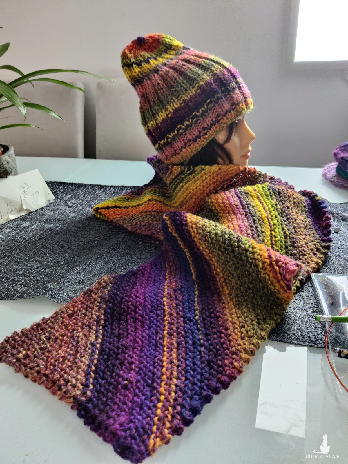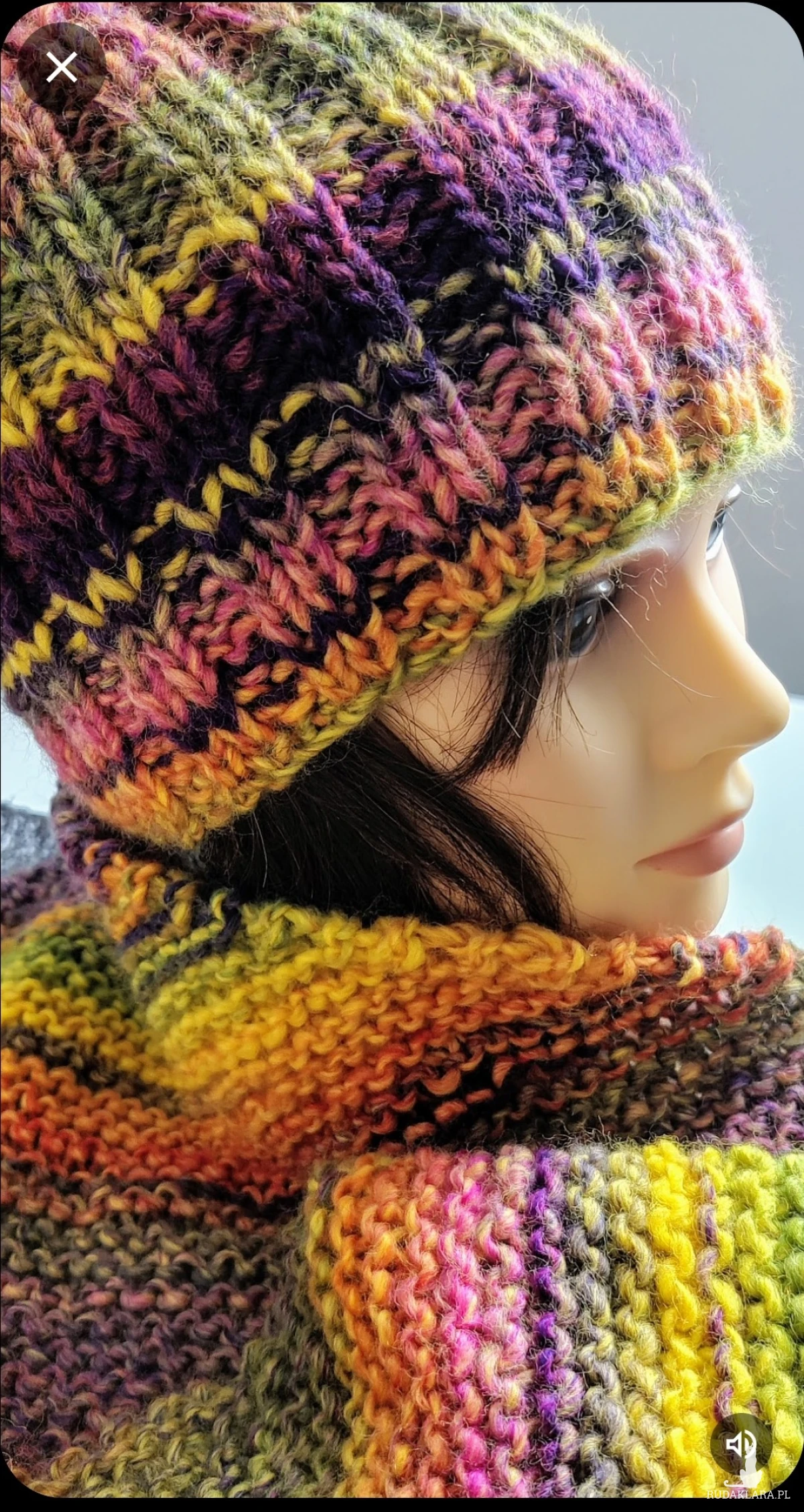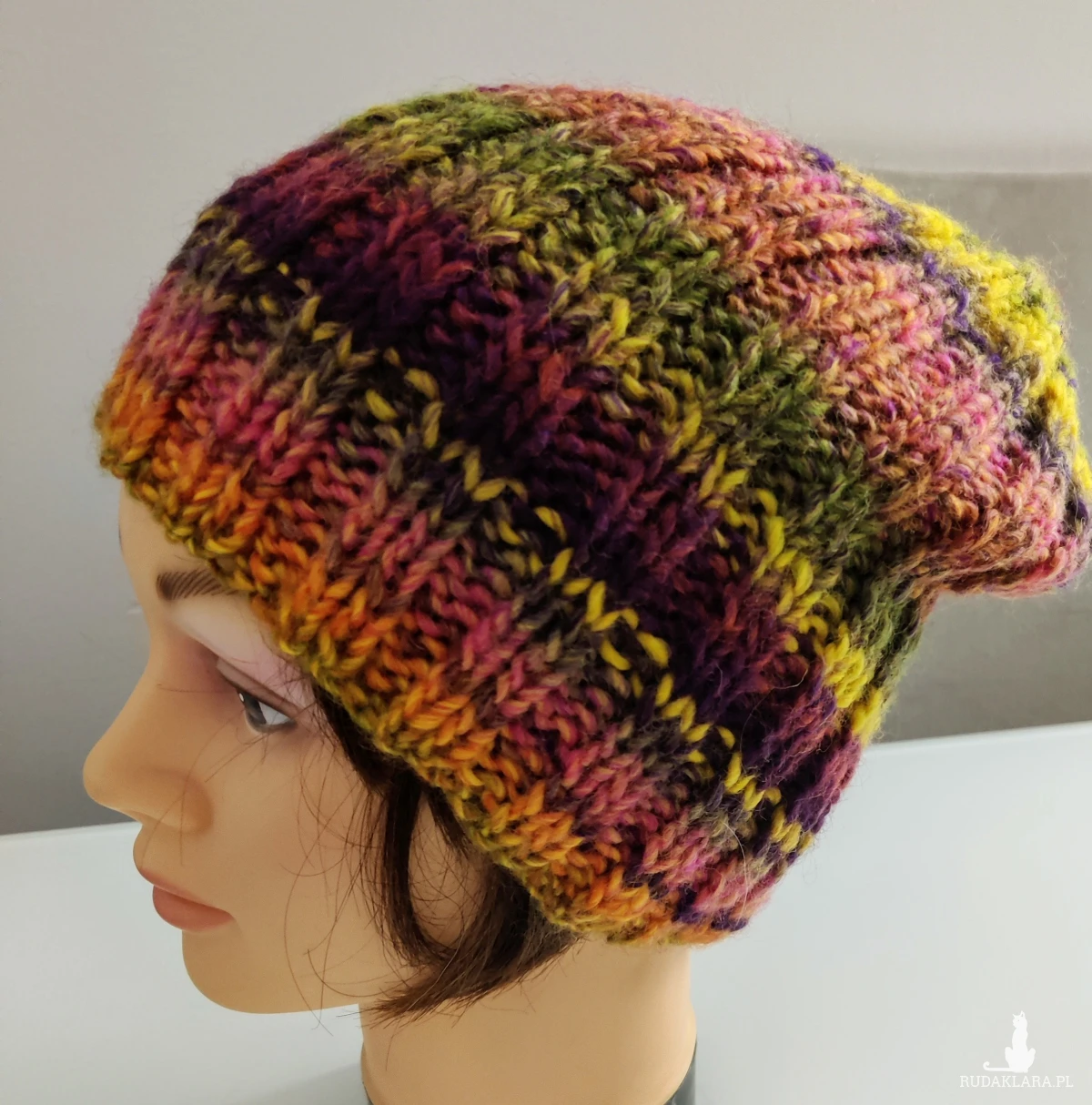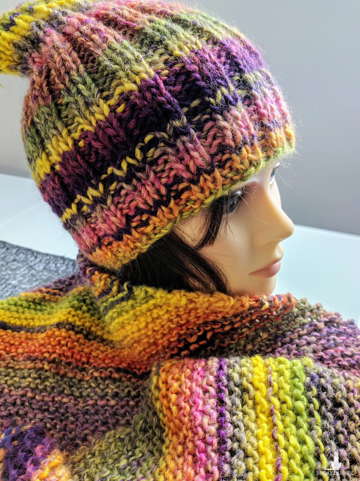 Czapka uniwersalna, ciepła, energetyczne kolory niezwykle twarzowe ponad czasowe w komplecie z szalem ożywią szarą jesień i zimę.
