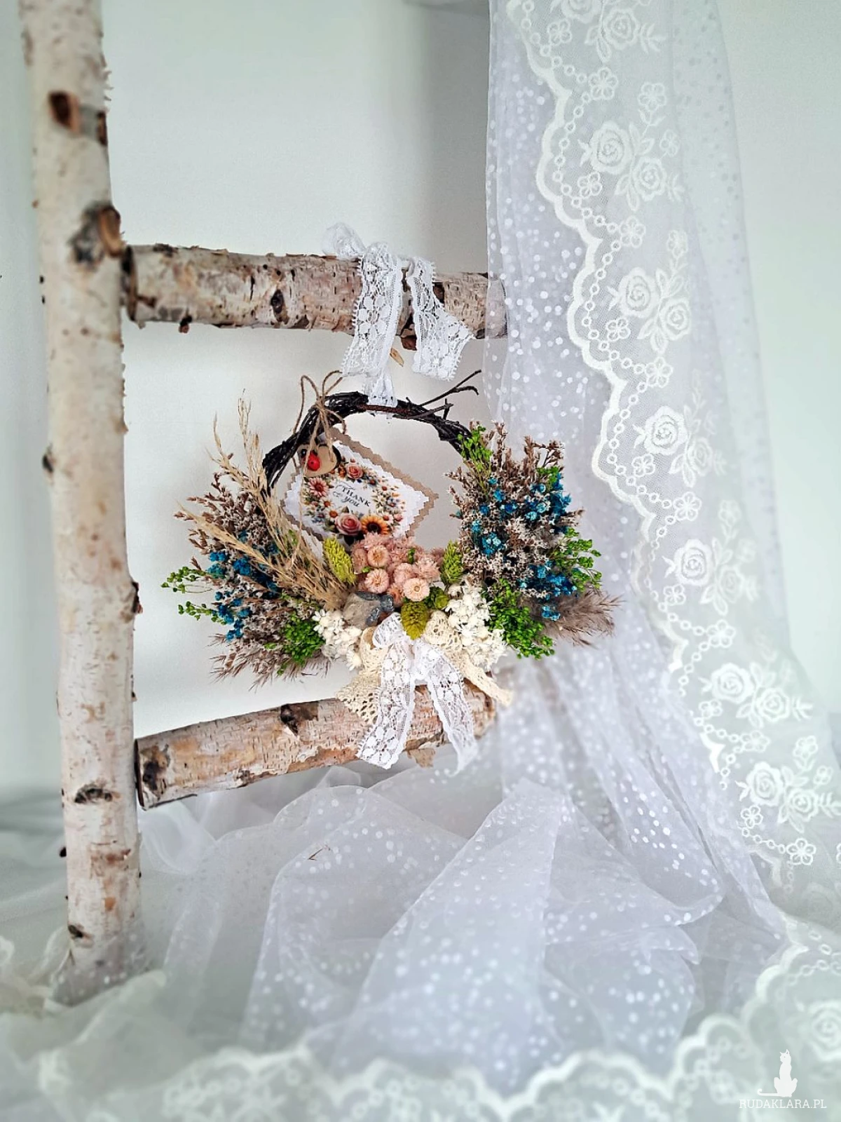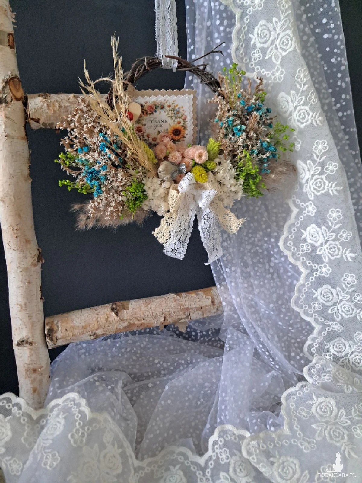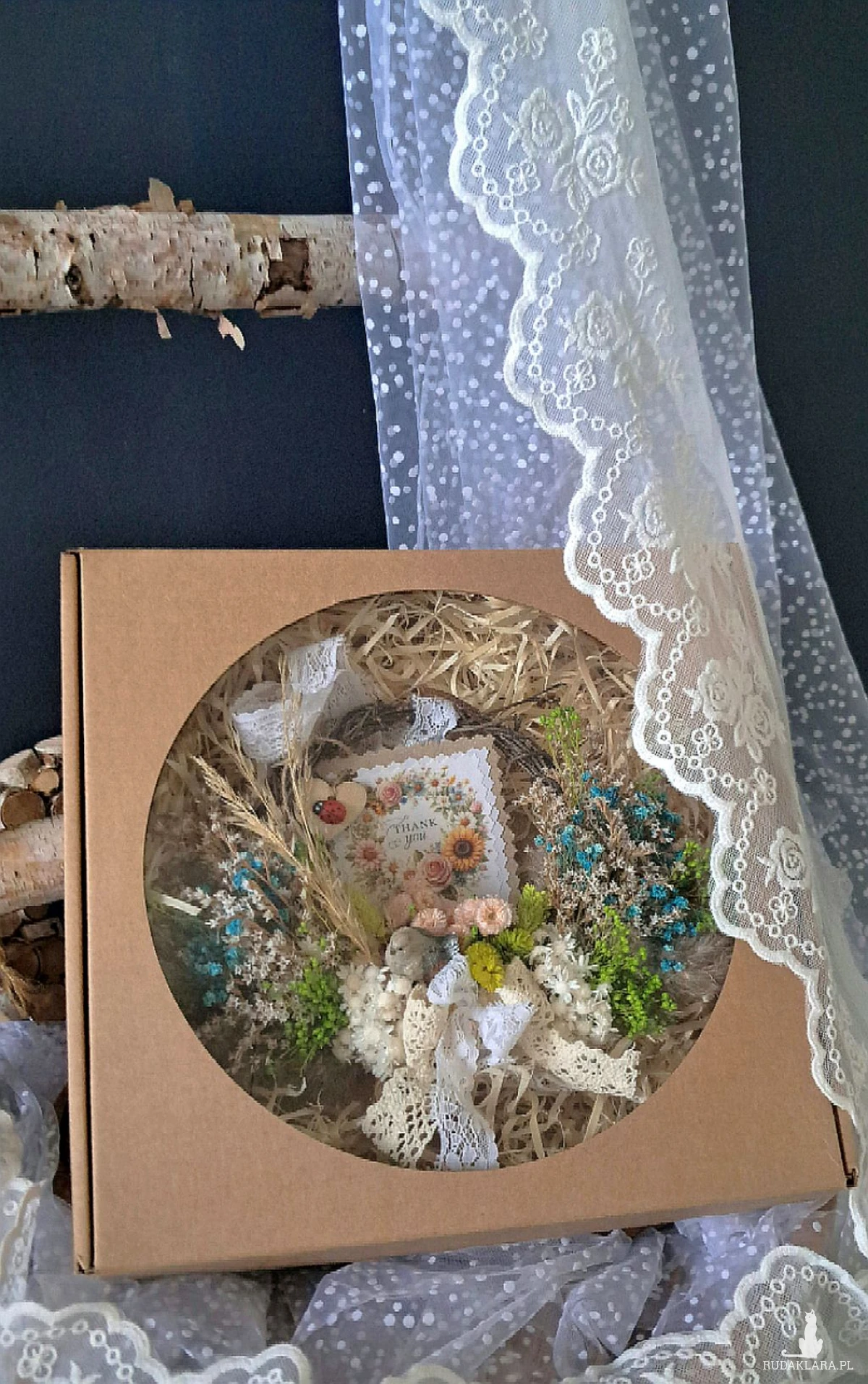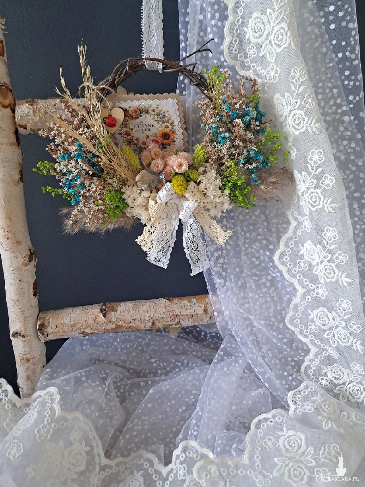 Mam do sprzedania własnoręcznie wykonany wianek na podłożu z witek brzozowych, udekorowany suszonymi roślinami: gliksja, kocanka włoska, żarnowiec stabilizowany, gipsówka, zatrwian tatarski. Ponadto dodano ptaszka z żywicy syntetycznej oraz bawełniane koronki w różnych kolorach. Zapakowany w pudełko z okienkiem o wymiarach 27x27 cm. Doskonały pomysł na prezent, jako forma wdzięczności, cieszący oczy i serce przez długi czas.