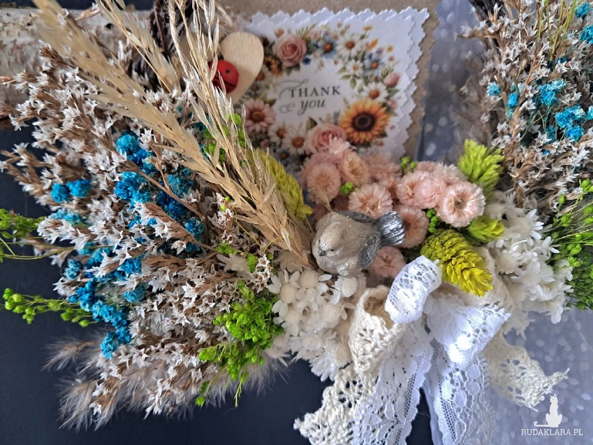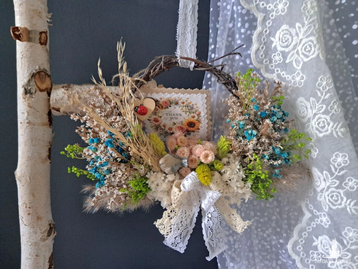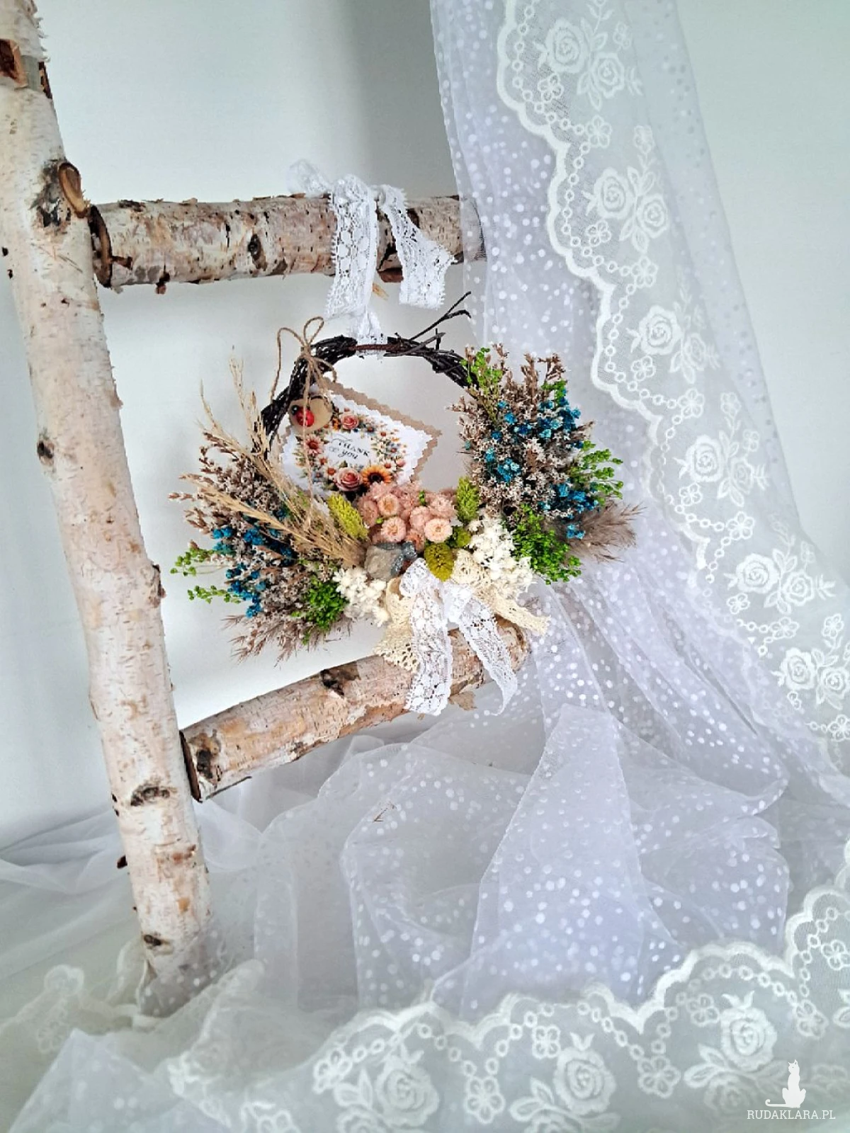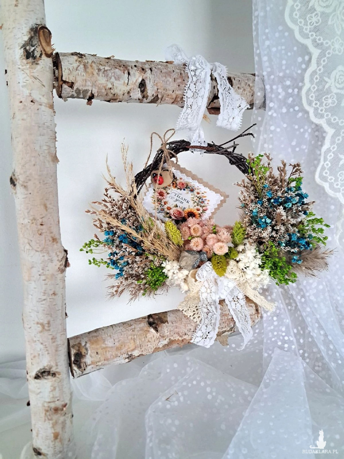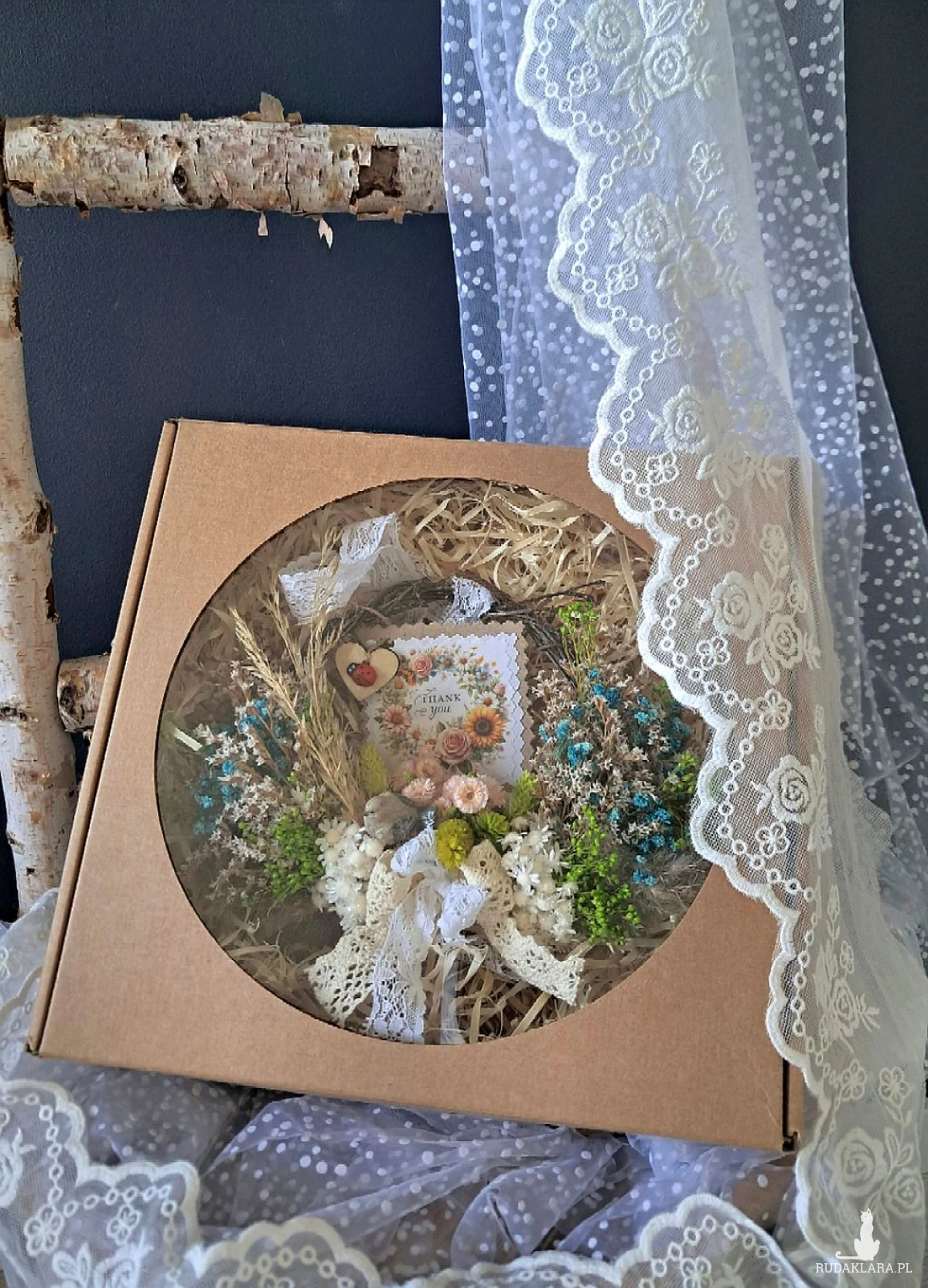 Mam do sprzedania własnoręcznie wykonany wianek na podłożu z witek brzozowych, udekorowany suszonymi roślinami: gliksja, kocanka włoska, żarnowiec stabilizowany, gipsówka, zatrwian tatarski. Ponadto dodano ptaszka z żywicy syntetycznej oraz bawełniane koronki w różnych kolorach. Zapakowany w pudełko z okienkiem o wymiarach 27x27 cm. Doskonały pomysł na prezent, jako forma wdzięczności, cieszący oczy i serce przez długi czas.