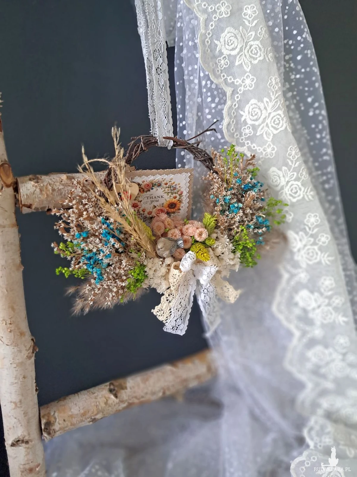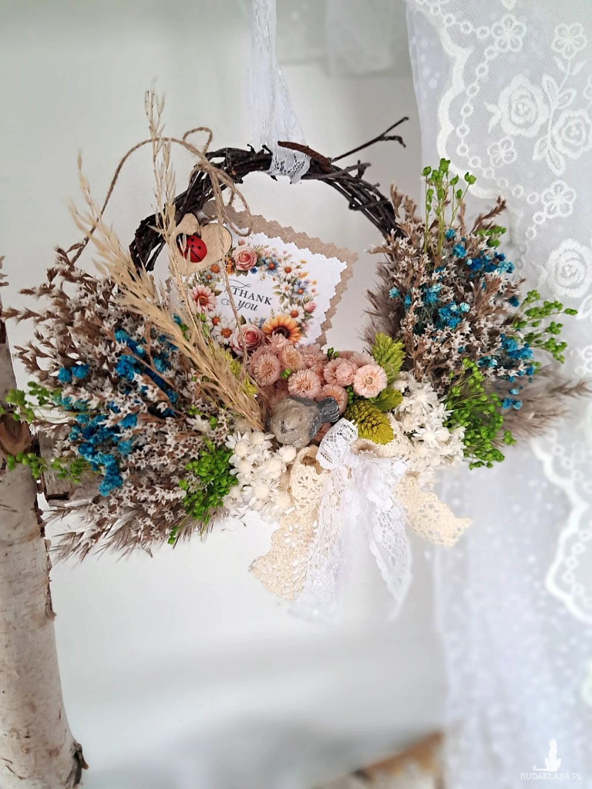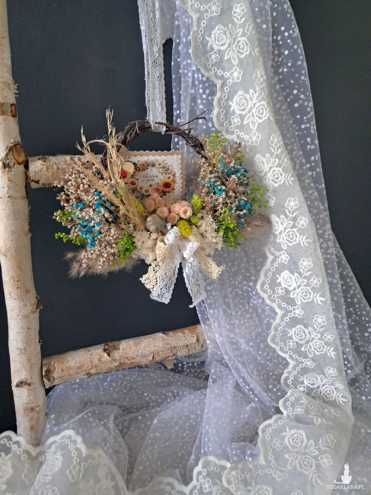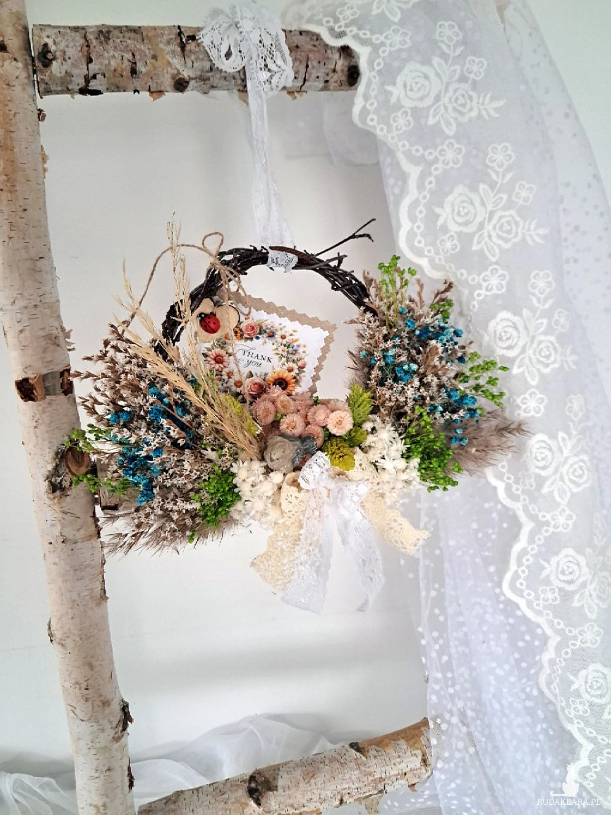 Mam do sprzedania własnoręcznie wykonany wianek na podłożu z witek brzozowych, udekorowany suszonymi roślinami: gliksja, kocanka włoska, żarnowiec stabilizowany, gipsówka, zatrwian tatarski. Ponadto dodano ptaszka z żywicy syntetycznej oraz bawełniane koronki w różnych kolorach. Zapakowany w pudełko z okienkiem o wymiarach 27x27 cm. Doskonały pomysł na prezent, jako forma wdzięczności, cieszący oczy i serce przez długi czas.