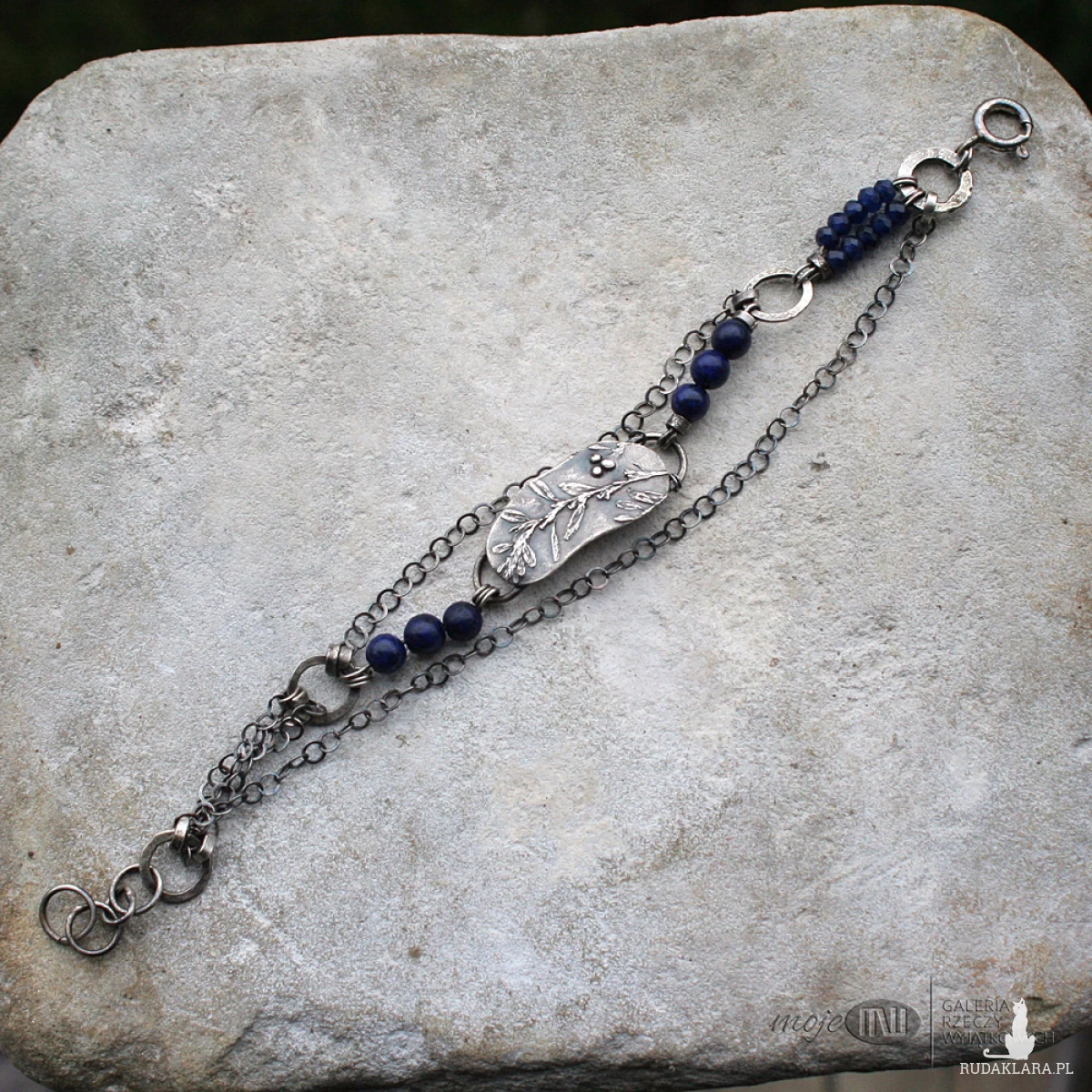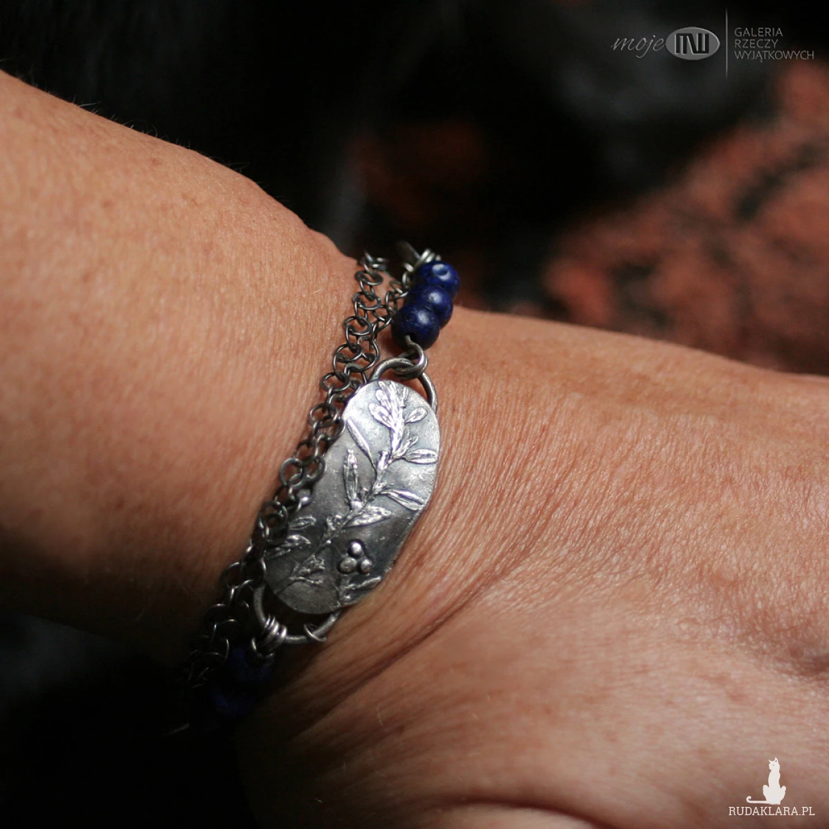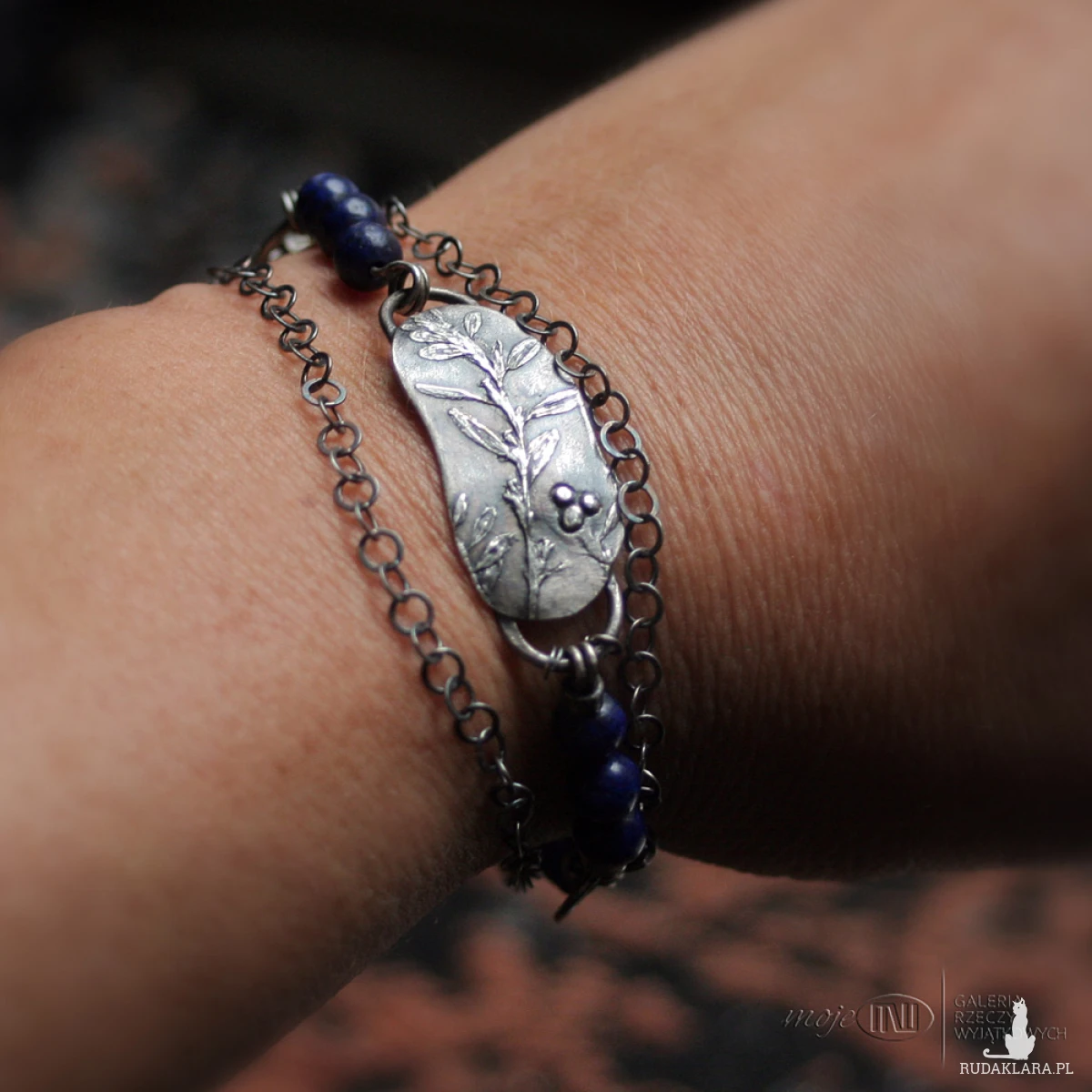 Bransoletka ze srebra i lapis lazuli. Ręcznie formowany element ze srebra wysokiej próby z bardzo realistycznym wizerunkiem polnej roślinki. Srebro jest oksydowane i przecierane dla wydobycia rysunku. Ozdobą są granatowe korale lapis lazuli - większe gładkie 5 mm i mniejsze fasetowane 3 mm. Całości dopełniają większe koła i drobniejszy łańcuszek.