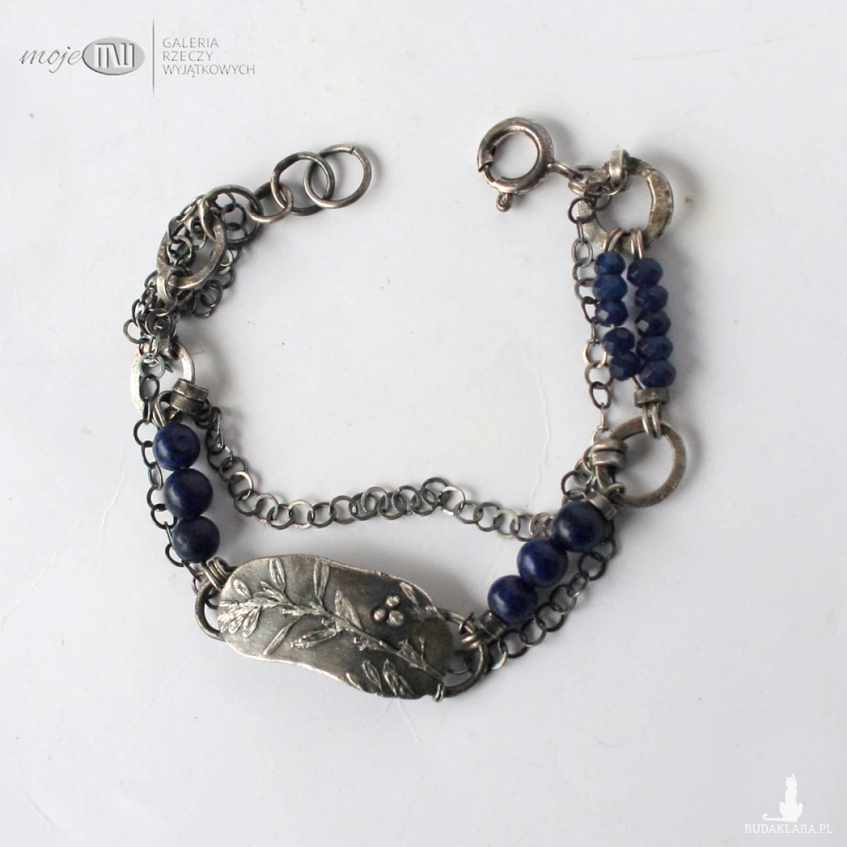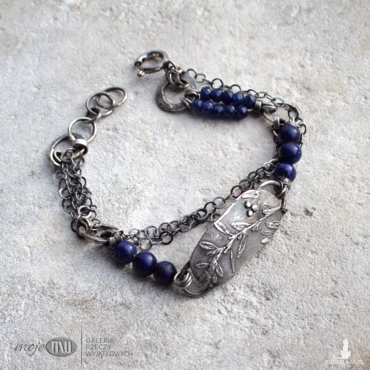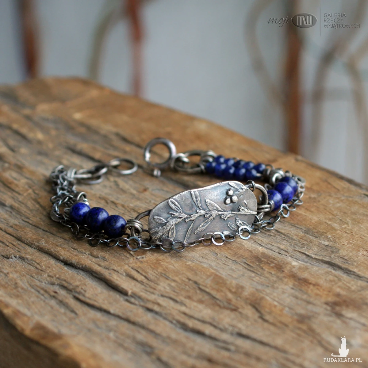 Bransoletka ze srebra i lapis lazuli. Ręcznie formowany element ze srebra wysokiej próby z bardzo realistycznym wizerunkiem polnej roślinki. Srebro jest oksydowane i przecierane dla wydobycia rysunku. Ozdobą są granatowe korale lapis lazuli - większe gładkie 5 mm i mniejsze fasetowane 3 mm. Całości dopełniają większe koła i drobniejszy łańcuszek.