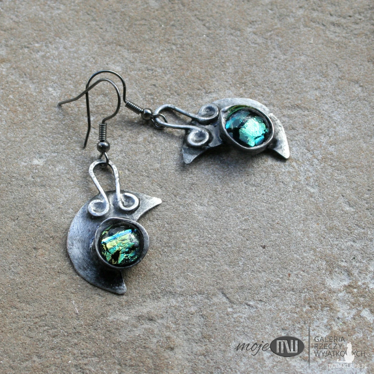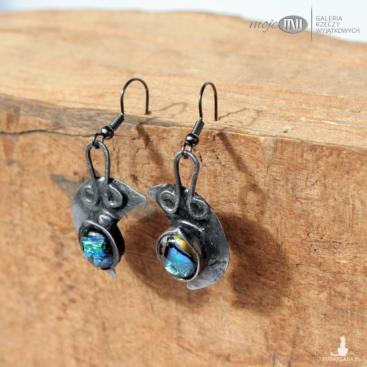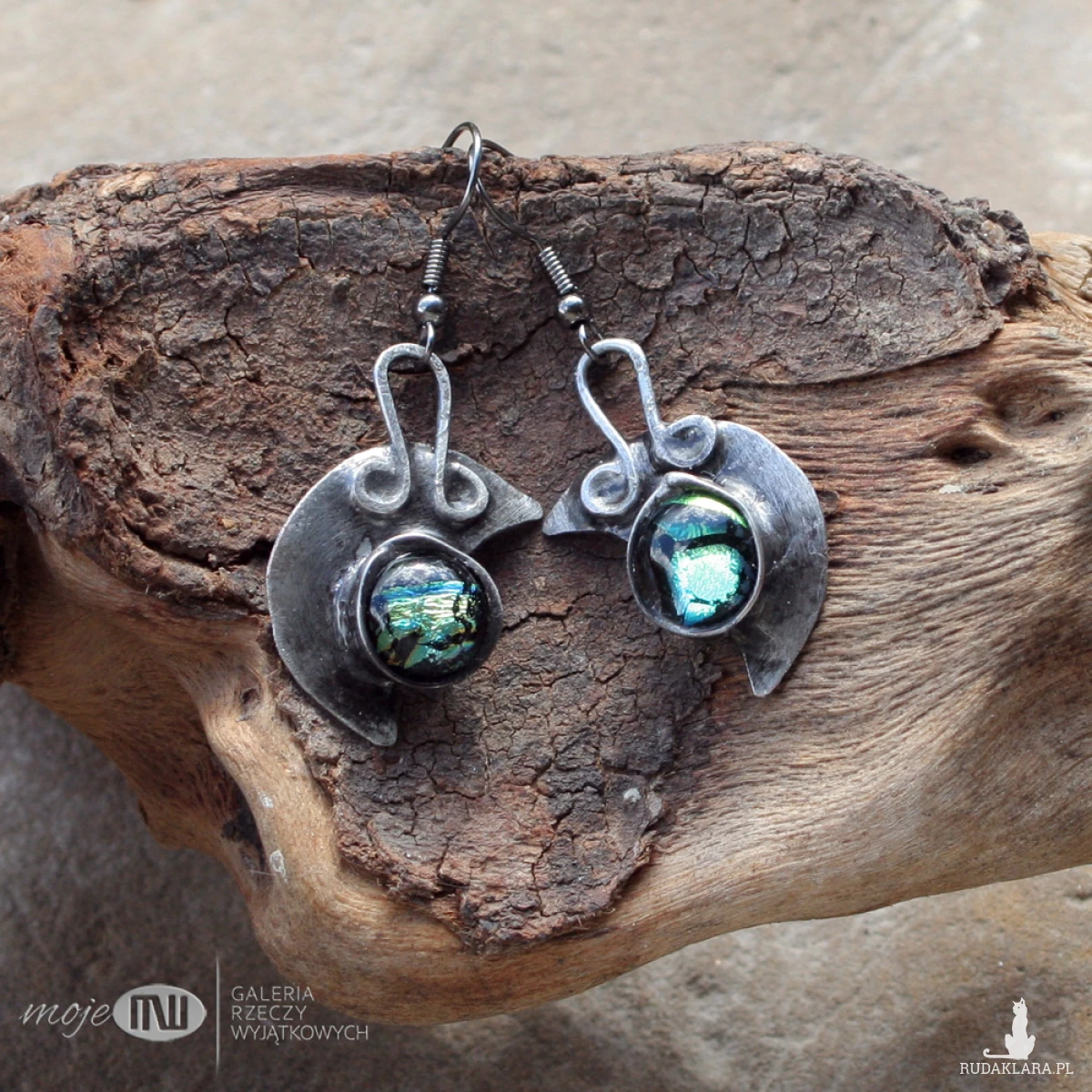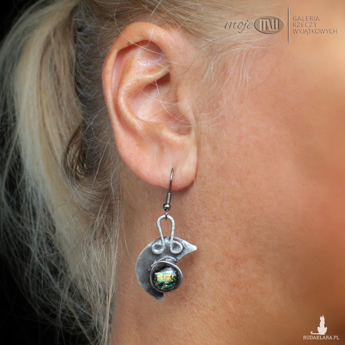Kolczyki z motywem lunuli - księżyca. Zrobiłam je z miedzi pokrytej cyną, patynowanej i przecieranej. Zdobią je kaboszony, które wytopiłam ze szkła dichroicznego, które pięknie opalizuje w słonecznych promieniach. Zawieszone na metalowych biglach w kolorze grafitowym.