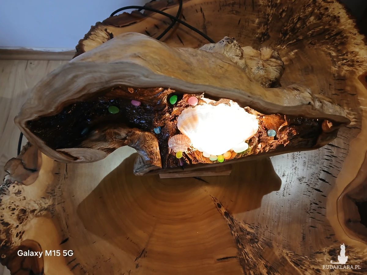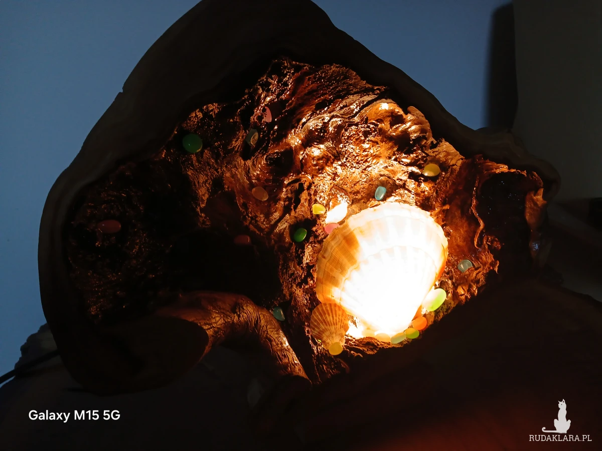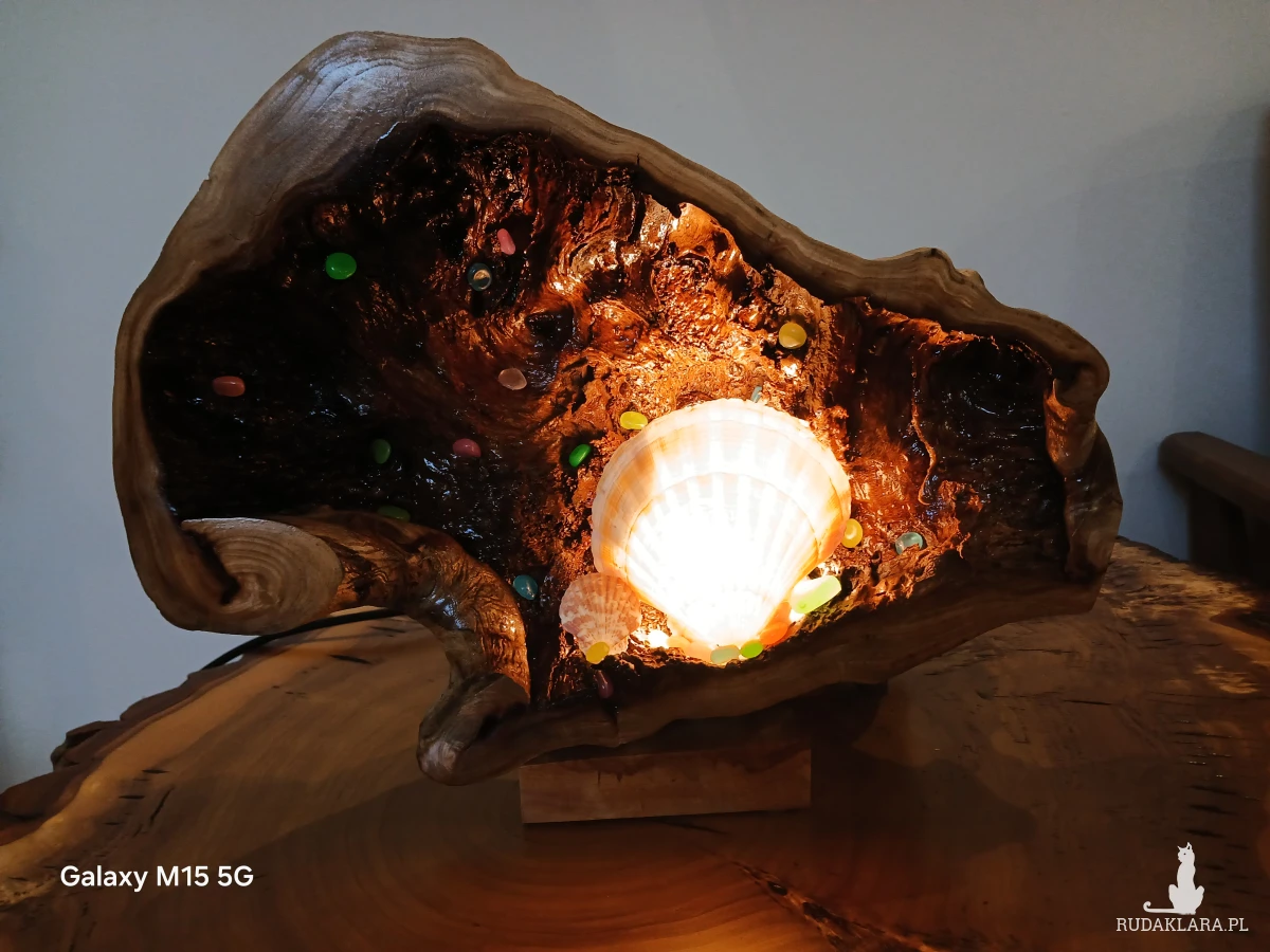 Ta wyjątkowa lampa to połączenie naturalnego drewna i muszli, tworzące niepowtarzalny element dekoracyjny. Starannie wycięte i wypolerowane drewno eksponuje piękne słoje, a umieszczona w centrum muszla pełni funkcję klosza, emitując ciepłe i przytulne światło. Dodatkowe ozdobne kamyki dodają jej charakteru.