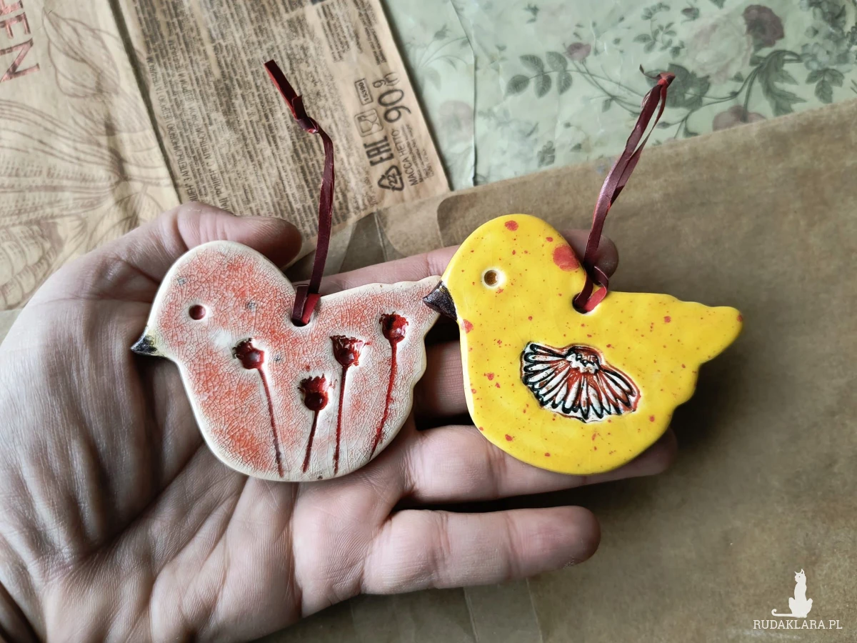 Zestaw złożony z 2 ptasząt do powieszenia na rarfii. Wykonany z gliny szamotowej, wypalony na biskwit, a następnie szkliwiony w temperaturze 1260 stopni C, o wymiarach ok 4,5 cm x 7 cm. Idealnie sprawdzą się jako prezent okolicznościowy lub ozdoba domu.