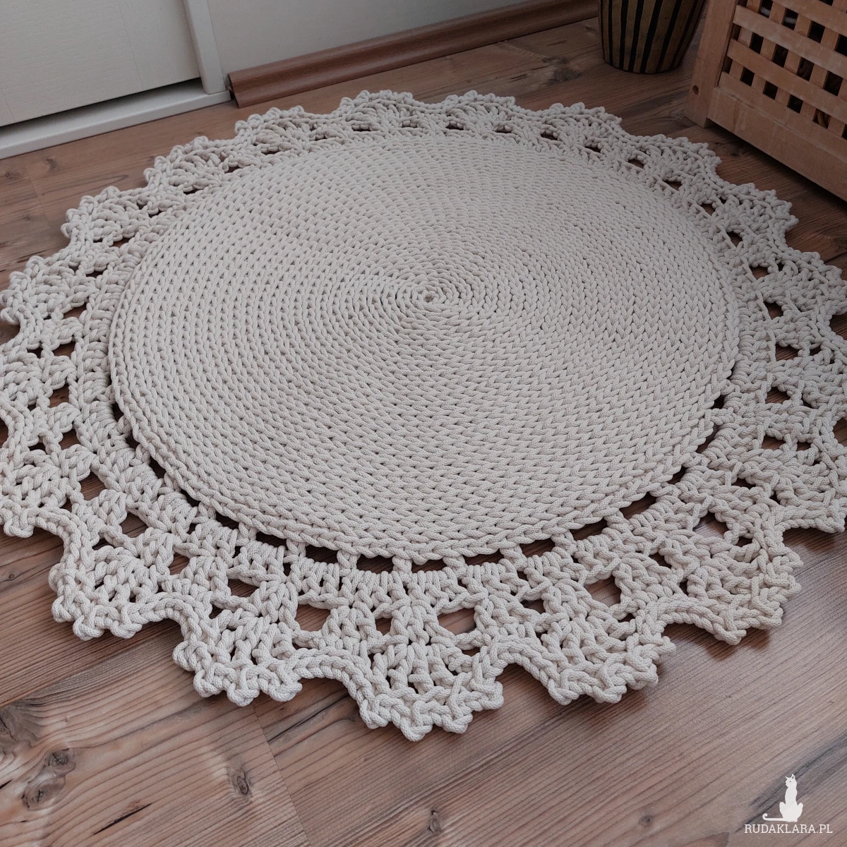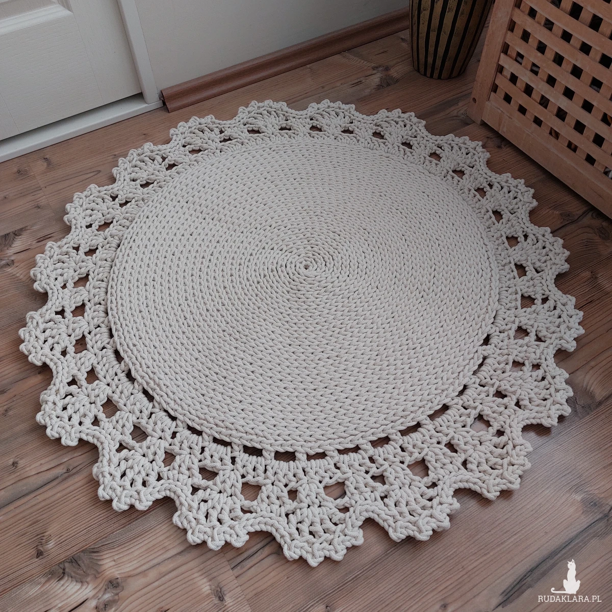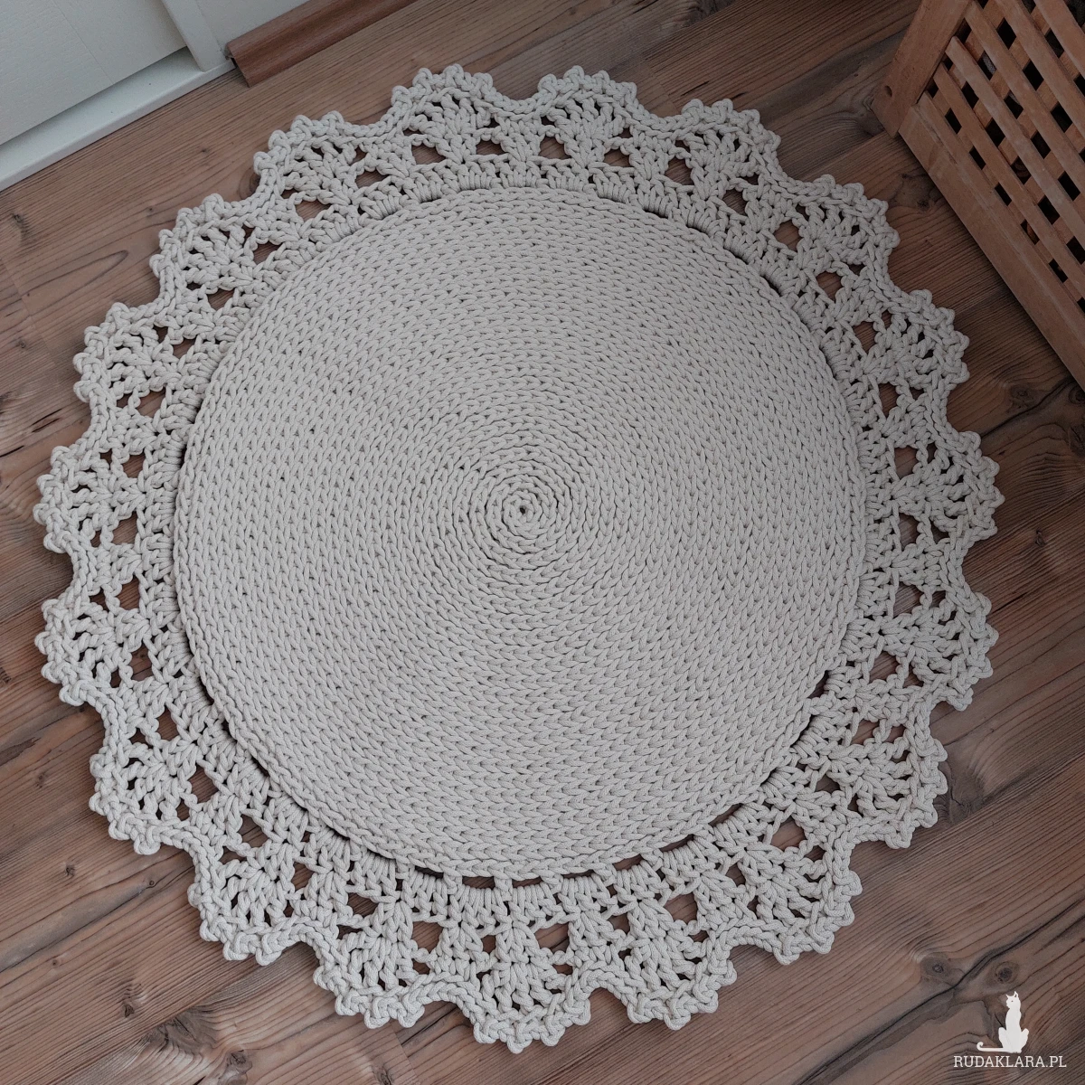 Do sprzedania oferuję własnoręcznie wykonany dywan z koronką o średnicy 90 cm (średnica jest liczona razem z koronką)