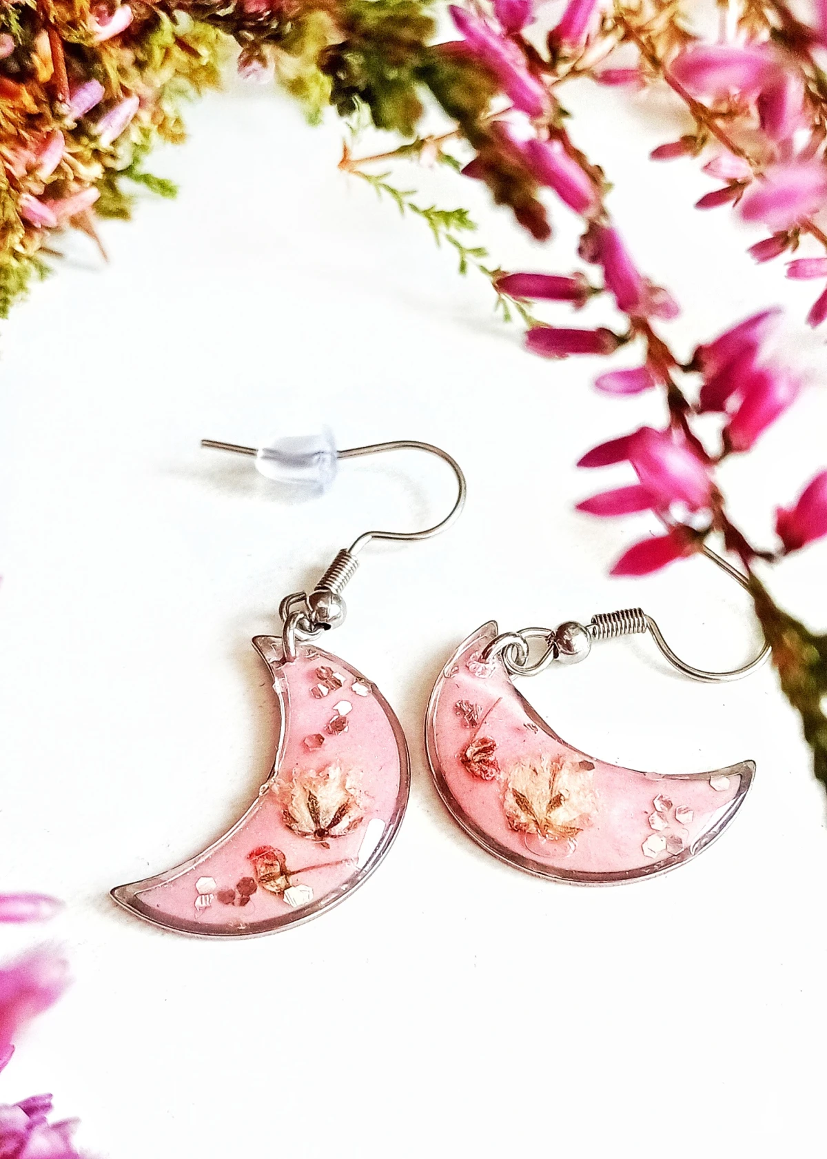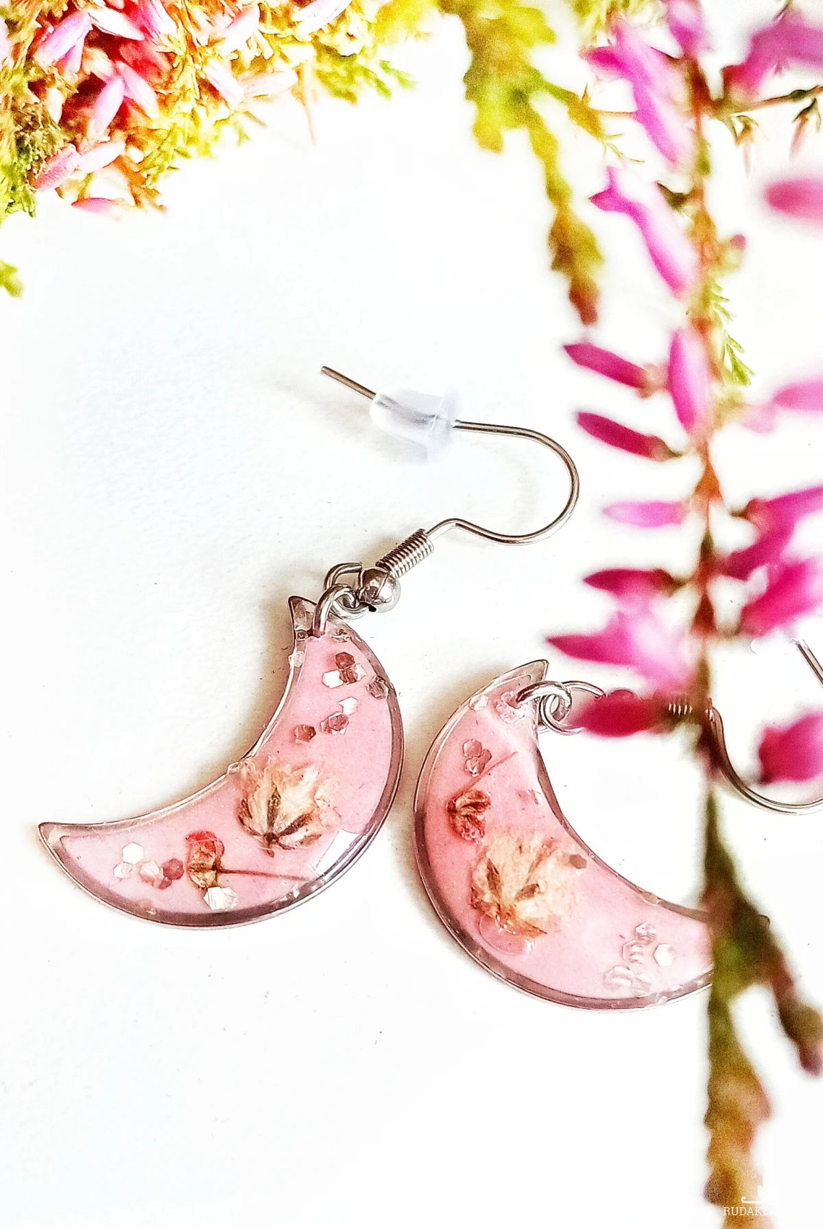 Poznaj moje ręcznie robione kolczyki z żywicy UV, w których zatopiona została różowa gipsówka oraz drobinki w kolorze srebrnym – to połączenie, które oczarowuje lekkością i naturalnym pięknem.