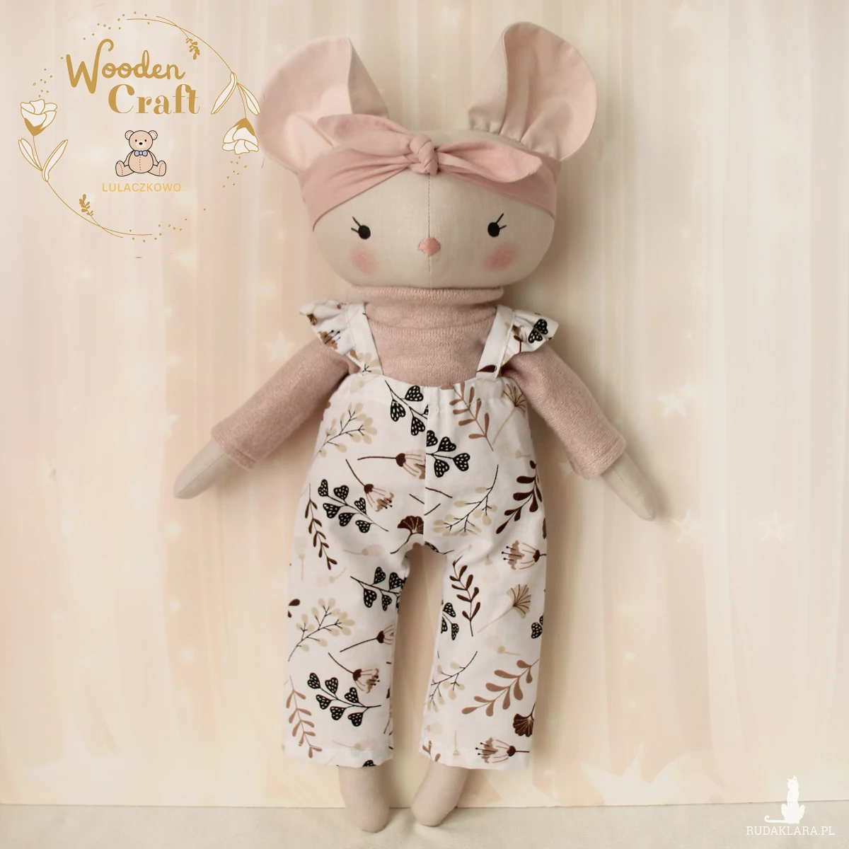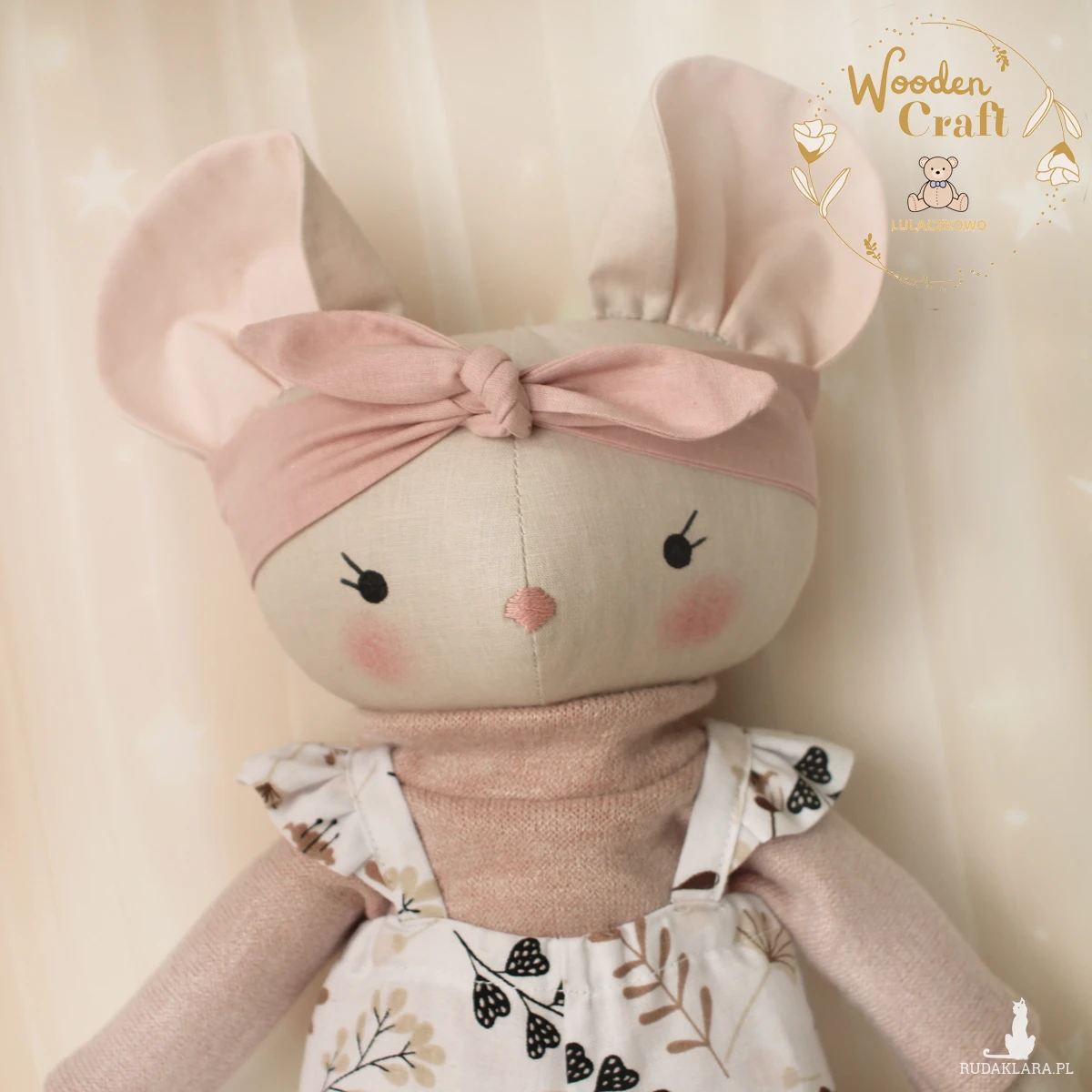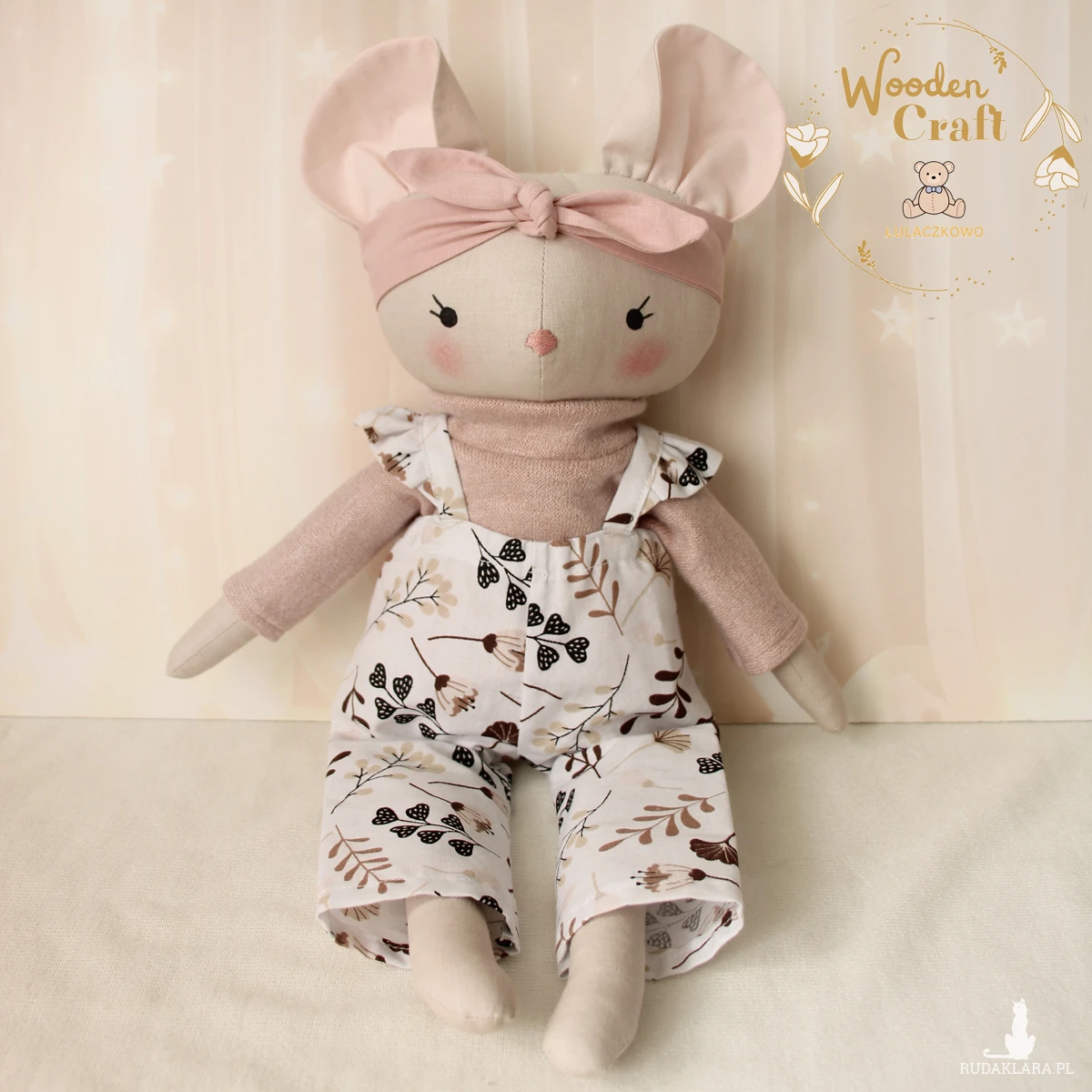 Przeurocza przytulanka, kremowa myszka, uszyta ręcznie z najwyższą starannością, ubrana w różowy sweterek, spodenki z falbankami oraz opaskę z kokardką. Wykonana ze 100% bawełny, wypełniona antyalergiczną kulką silikonową. Oczka malowane wodoodpornym markerem, nosek wyszyty muliną. Spodenki, sweterek i opaskę można swobodnie zdejmować, posiadają gumeczki. Górne i dolne łapki układają się luźno, myszka siedzi z podparciem.