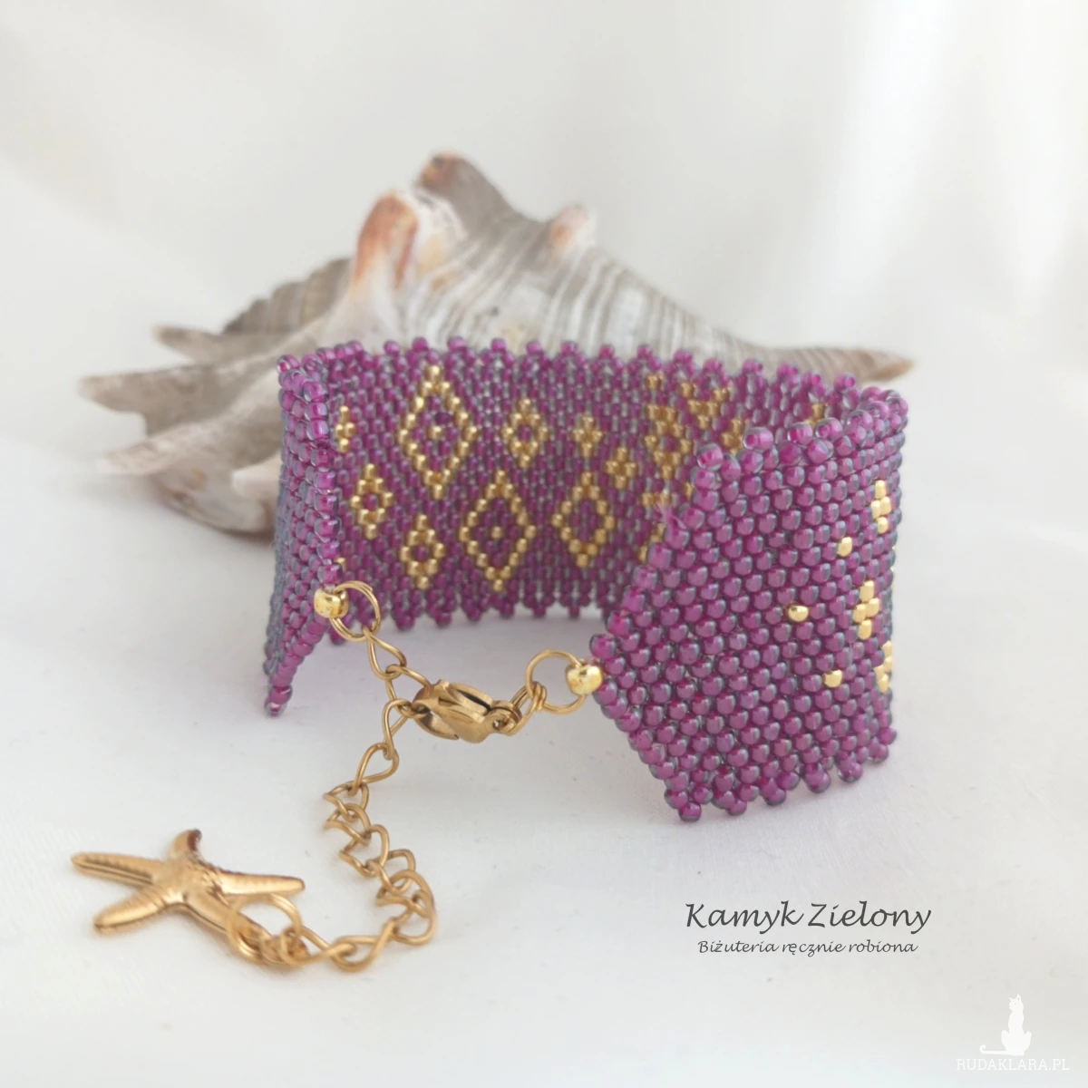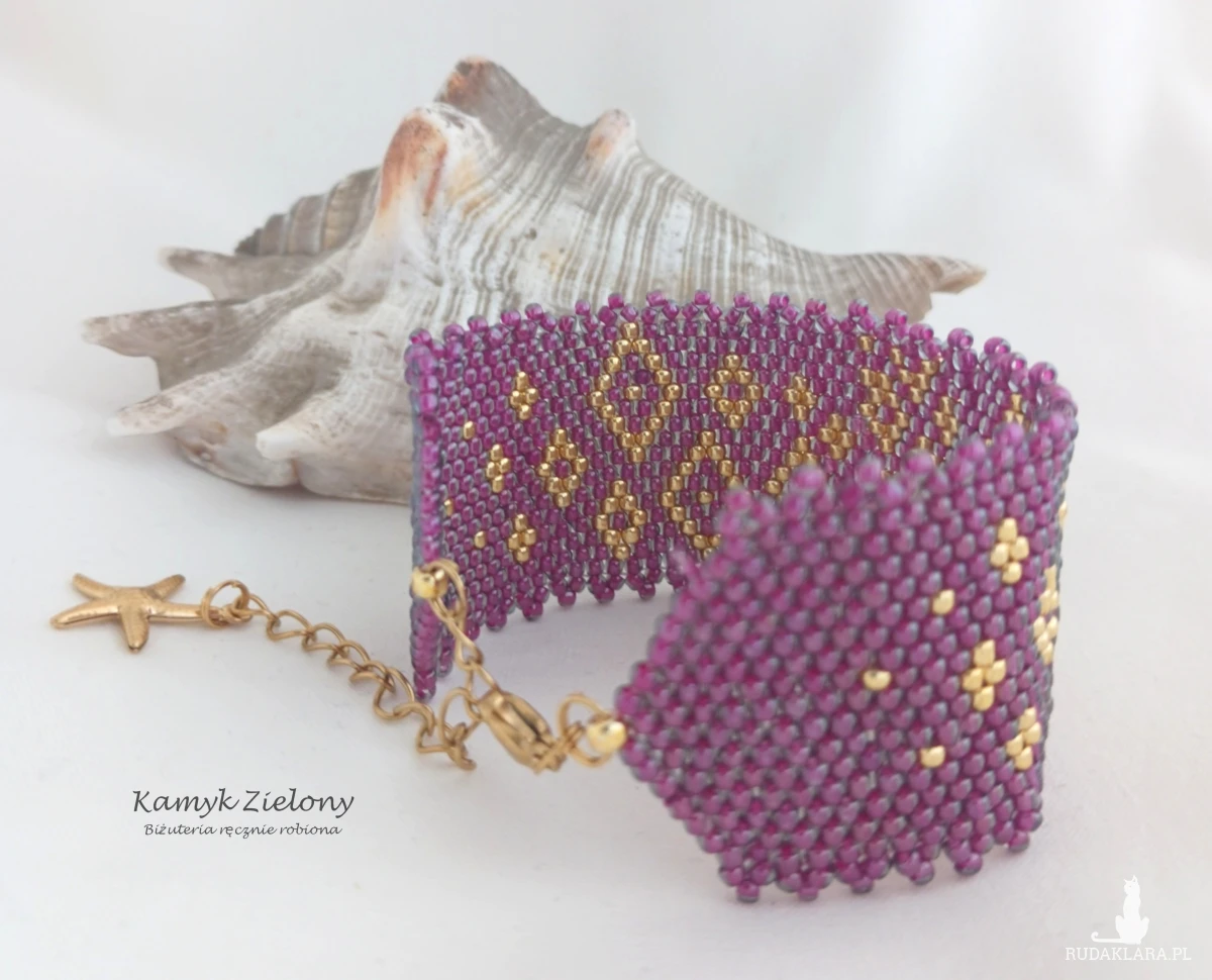 Szeroka bransoletka mankietowa uszyta została ręcznie z wysokiej jakości koralików szklanych. Do jej zrobienia użyto japońskich koralików Toho w kolorze fioletowym oraz złotym.