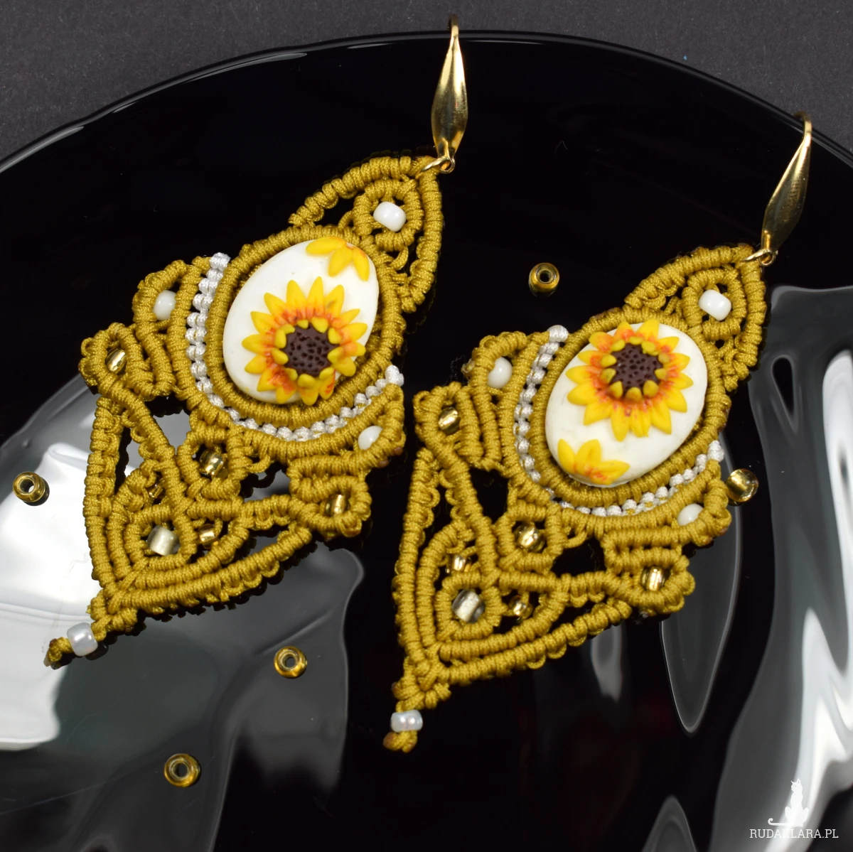 dopełniają drobne, szklane koraliki w złotych i białych tonacjach, które