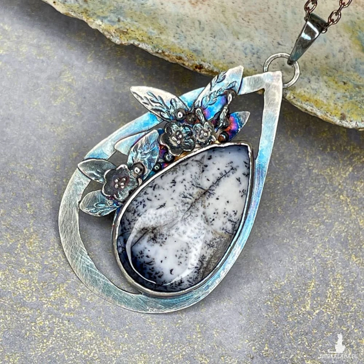 Agat został oprawiony w srebro próby 925, ręcznie formowane i zdobione roślinnymi detalami. Oksydowanie i przecieranie srebra wydobywa każdy detal oprawy, dodając jej głębi i tęczowych blasków. Całość tworzy pełen wdzięku, lekko baśniowy naszyjnik – idealny dla kobiet, które cenią delikatność, naturę i unikatowy styl.