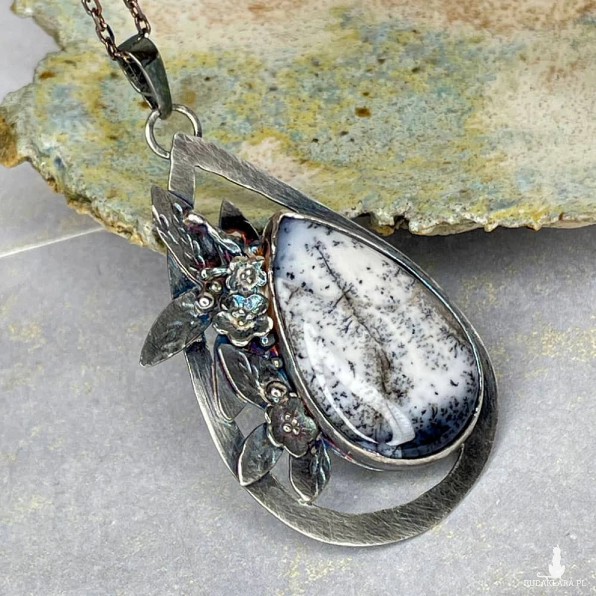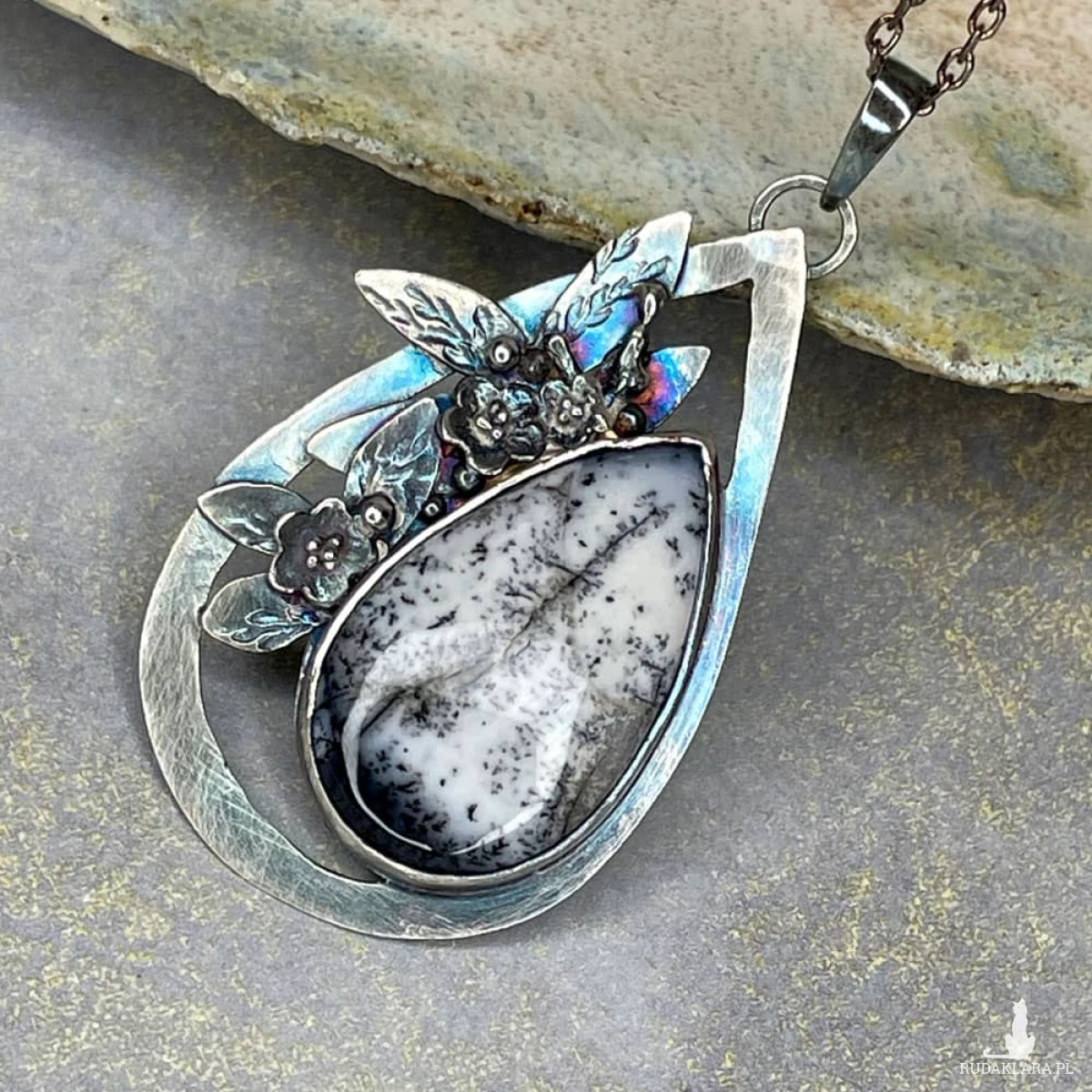 Ten wyjątkowy naszyjnik z agatem dendrytowym przenosi myśli w świat zimowych poranków, kiedy delikatny szron rysuje na szybach misterne wzory. Kamień, będący sercem tej biżuterii, zachwyca niepowtarzalnym, naturalnym rysunkiem przypominającym drobne gałązki czy korzenie – jakby natura sama zostawiła w nim swój mroźny oddech.