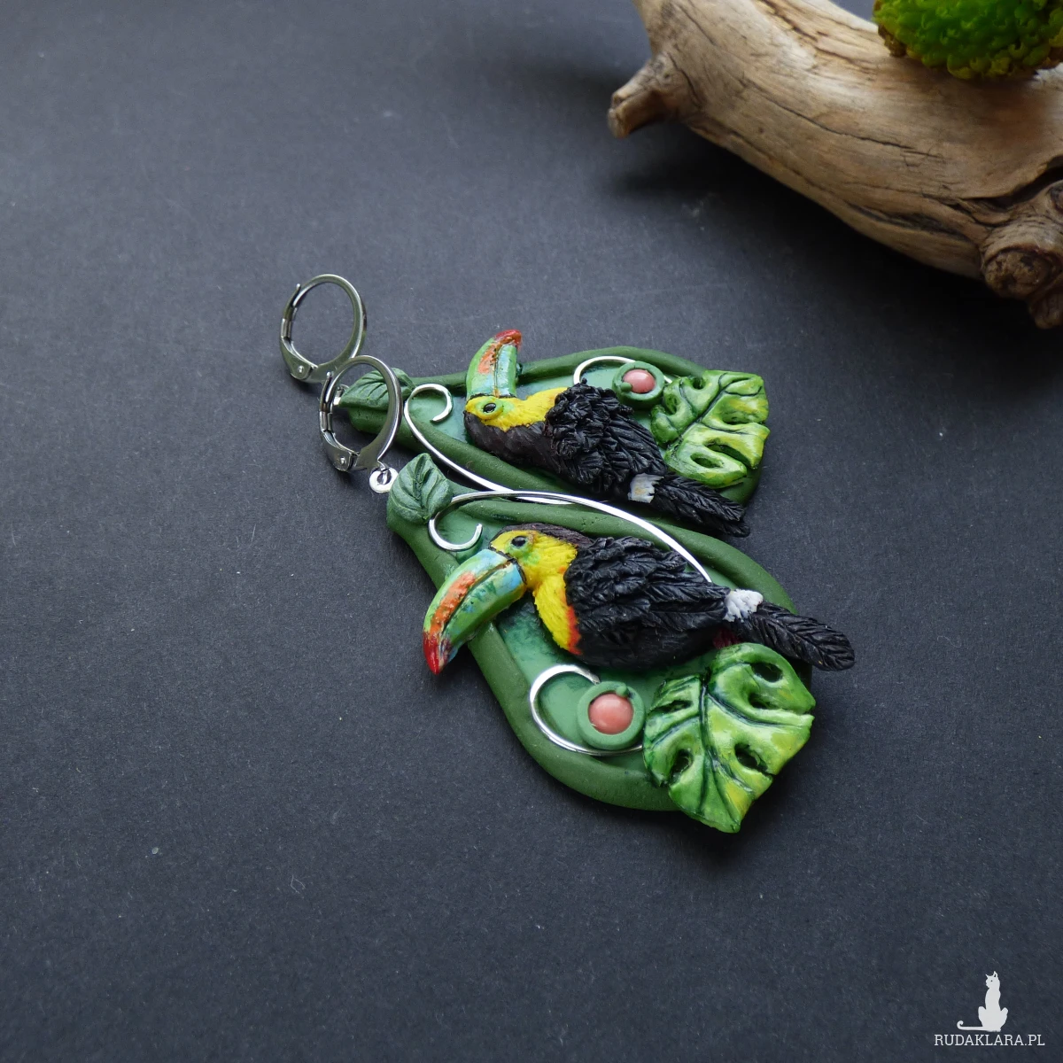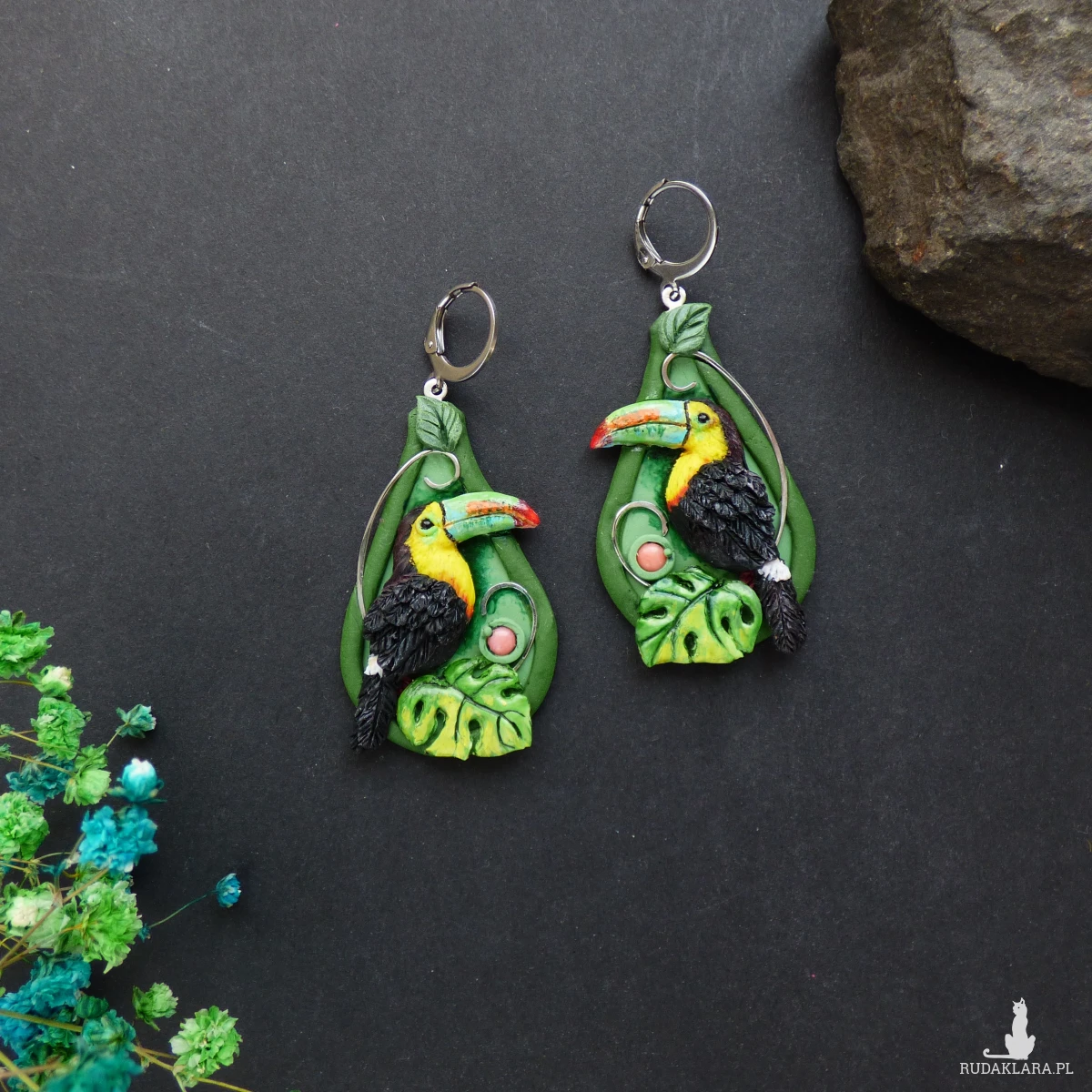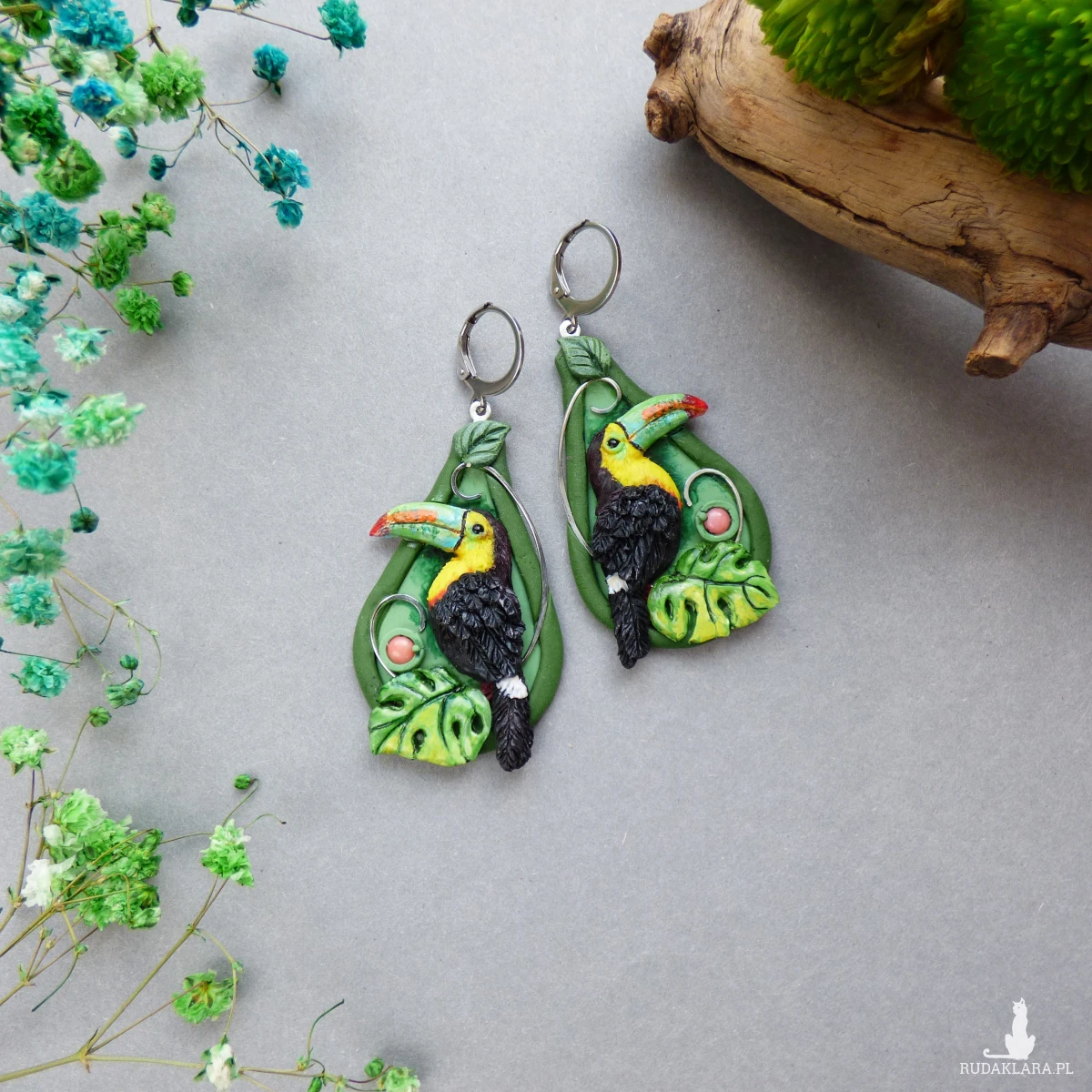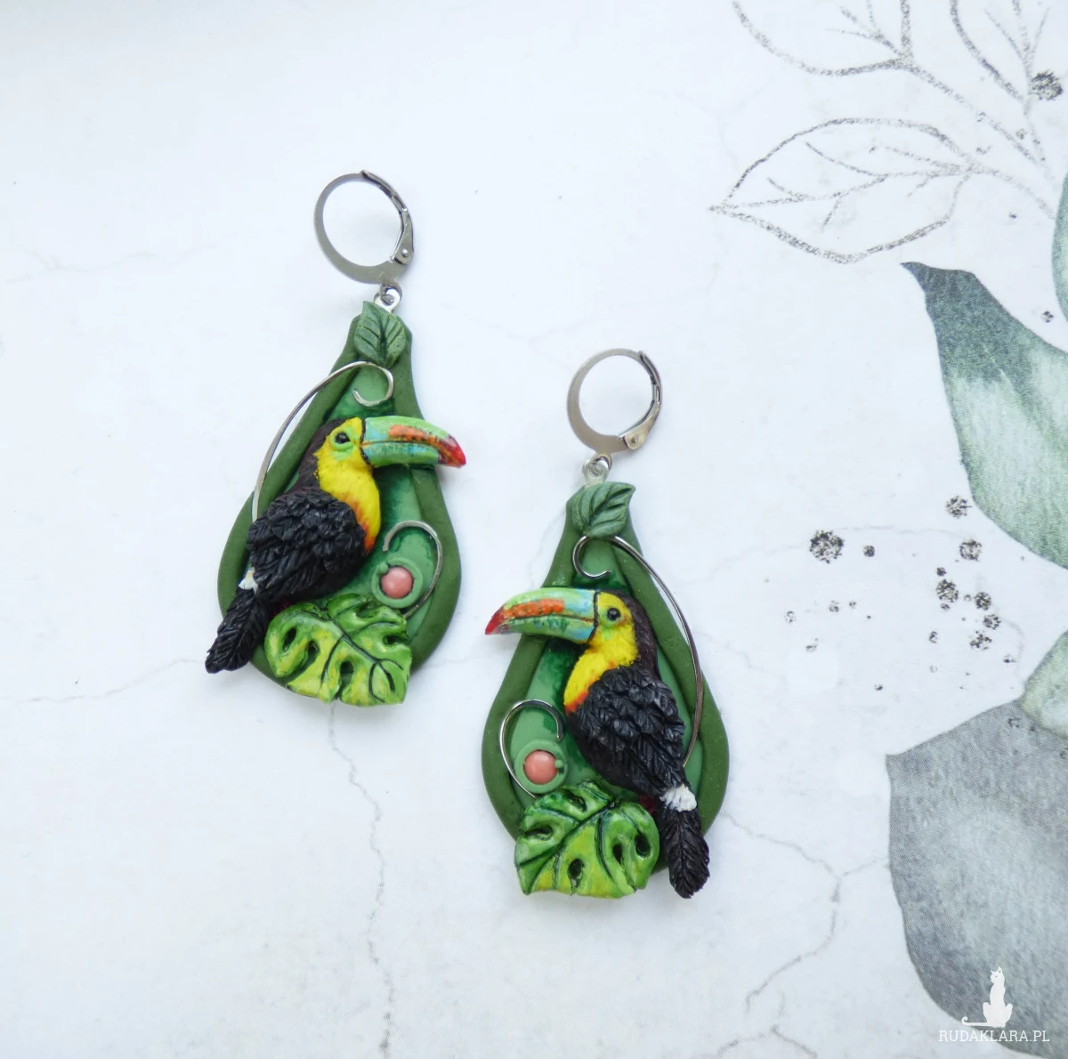 Kolczyki inspirowane egzotycznym pięknem tropikalnych lasów – przedstawiają ręcznie wyrzeźbione tukany, otoczone liśćmi monstery i zielenią. Każdy szczegół został wykonany z dbałością o detale – od faktury piór po barwny dziób ptaka.