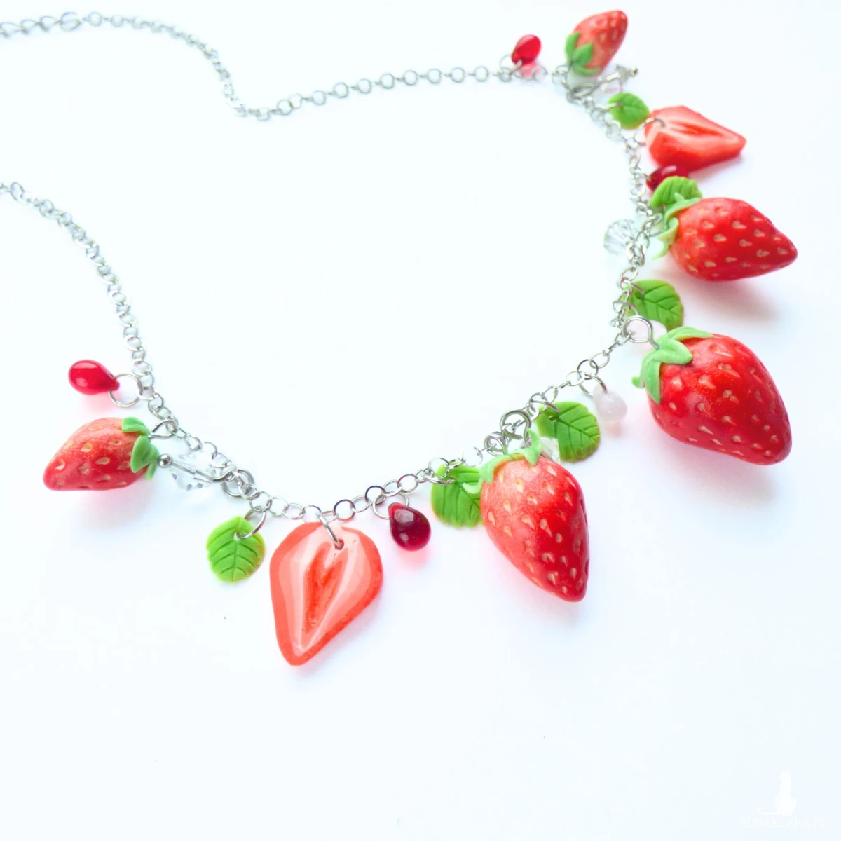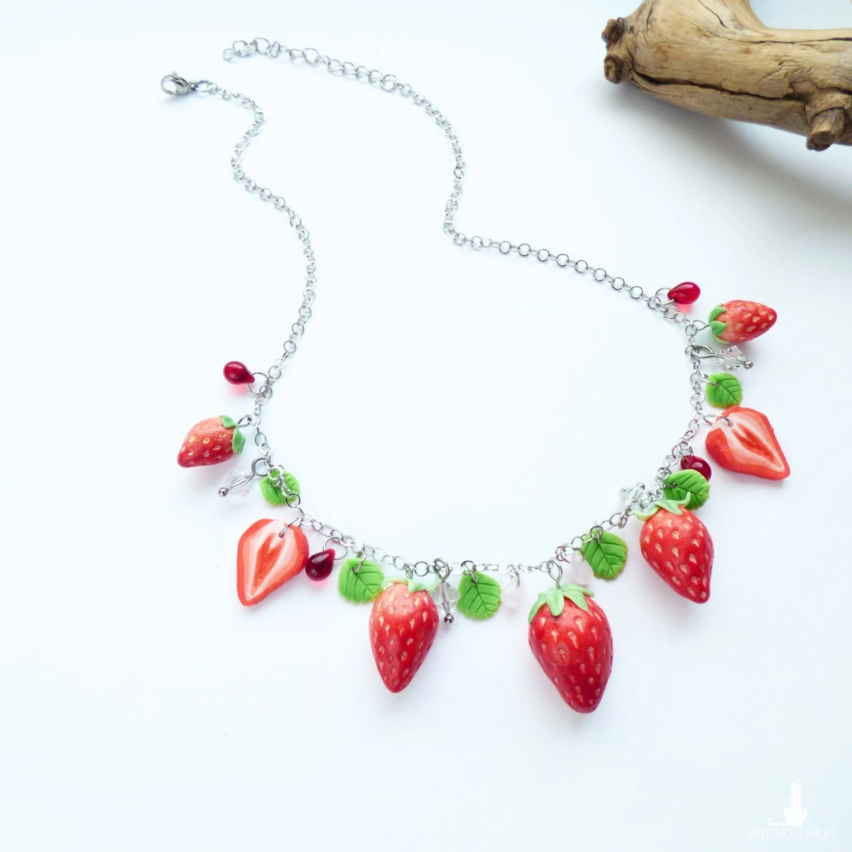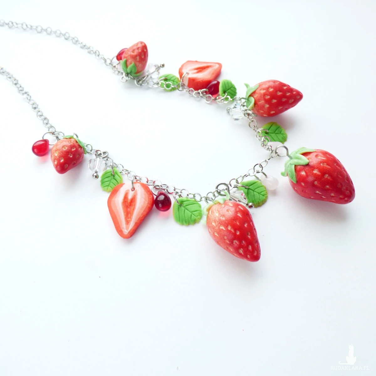 Soczysta biżuteria z glinki polimerowej. Apetyczny, letni naszyjnik ozdobiony ręcznie wyrzeźbionymi truskawkami i ich plasterkami, listkami oraz szklanymi koralikami. To lekka, radosna biżuteria, która od razu przywołuje smak słonecznego dnia i zapach świeżych owoców.