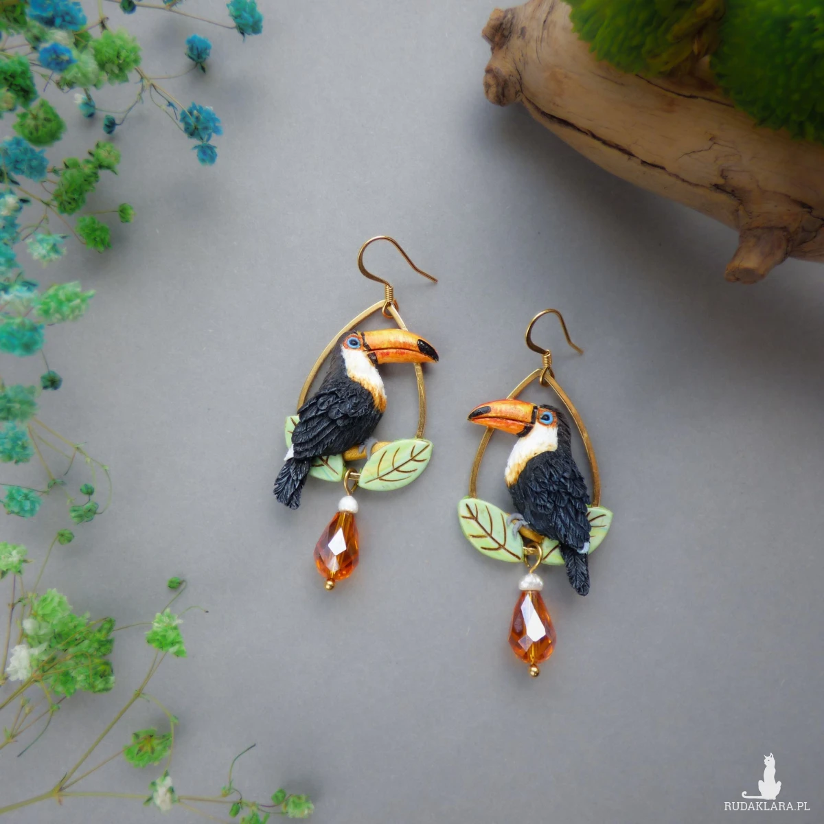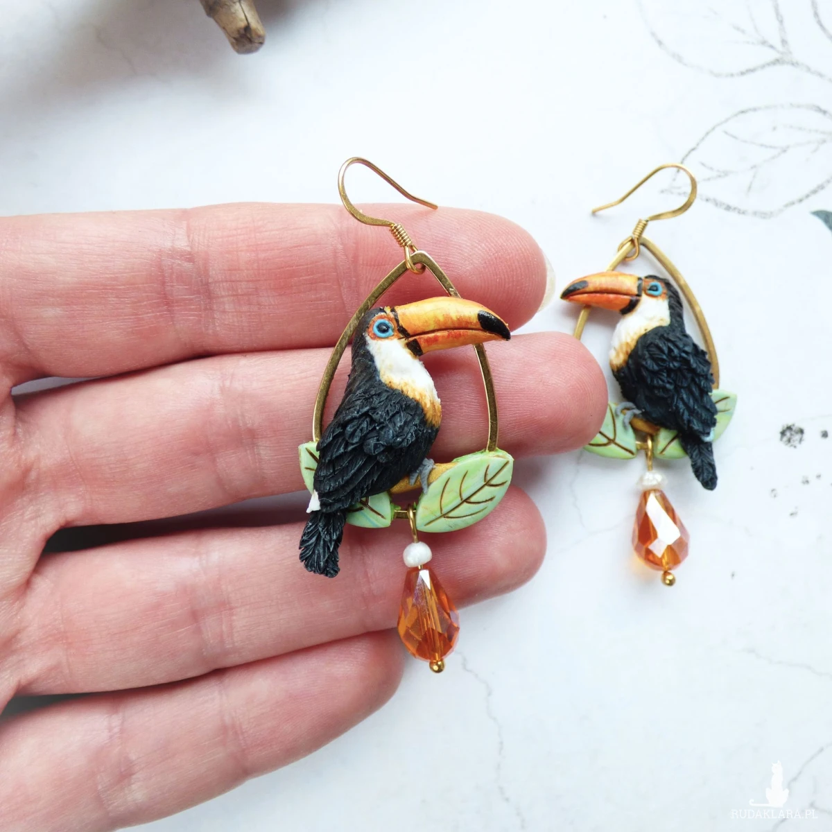 Biżuteria z odrobiną tropikalnej magii! Te wyjątkowe kolczyki przedstawiają egzotyczne ptaki, jakimi są tukany siedzące wśród liści. Kolczyki wykończyłam elegancką kroplą pomarańczowego kryształka i naturalną perłą. Biżuteria łączy w sobie radość egzotyki z nutą wyrafinowania – idealna zarówno na wakacyjne wyjazdy, jak i barwny dodatek do pracy.