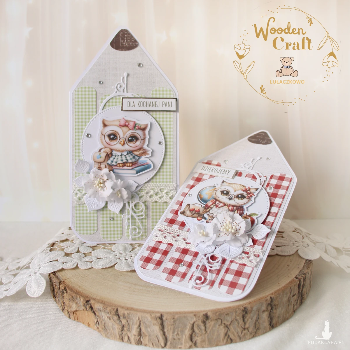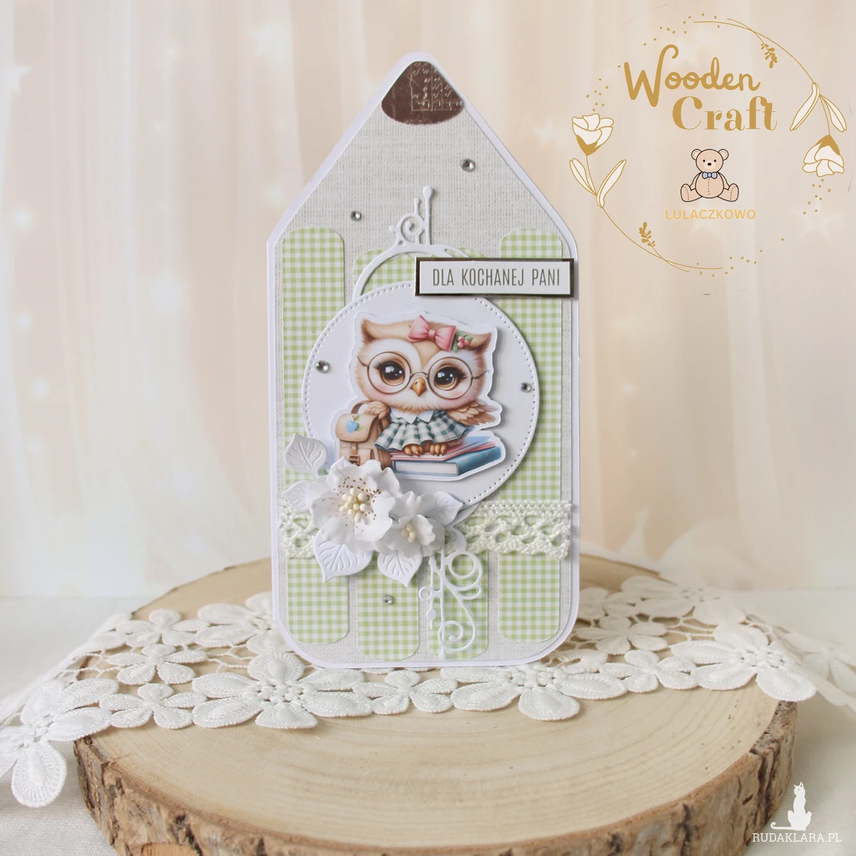 Przepiękna, ręcznie robiona kartka w kształcie kredki, jako podziękowanie na zakończenie roku szkolnego dla nauczyciela lub wychowawcy. Kartka z motywem uroczej sowy z torbą i książkami, ozdobiona koronką, ażurowym dekorem, kryształkami oraz ręcznie robionymi, materiałowymi kwiatami, a także napisem "Dla Kochanej Pani" (na życzenie mogę zmienić napis na dowolny). Kartka w odcieniach przepięknej jasnej zieleni i beżu, otwierana, w środku jest pusta, z miejscem na podpisy uczniów i życzenia (istnieje możliwość personalizacji, wklejenia imienia nauczycielki, wychowawczyni oraz własnej dedykacji/życzeń), w tym celu proszę o kontakt.