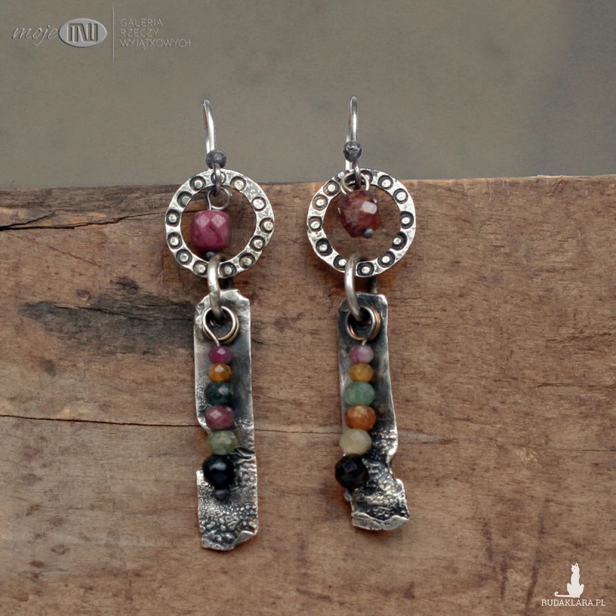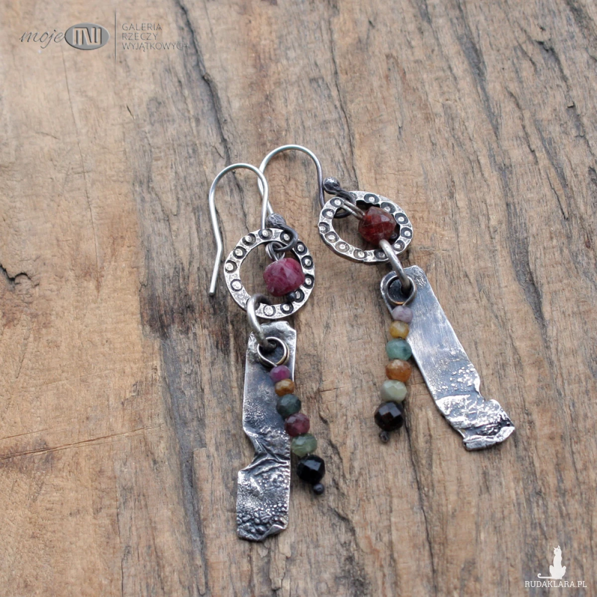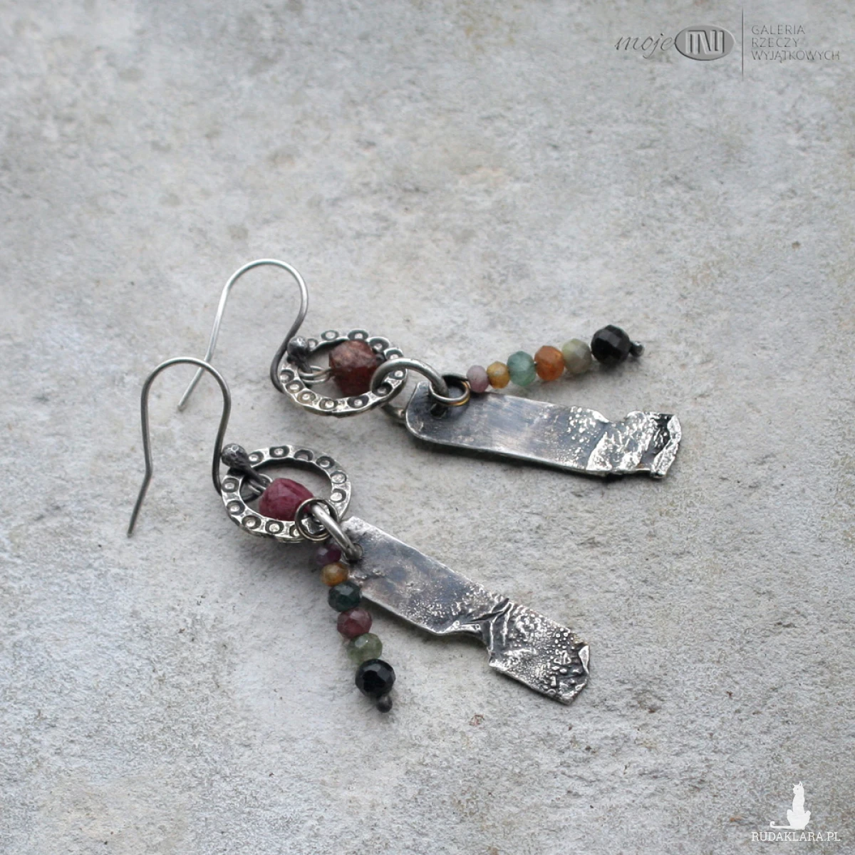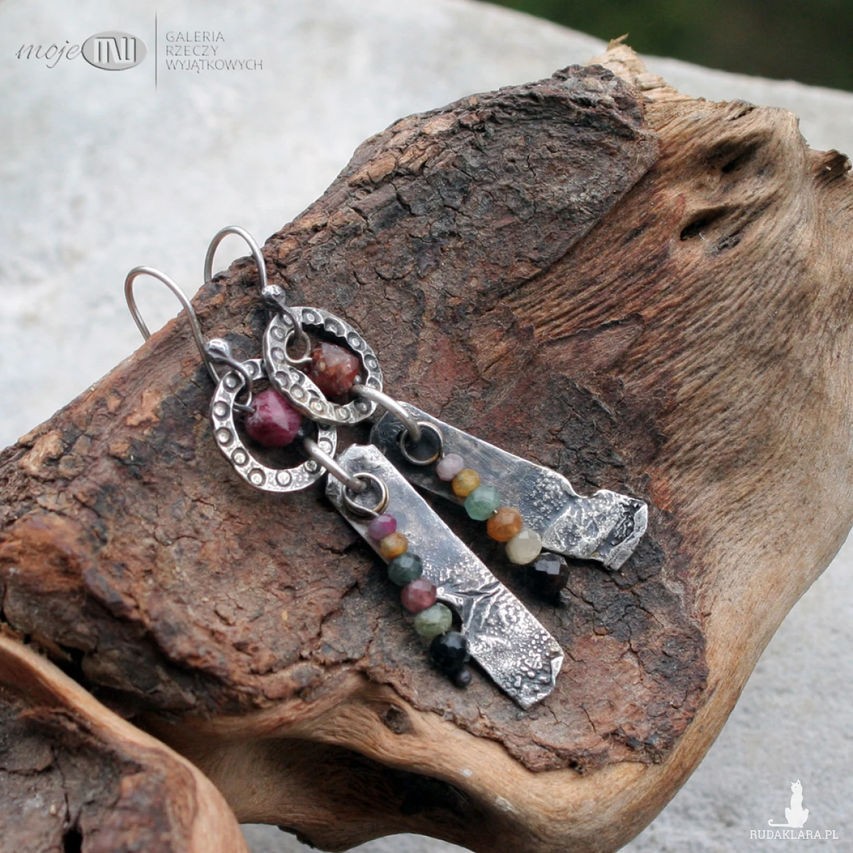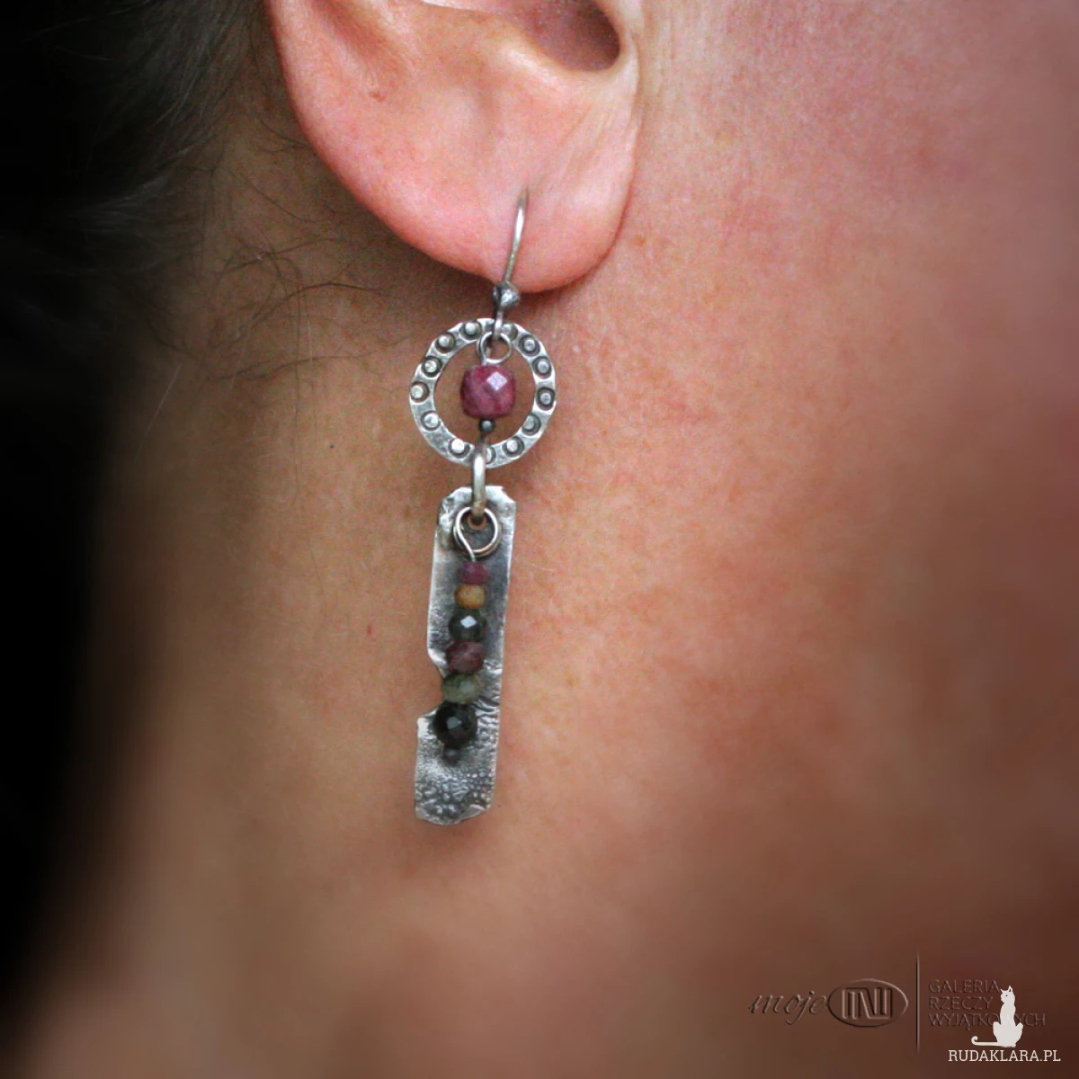 Kolczyki ze srebra, turmalinu i szafiru z rubinem. Ręcznie kształtowane srebro, delikatnie oksydowane i przetarte dla wydobycia faktury. Centralnie wisi fasetowana oponka szafiru z rubinem. Proste bigle ze srebrnego drutu.