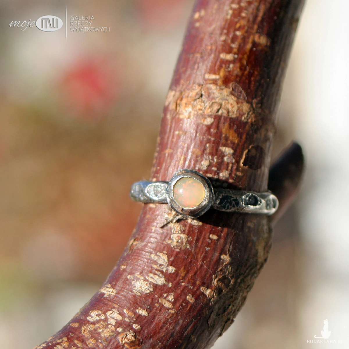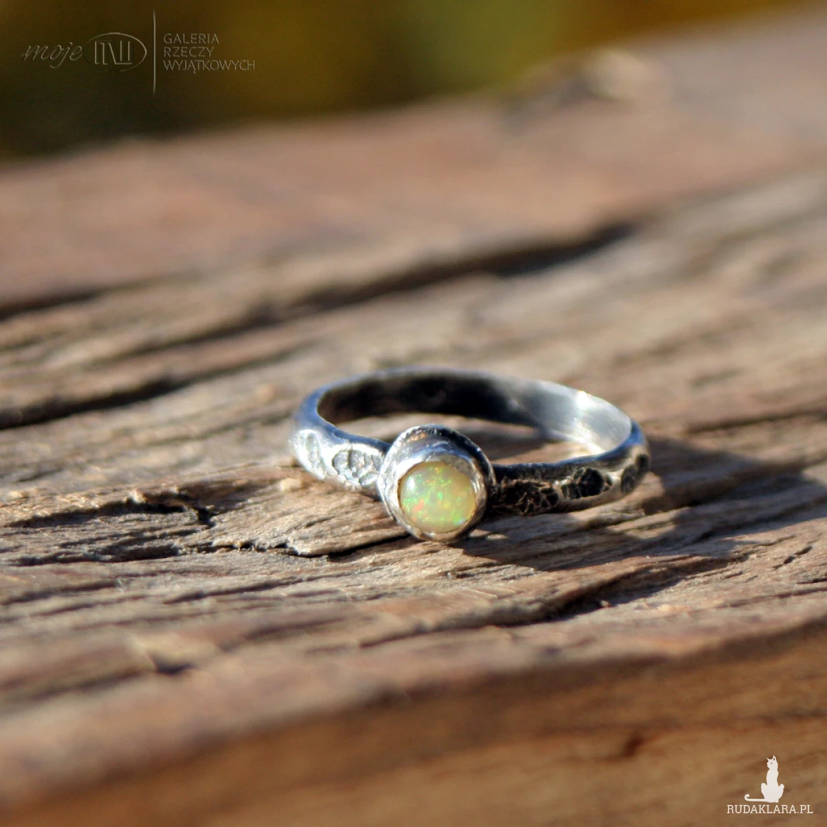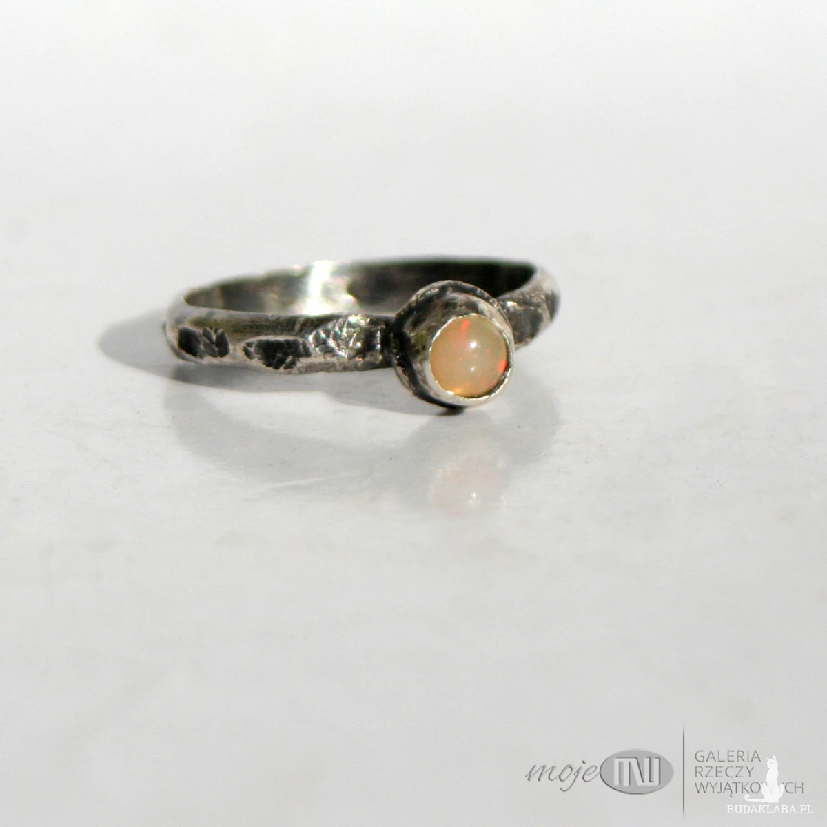 Delikatny pierścionek z ręcznie formowanego i kutego srebra oraz małego opalu.Na obrączce jest motyw drobnych wzorków z listków. Drobny pierścionek dla lubiących niewielką biżuterię.