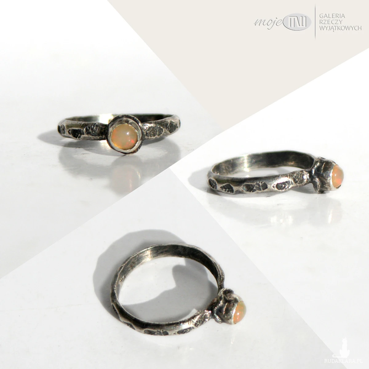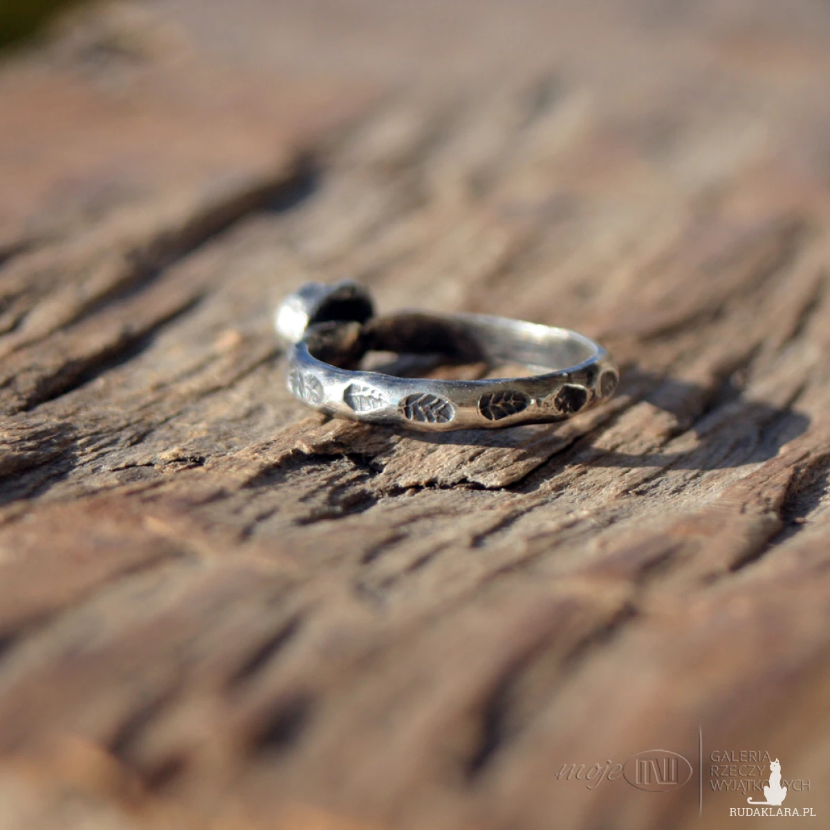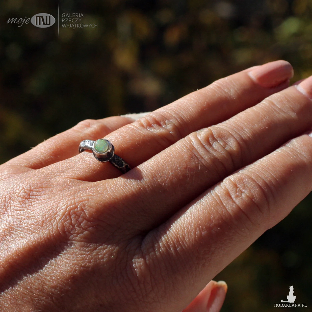 Delikatny pierścionek z ręcznie formowanego i kutego srebra oraz małego opalu.Na obrączce jest motyw drobnych wzorków z listków. Drobny pierścionek dla lubiących niewielką biżuterię.