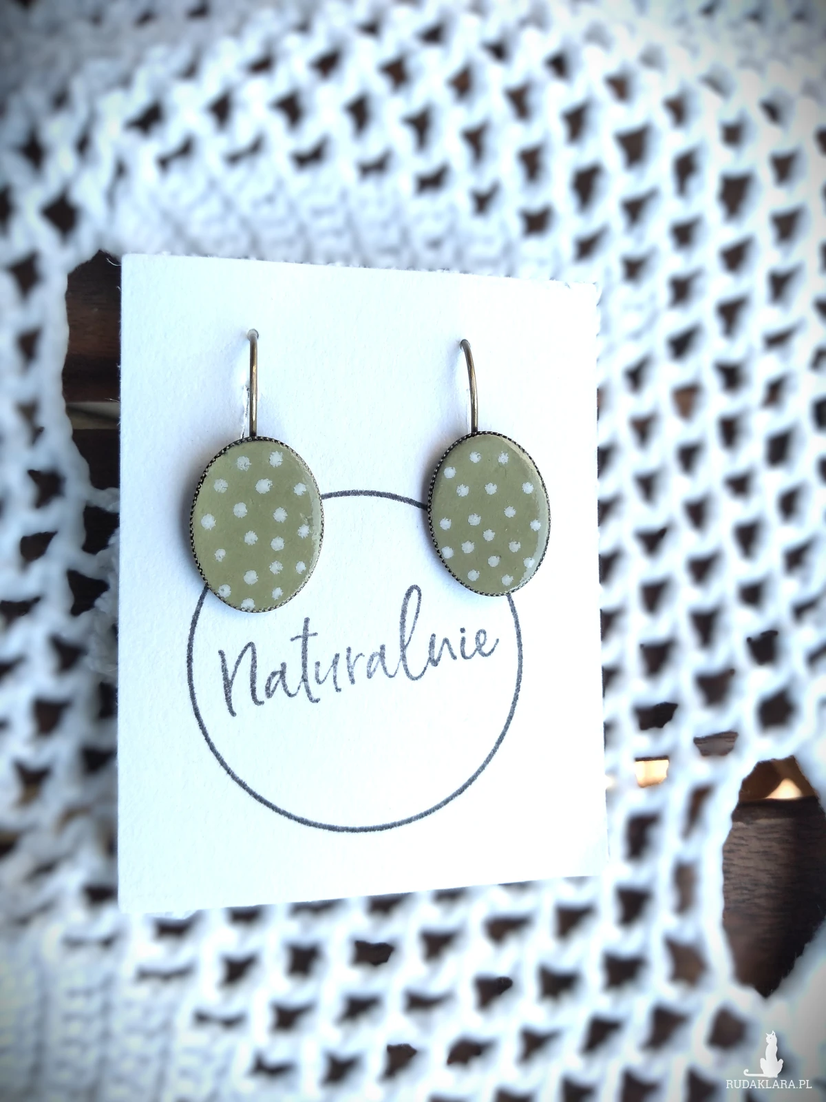 Piękne kolczyki ( bigle angielskie) - pastelowa mięta w białe kropeczki. Długość kolczyka 3 cm. Bigle antyalergiczne, bez niklu i ołowiu.
