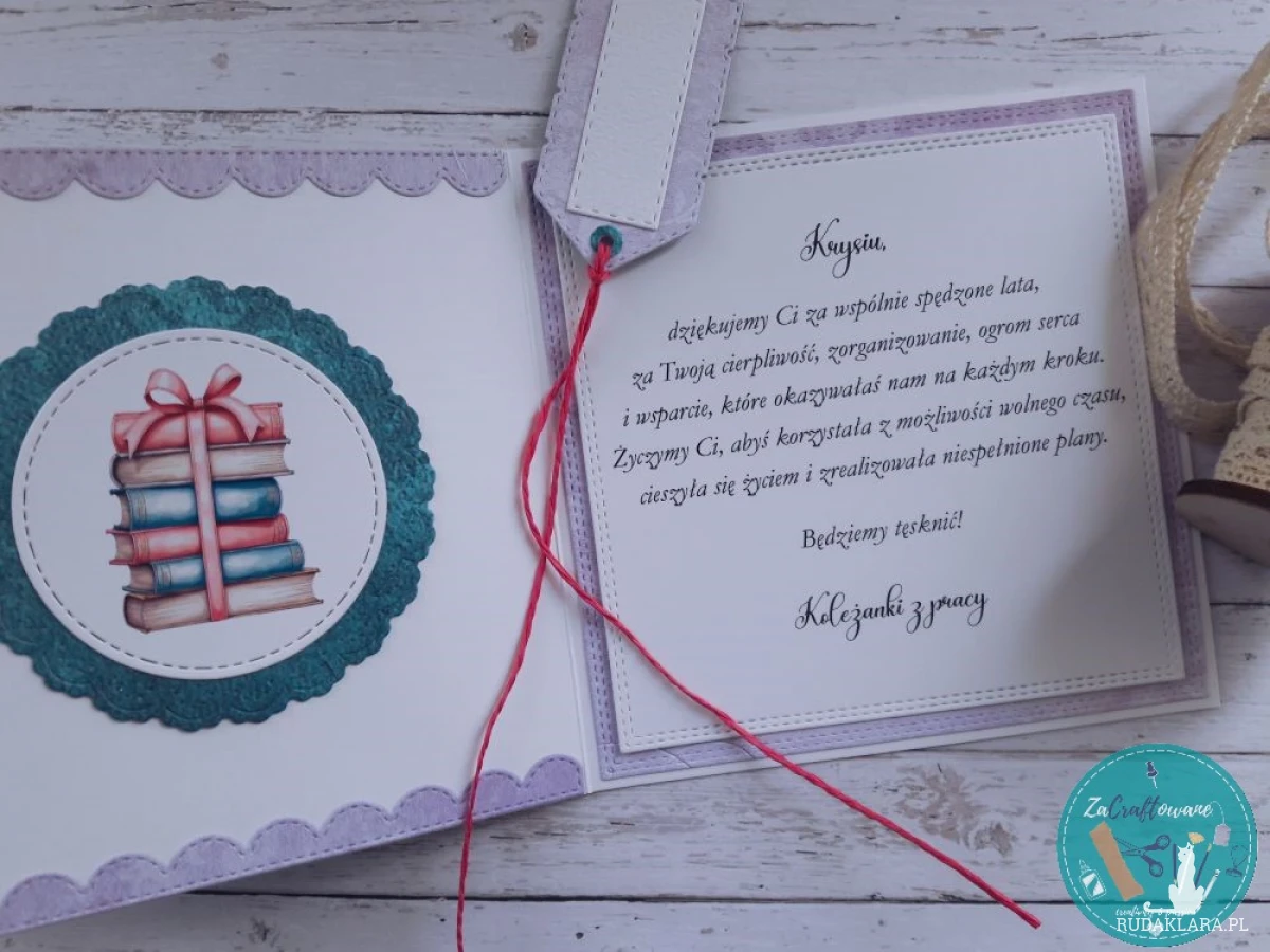 Do kartki dołączam GRATIS w postaci 1 widocznej na zdjęciu etykietki, za pomocą której można podpisać upominek dla osoby przechodzącej na emeryturę i przyczepić ją do wstążki, którą obwiązany jest prezent, za pomocą sznureczka, który również znajduje się w zestawie.