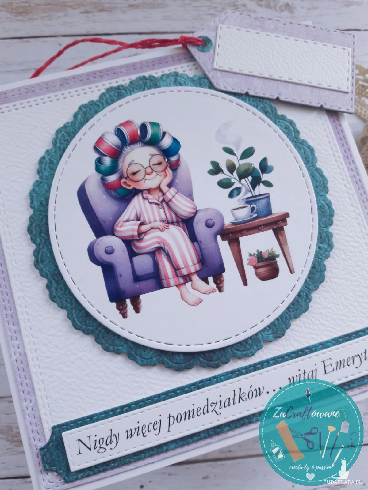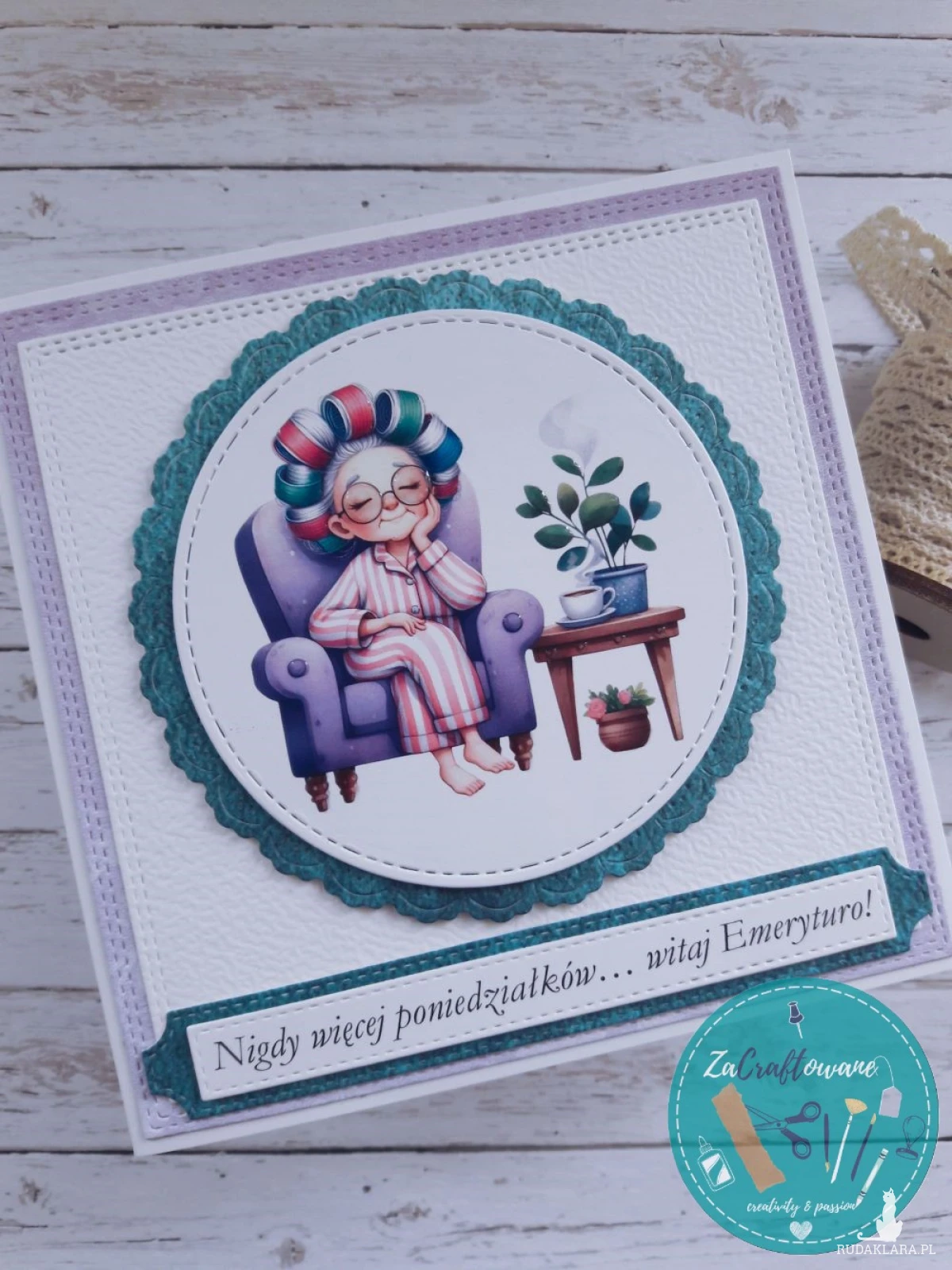 Wesoła kartka z okazji przejścia na emeryturę z kobietą w wałkach na głowie, wykonana metodą scrapbookingu z wykorzystaniem profesjonalnych materiałów i dbałością o każdy szczegół.
