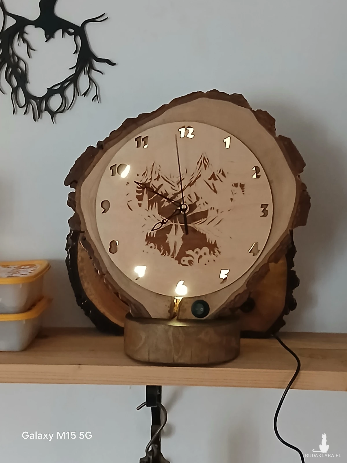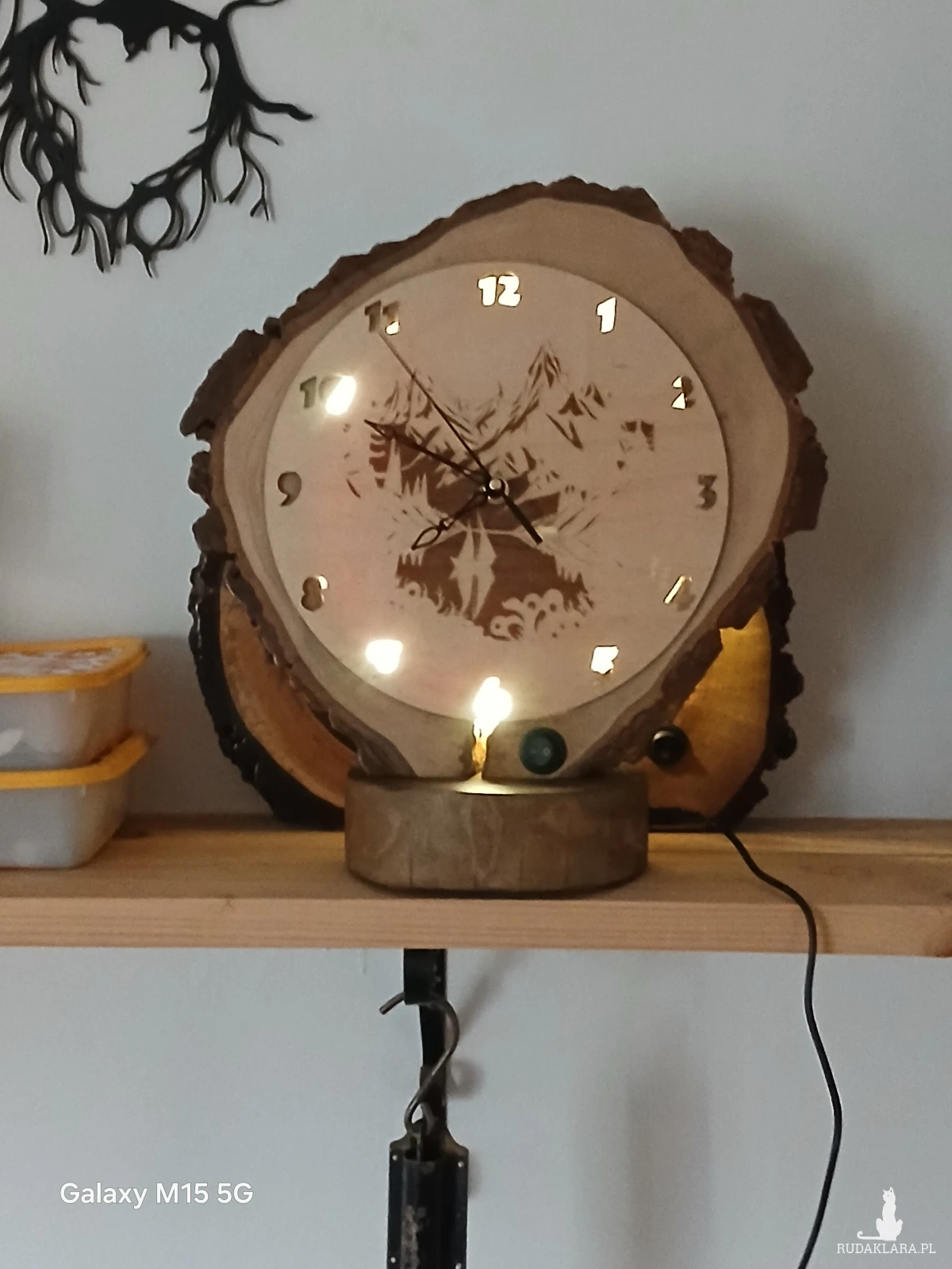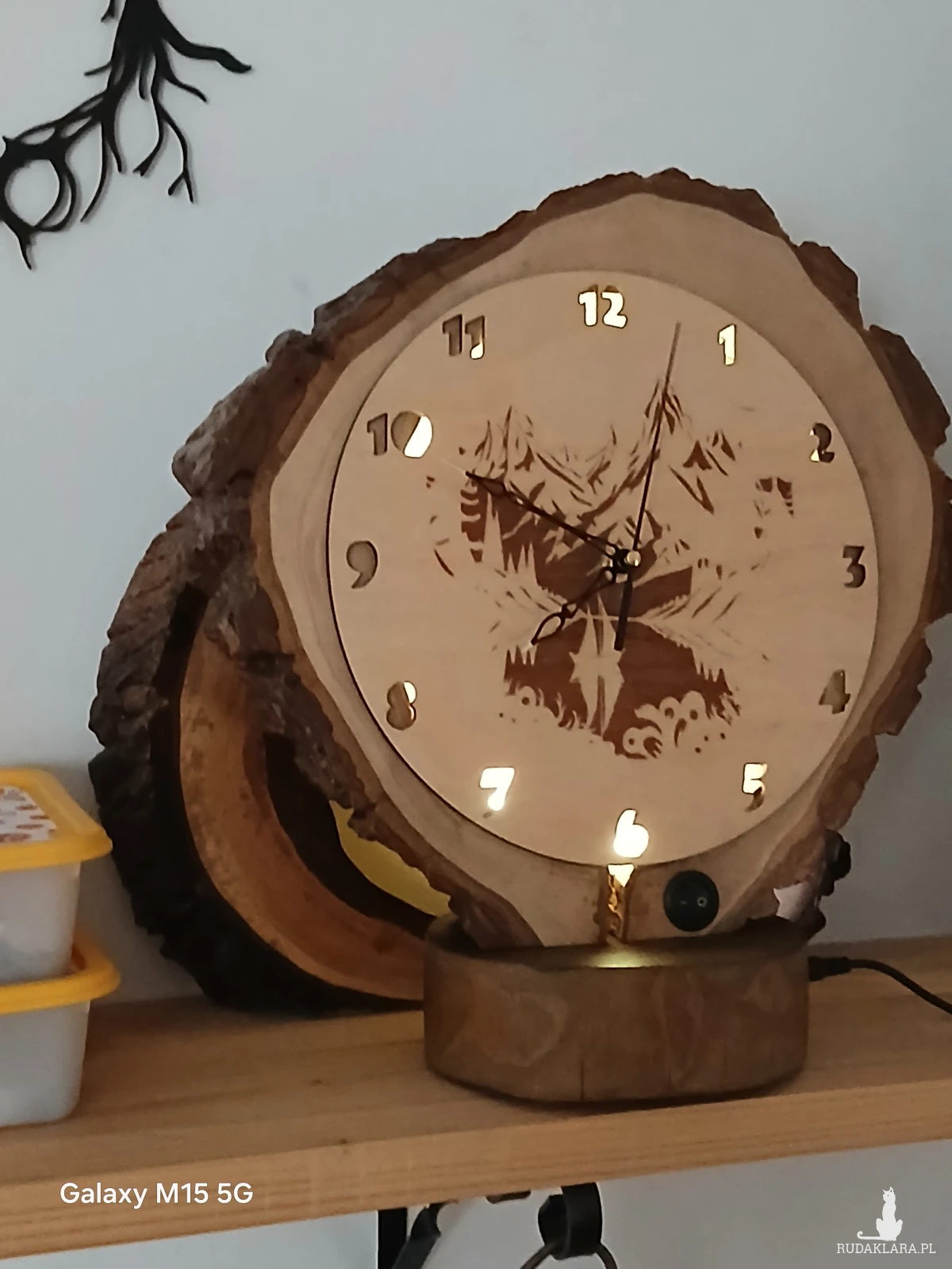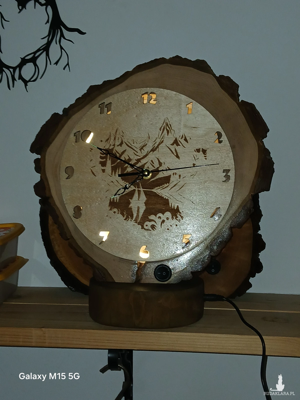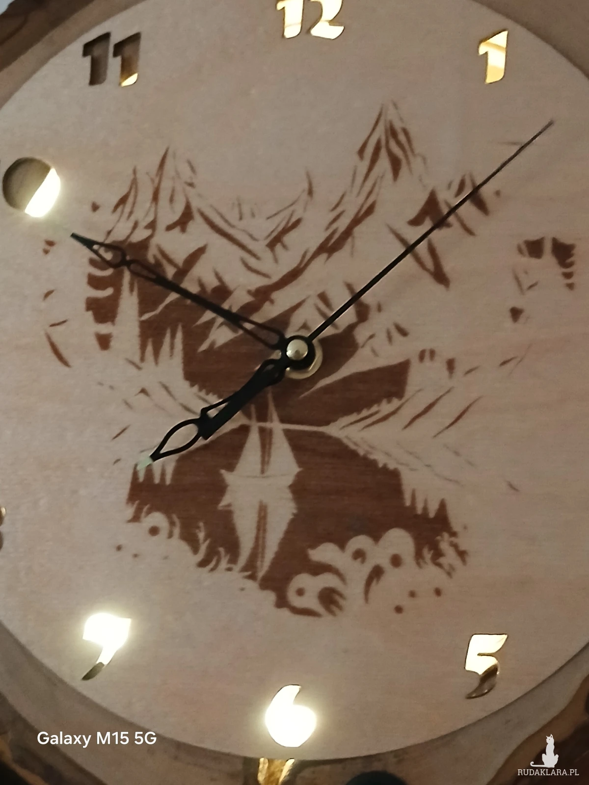 Zegar z podświetleniem ,cyferblat ze sklejki z wypalonym widoczkiem.