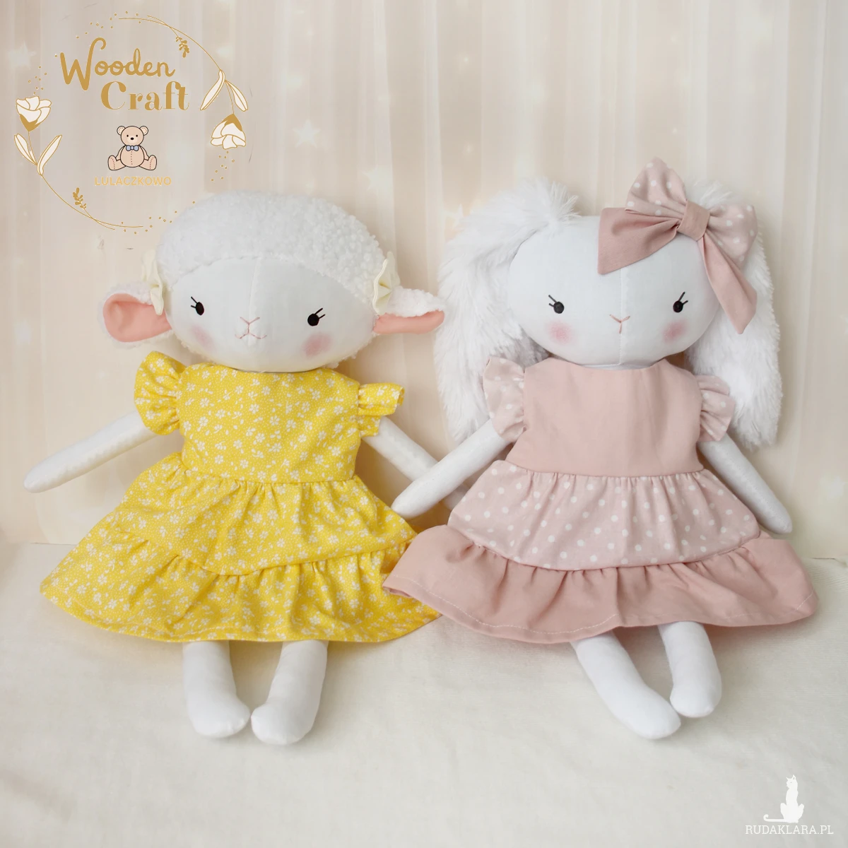 Przeurocza przytulanka, owieczka cała w bieli, uszyta ręcznie z najwyższą starannością, ubrana w żółtą sukieneczkę w drobne kwiatuszki, z falbankami. Wykonana ze 100% bawełny, wypełniona antyalergiczną kulką silikonową. Oczka malowane wodoodpornym markerem, nosek i uśmiech wyszyte muliną, uszka ozdobione kokardkami. Sukieneczkę można swobodnie zdejmować, zapinana jest na rzep. Górne i dolne łapki układają się luźno, owieczka siedzi z podparciem.