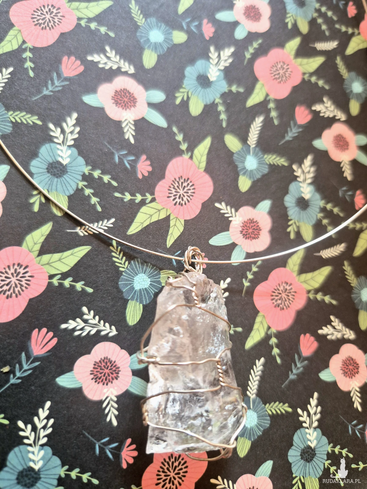 Naszyjnik obroża z kryształem górskim Kryształ Górski jest kamieniem o najsilniejszym działaniu oczyszczającym - zarówno ciało, umysł, jak i pomieszczenia. Przez tę właściwość zwany jest „królem kryształów”, lub „neutralizatorem”. Kryształ Górski to także swoisty „wzmacniacz energetyczny” działający jak akumulator. Umożliwia realizację planów zwiększając naszą zdolność wprowadzania ich w życie. Umożliwia osobisty rozwój poprzez transformację negatywnej energii w pozytywną (zarówno tej zewnętrznej - w pomieszczeniach, jak i tej pochodzącej od innych ludzi). Umysł oczyszczony z negatywnych myśli może efektywnie pracować nad pozytywnymi zmianami wewnętrznymi oraz tymi, które chce przeprowadzić w swoim otoczeniu. Pojawia się w nas obiektywizm odbioru wydarzeń oraz gotowe rozwiązania dla problemów nas dotykających. Powiększa się zdolność koncentracji, rodzi optymizm i wiara we własne możliwości. Życie nabiera sensu, gdyż posiadamy samoświadomość tego, co dzieje się w nas i wokół nas. Dzięki oczyszczającej energii Kryształu Górskiego możemy żyć w zgodzie z sobą, innymi ludźmi i naturą. Box x1