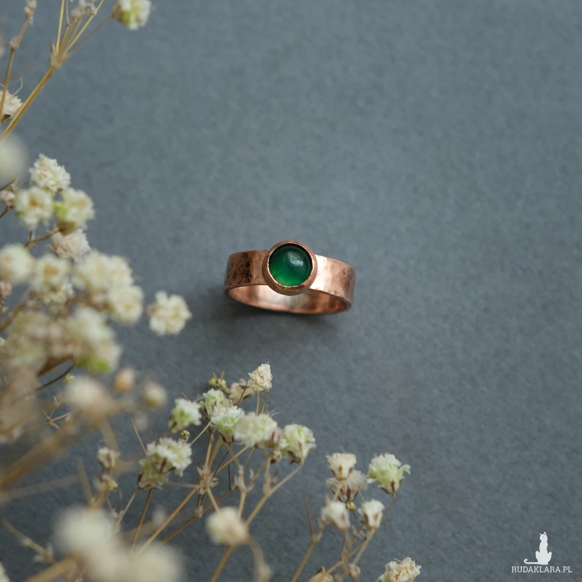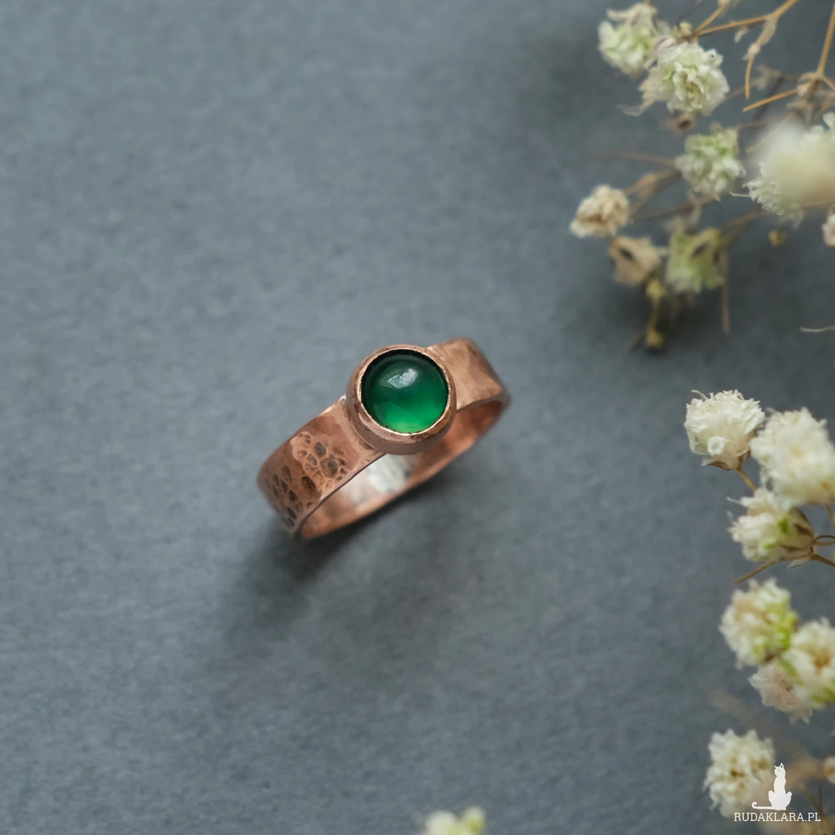Pierścionek na fakturowanej obrączce mieści w sobie kamień zielonego onyksu. Pierścionek został wykonany ręcznie z miedzi, miedź poddałam oksydacji.