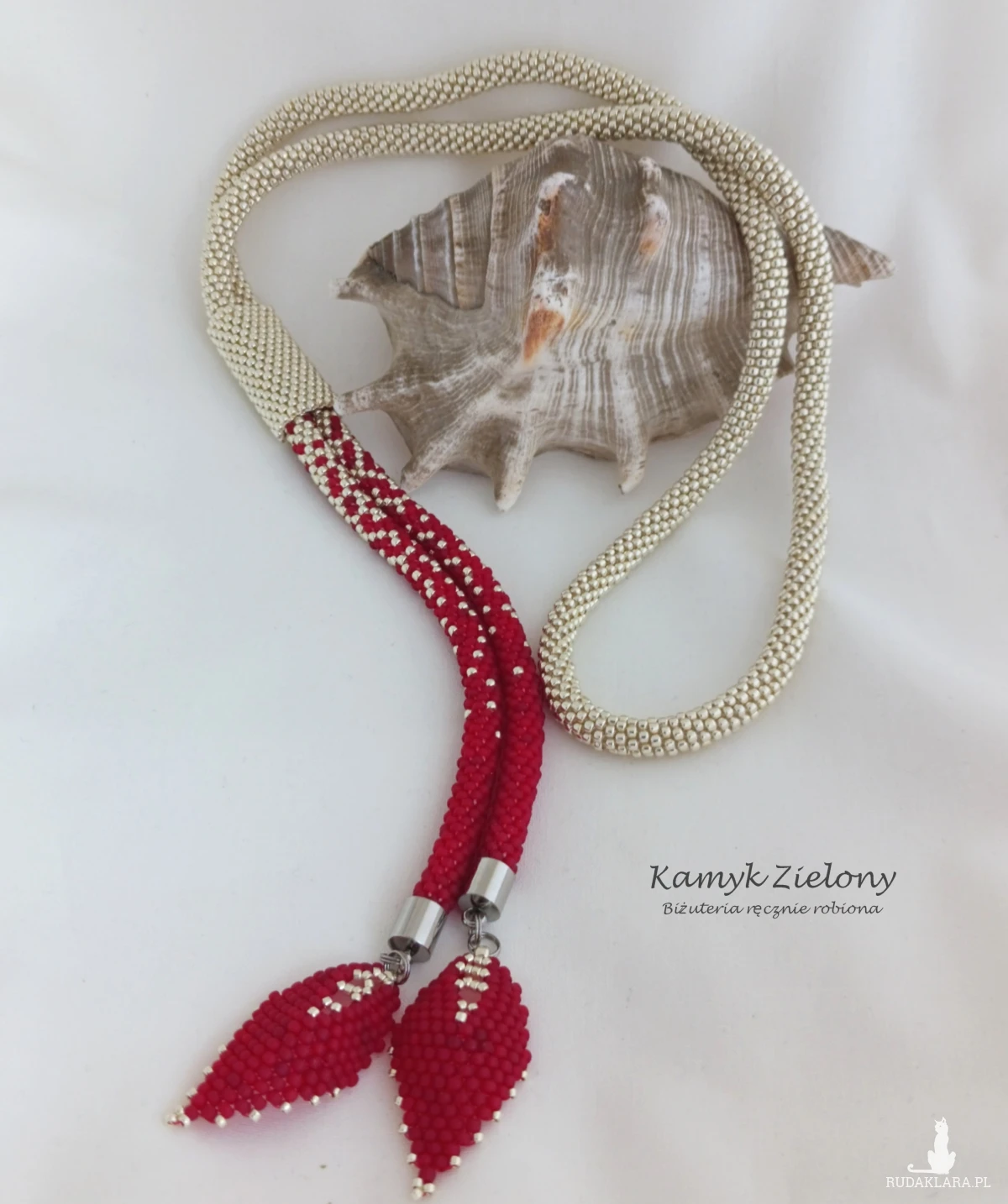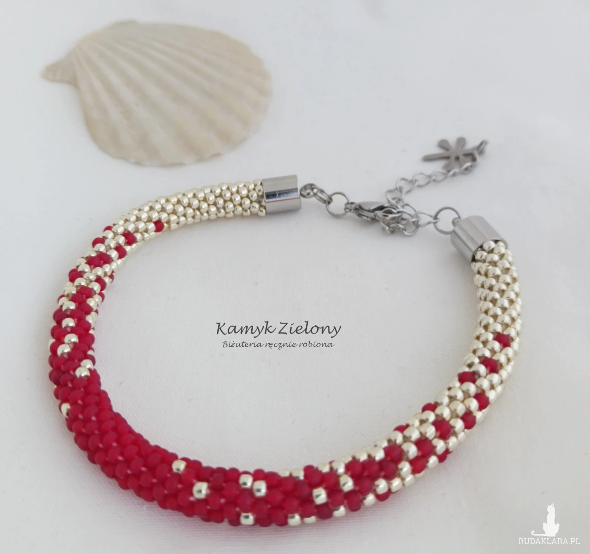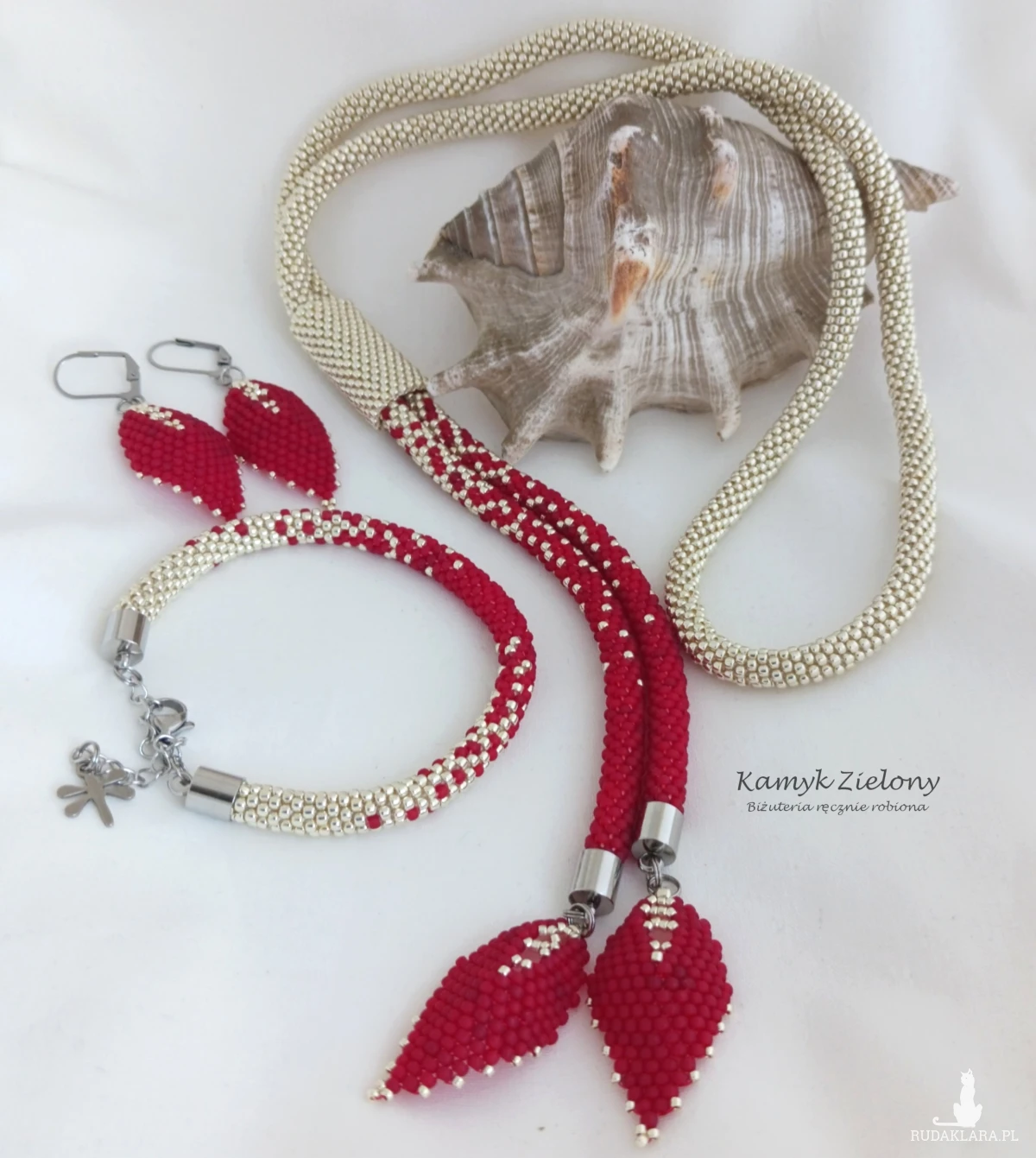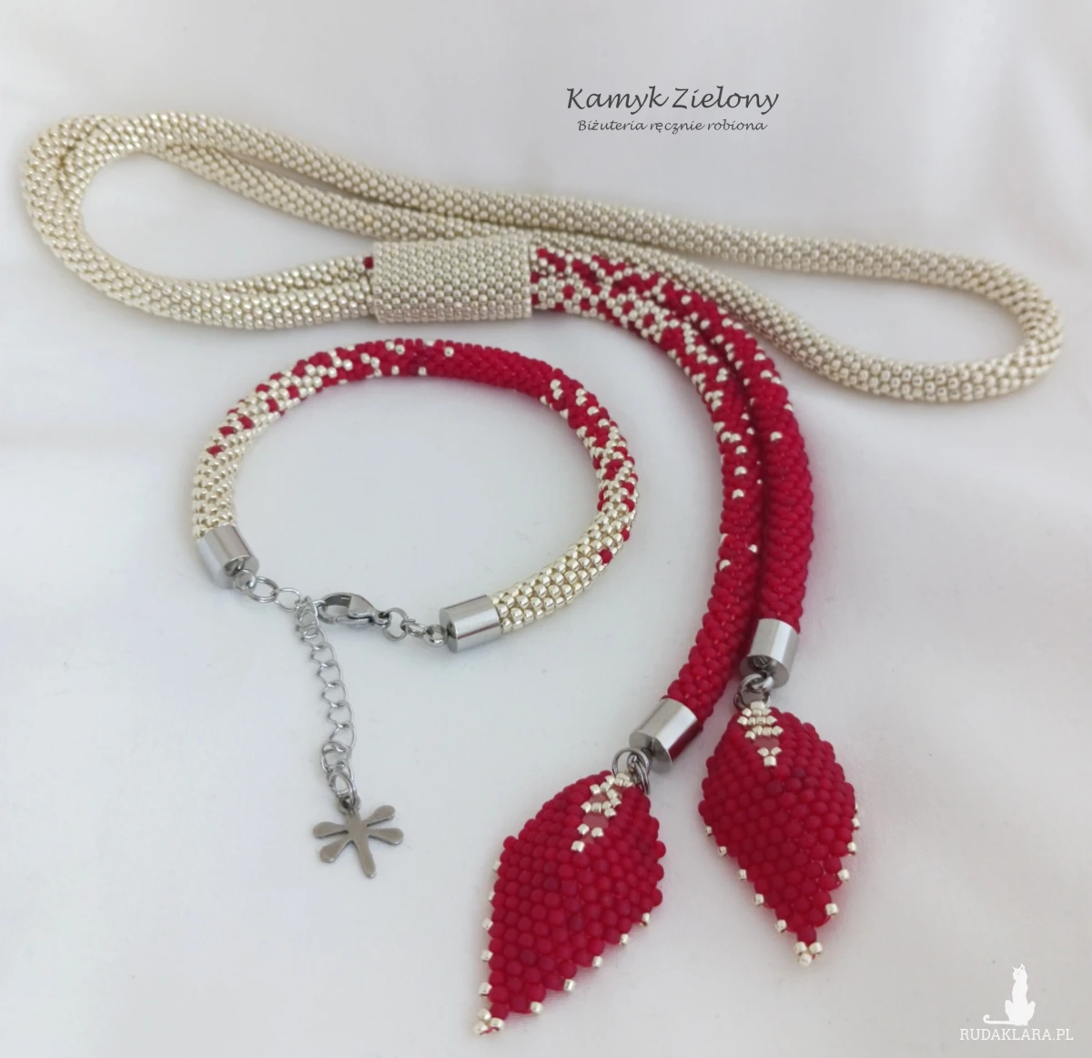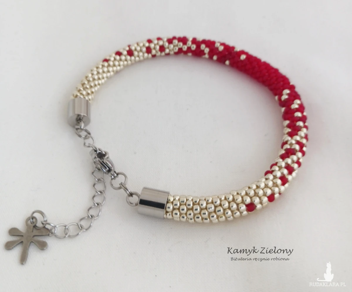 Całość powstała z 2-milimetrowych koralików Toho w kolorze jasnego srebra oraz matowej czerwieni. Do jego wykonania użyto wysokiej jakości koralików ze szkła. W przypadku koralików srebrnych, kolor został naniesiony fabrycznie metodą galwanizowania, dzięki czemu metaliczna, srebrna powłoka jest bardzo trwała.