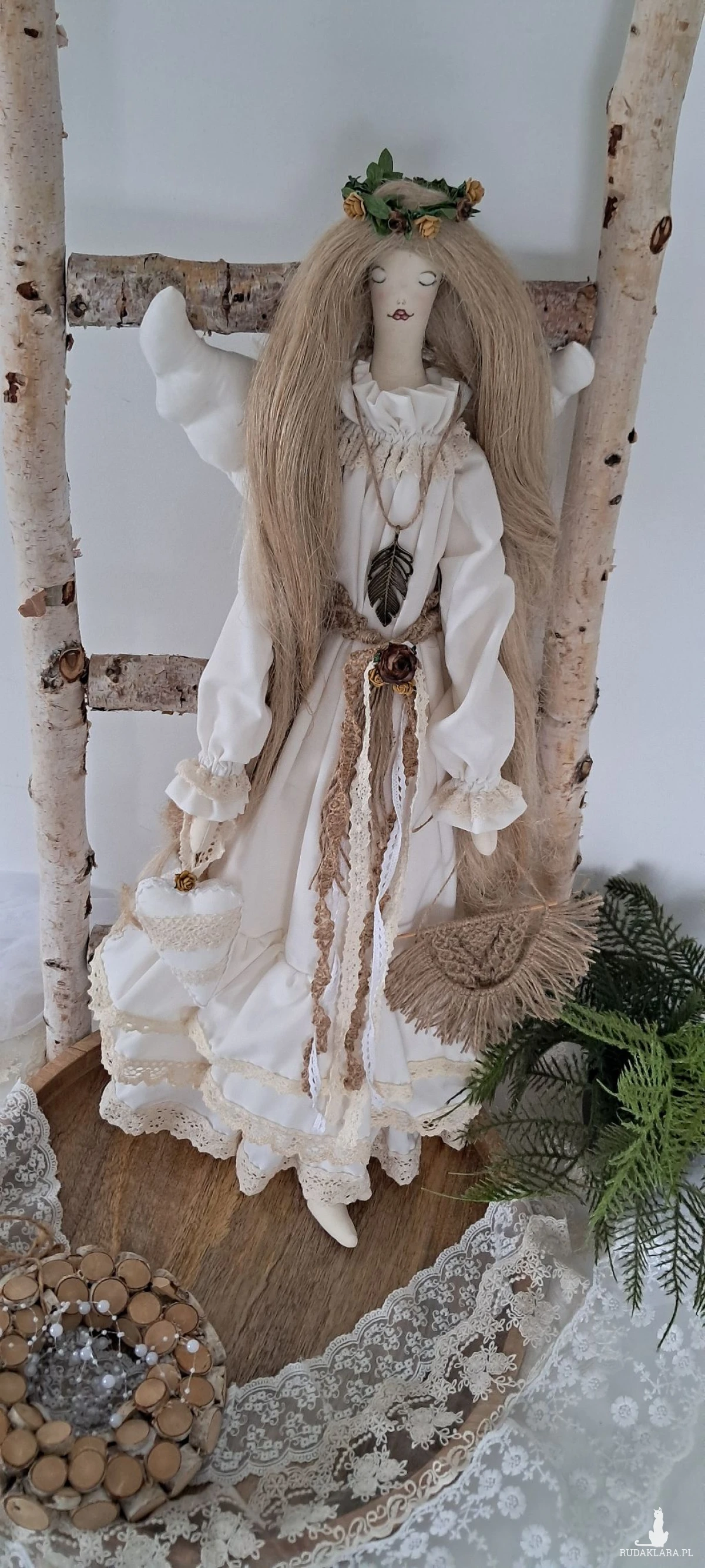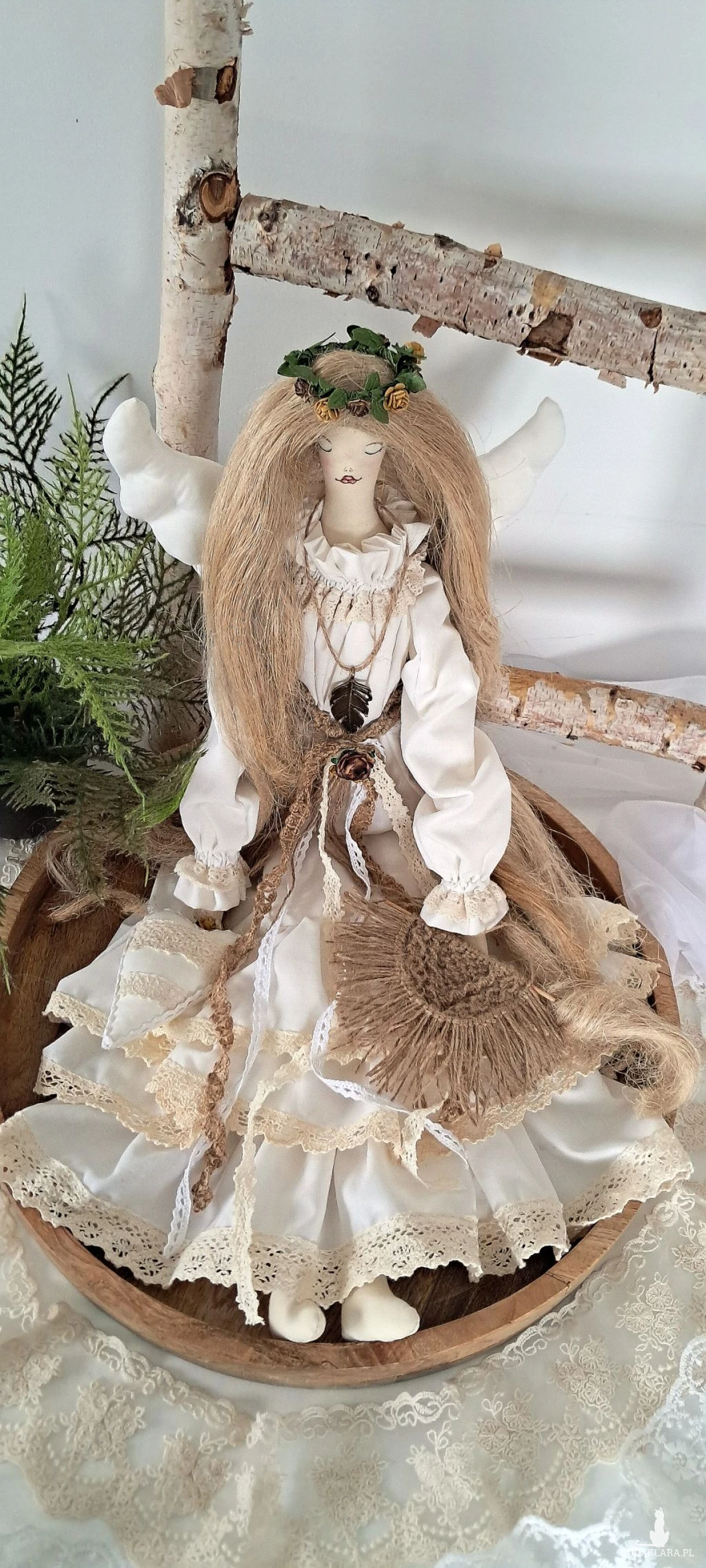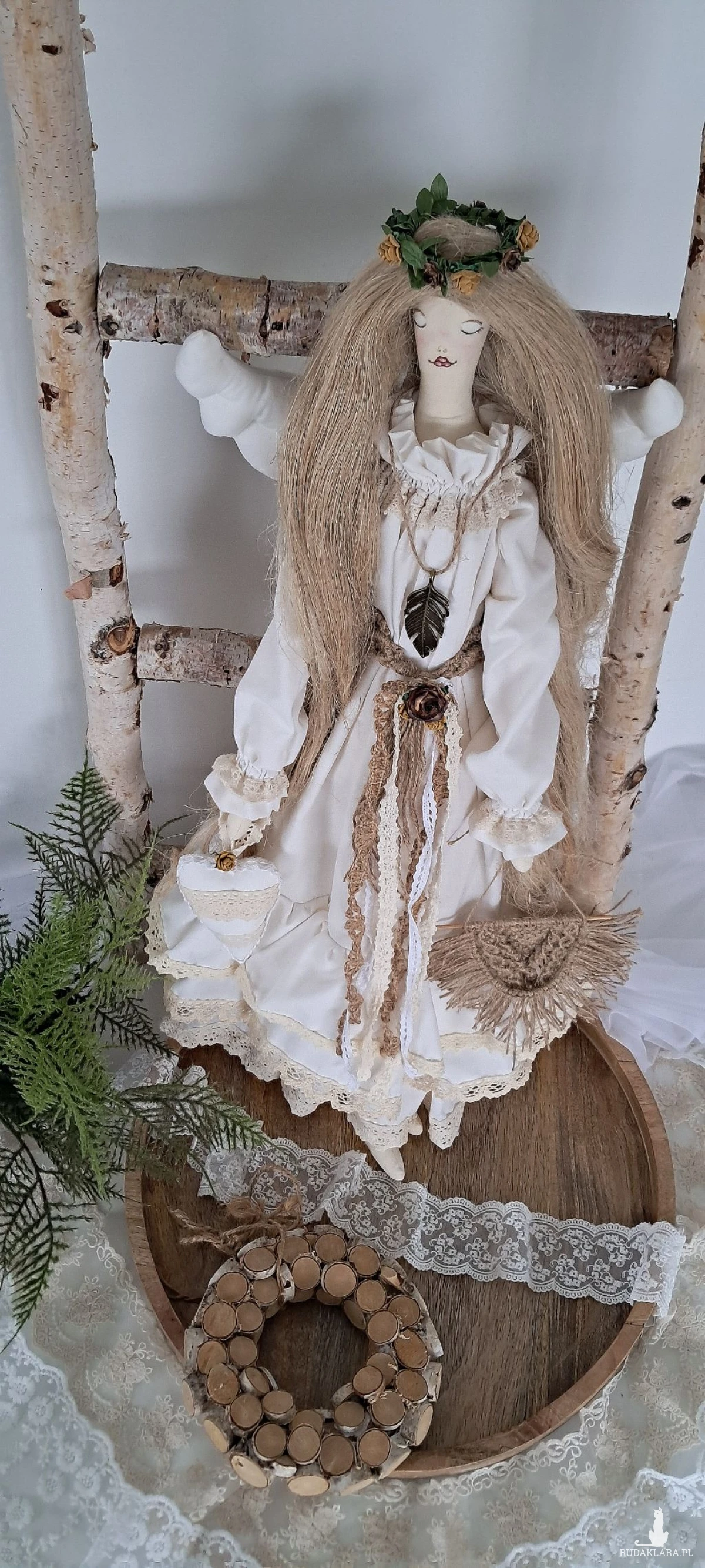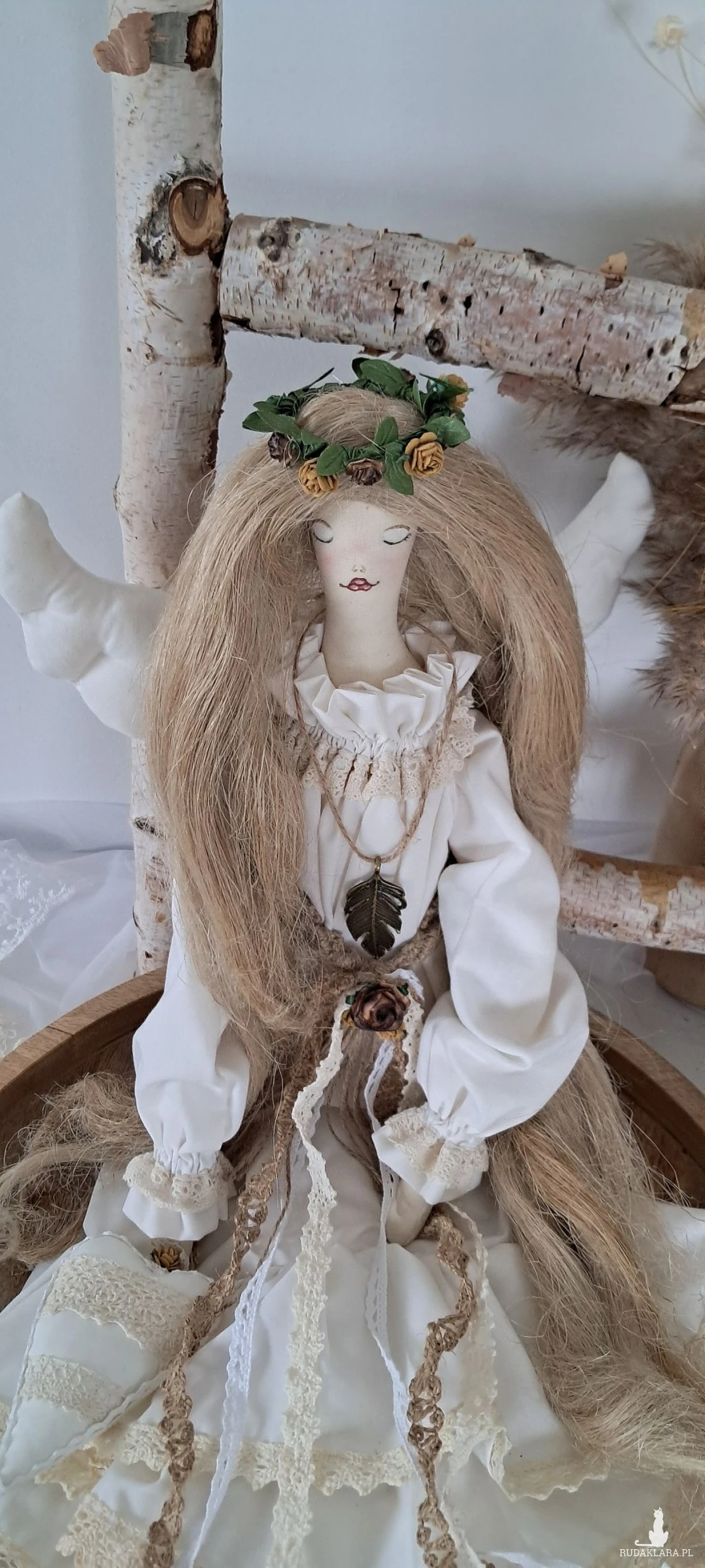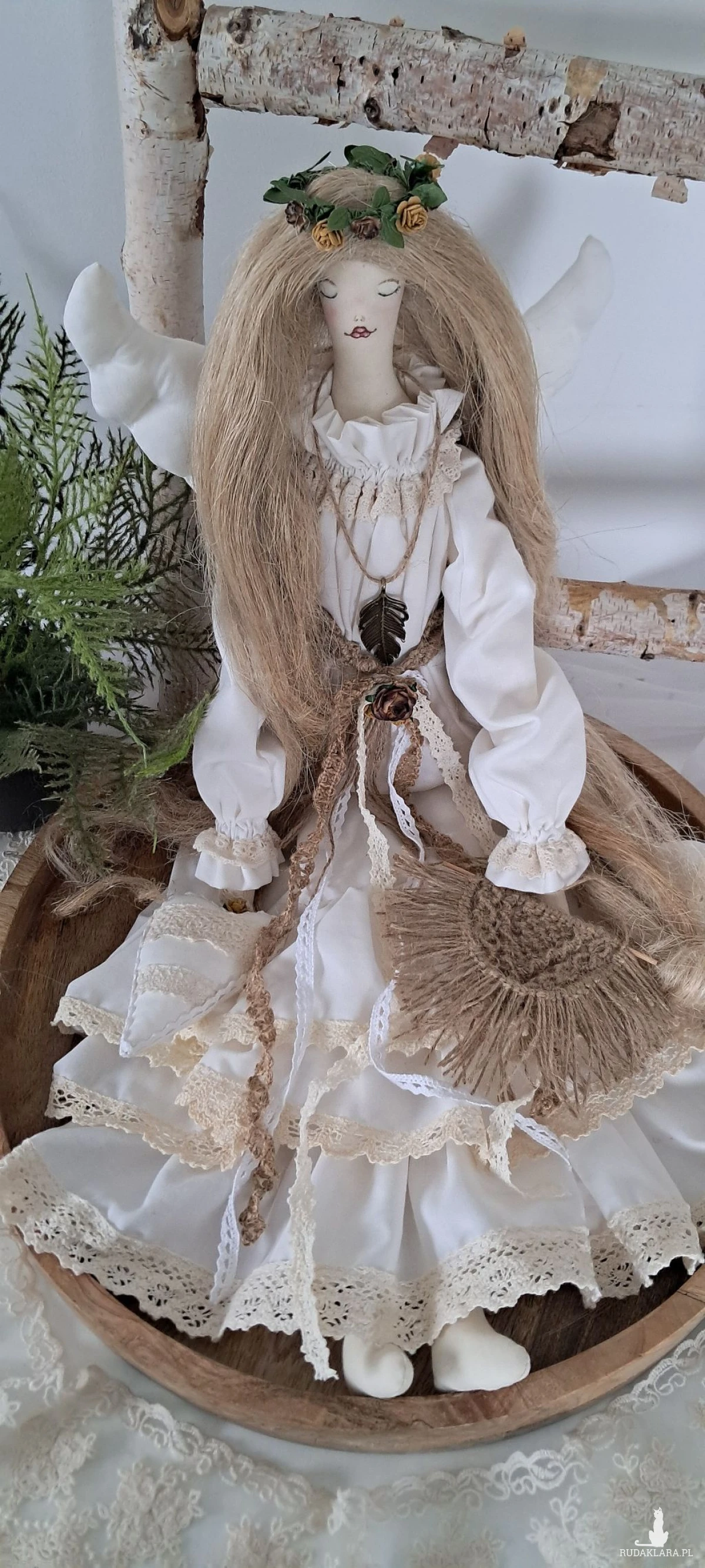 Witam serdecznie:) Mam do sprzedania własnoręcznie wykonanego anioła. Wysokość 67 cm. Może siedzieć lub być zawieszony. Ciało wykonane z surówki bawełnianej, wypełnione antyalergiczną kulką silikonową. Twarz malowana farbami. Włosy wykonane z pakuły lnianej. Na główce wianek z suszonych kwiatów do kompletu z takich samych bukiet.Sukienka uszyta z bawełny koloru ecri, ozdobiona falbanami i koronkami oraz paskiem wykonanym przeze mnie ze sznurka jutowego. W rączce trzyma serduszko i mini makramę ze sznurka jutowego, zrobioną również przeze mnie. Na szyi zawieszone metalowe piórko. Unikatowy prezent z różnych okazji Komunia, chrzest, urodziny, dzień mamy, zakończenie edukacji, wyrażenie wdzięczności, miłości, podziękowanie -piękna dekoracja:)