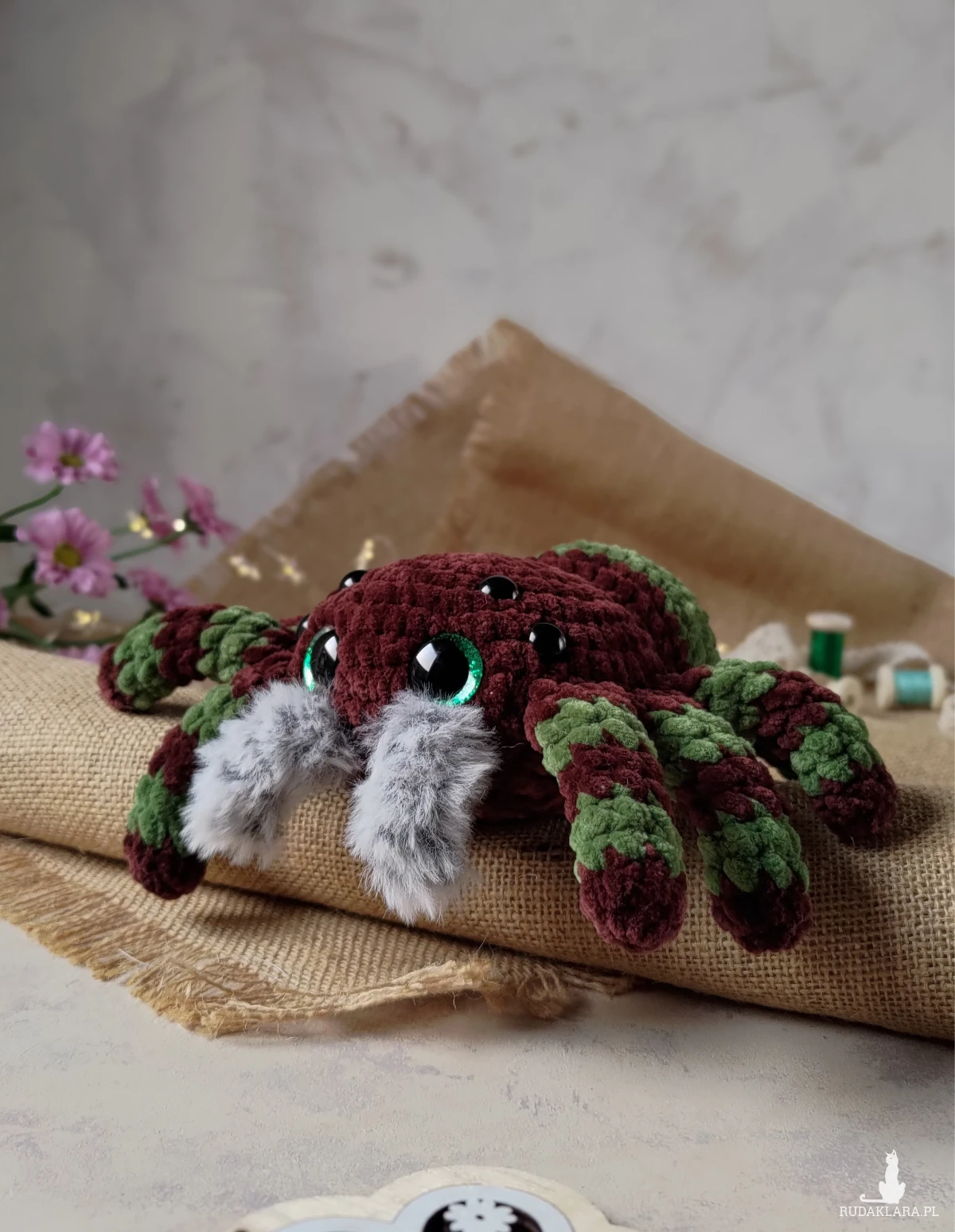 • Pająk jest wykonany z włóczki pluszowej (100% poliester) i jest miękka i przyjemna w dotyku, posiada Certyfikat Oeko-Tex.