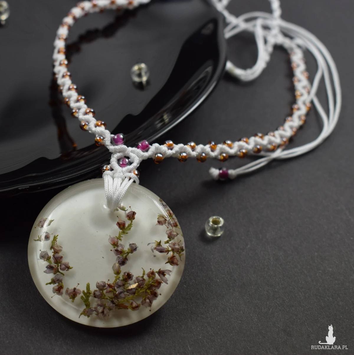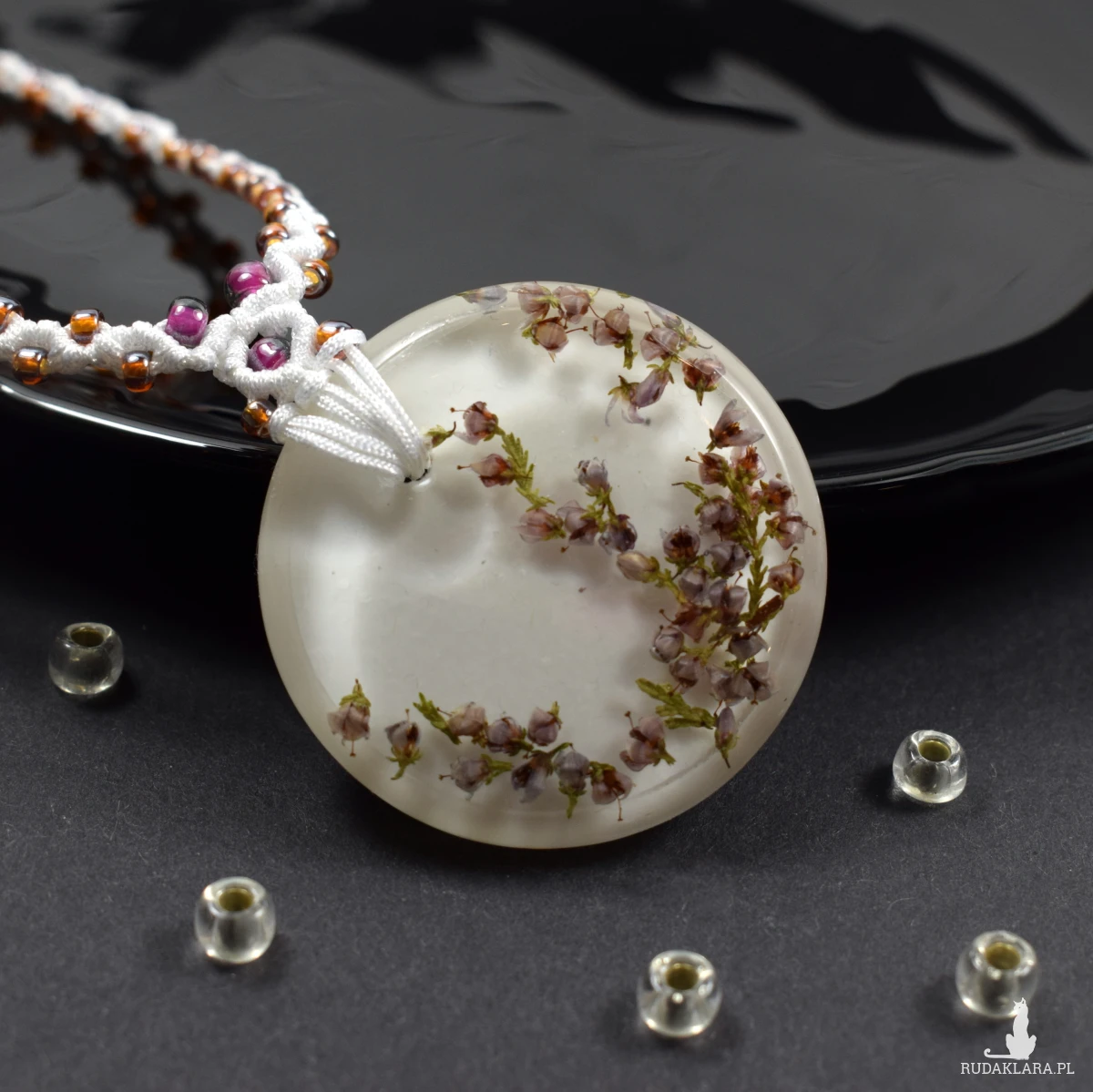 Duży wisiorek z zatopionymi kwiatami wrzosu w żywicy to niezwykły