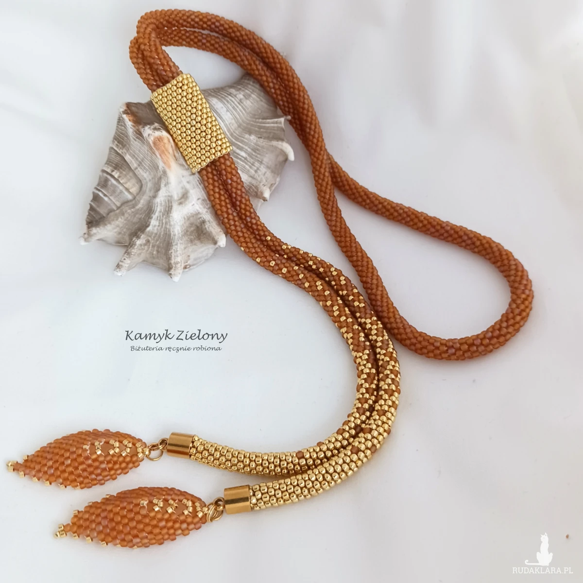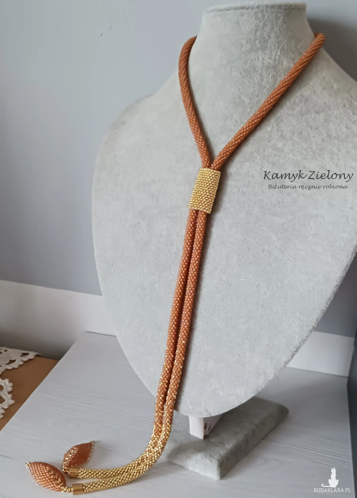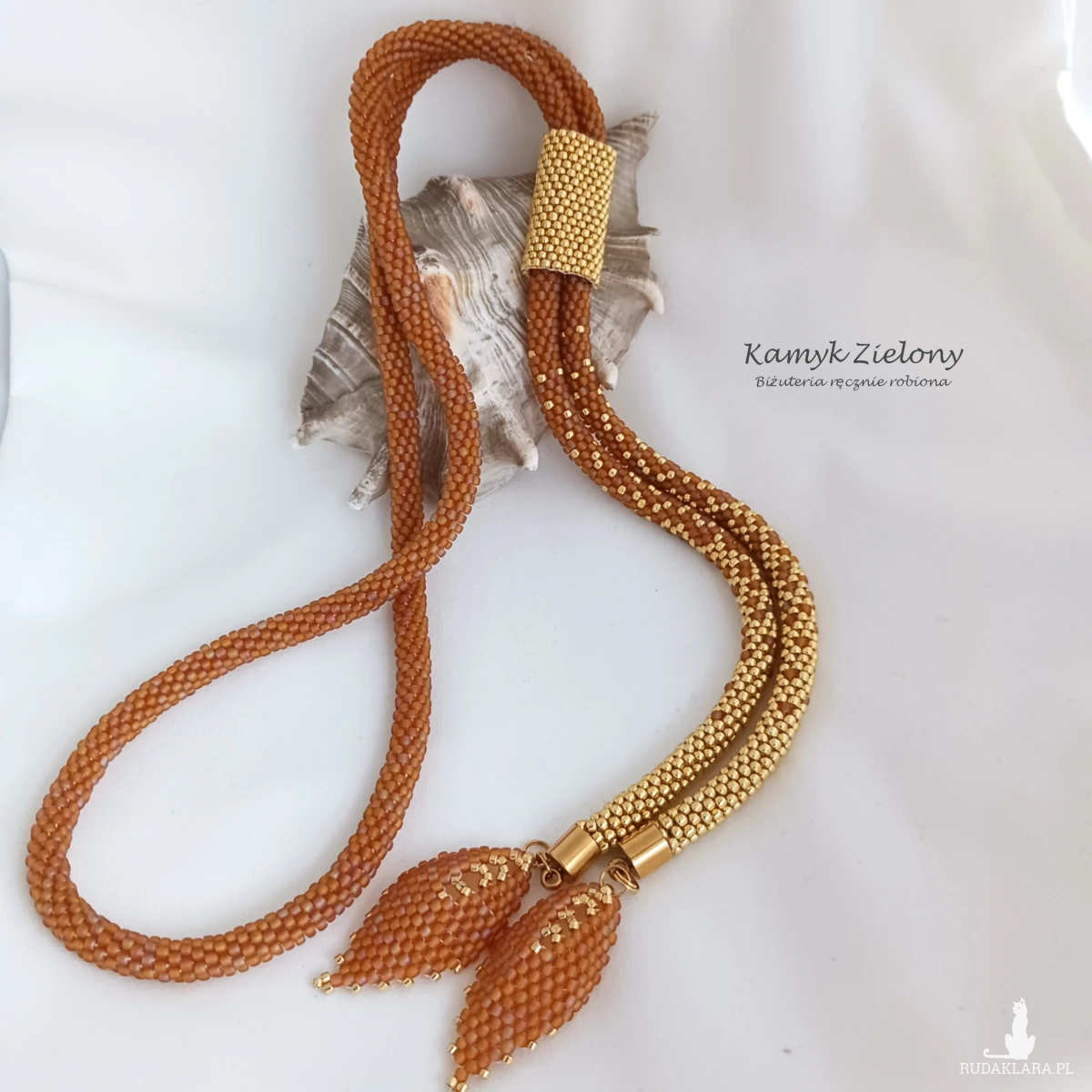 Dłuższy naszyjnik wykonany ręcznie z drobnych koralików japońskiej firmy Toho, uważanych za jedne z najdoskonalszych na świecie koralików ze szkła. Do jego zrobienia wykorzystano koraliki w kolorze miodowym oraz złotym.