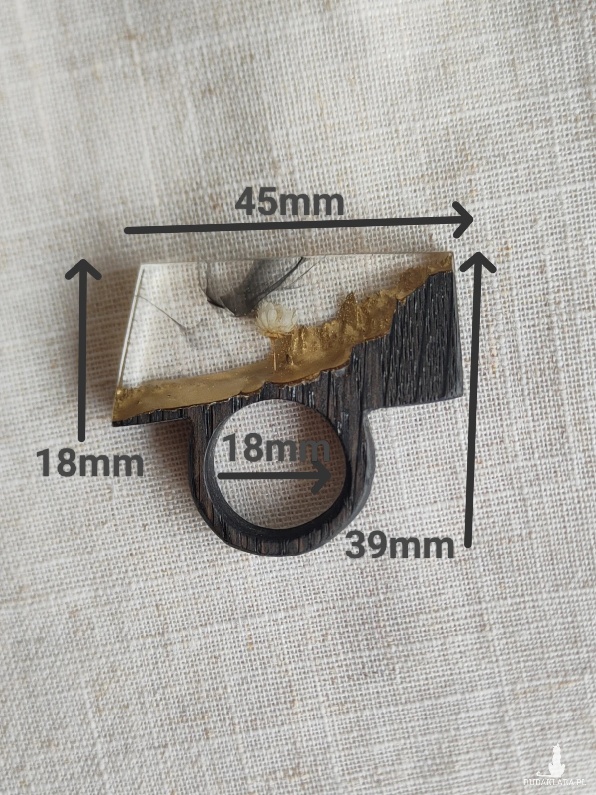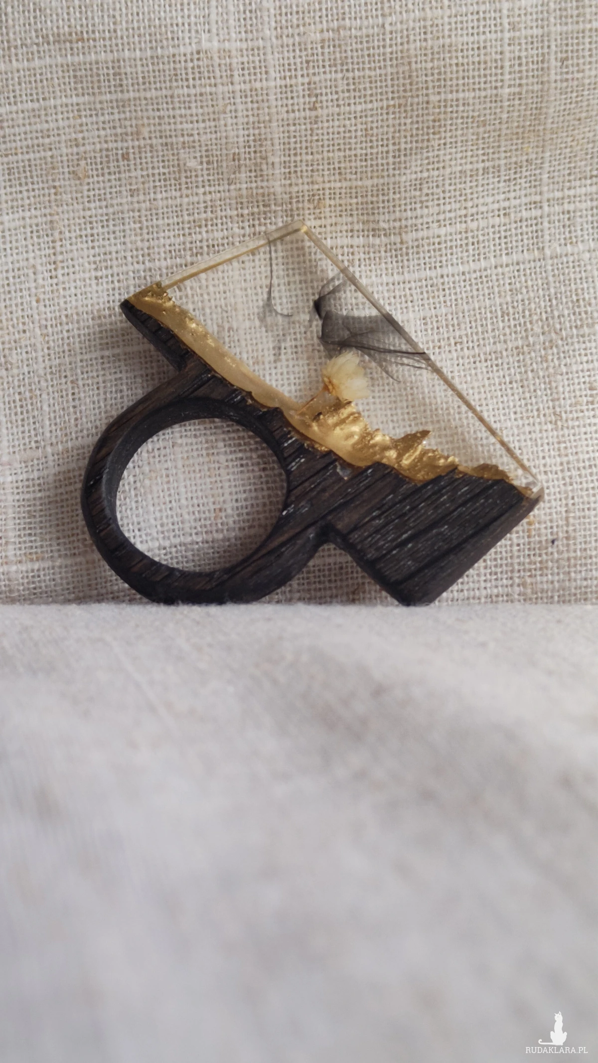 Ręcznie wykonany pierścionek z czarnego dębu, pokrytego złotą farbą, oraz krystalicznie przezroczystej żywicy epoksydowej.
