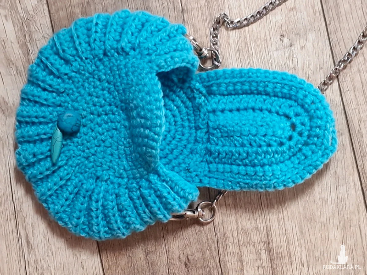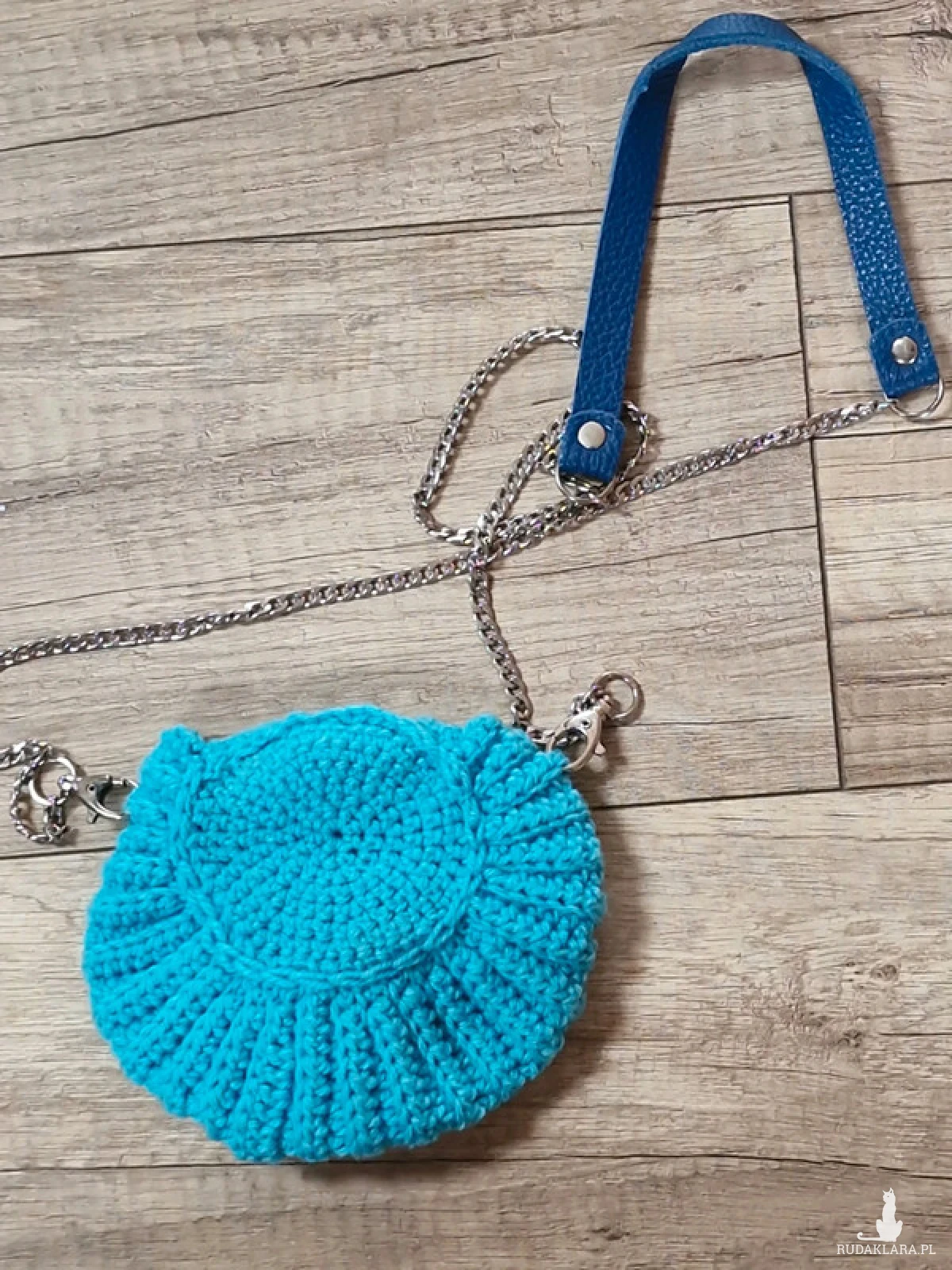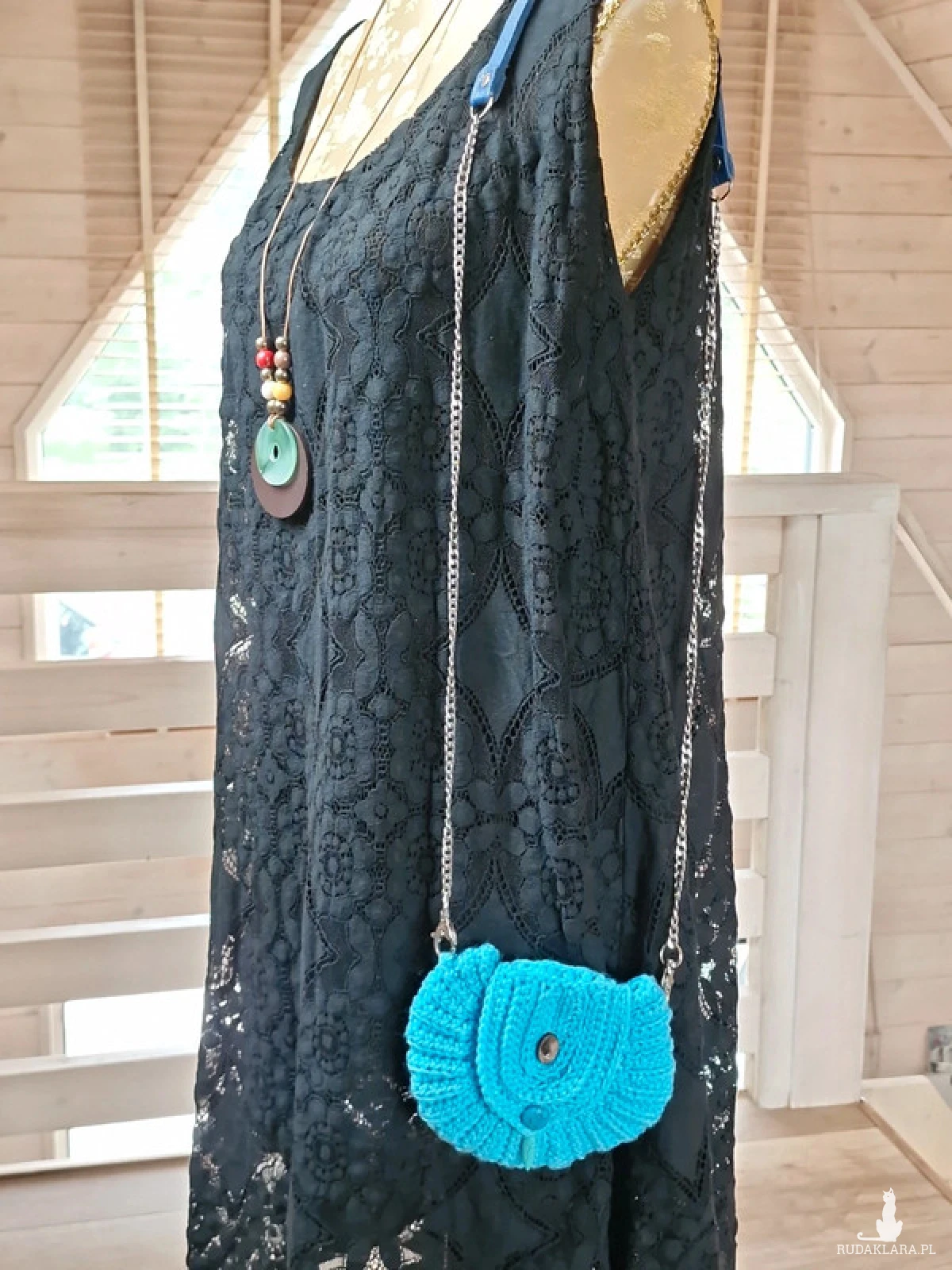 Torebka Oreo handmade w kolorze turkusowym. Unikatowa, zrobiona z włóczki z dodatkami łańcuszek z elementem skórzanym i koraliki turkusy . Doskonała dla osób ceniących ręcznie robione przedmioty.