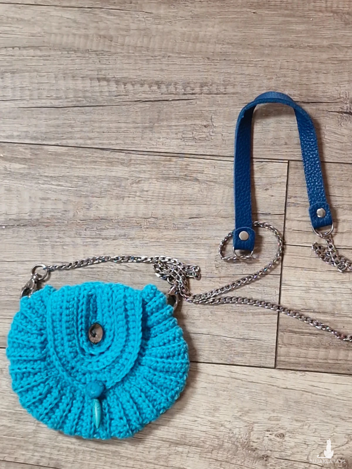 Urocza torebka wykonana na szydełku z łańcuszkiem i kawałkiem skóry Wys -15 cm Szerokość-16cm Pasek ( łańcuszek? 64cm mierzony w połowie
