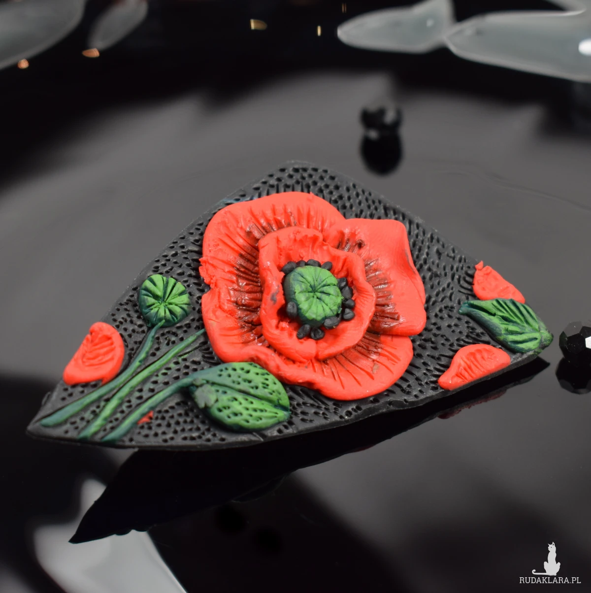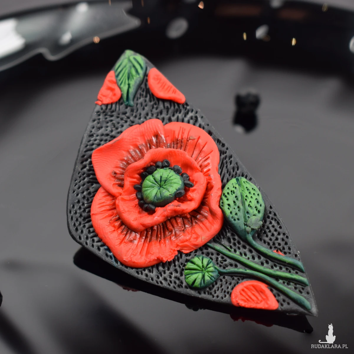 Wyjątkowa broszka o asymetrycznym kształcie, z motywem kwiatu maku.