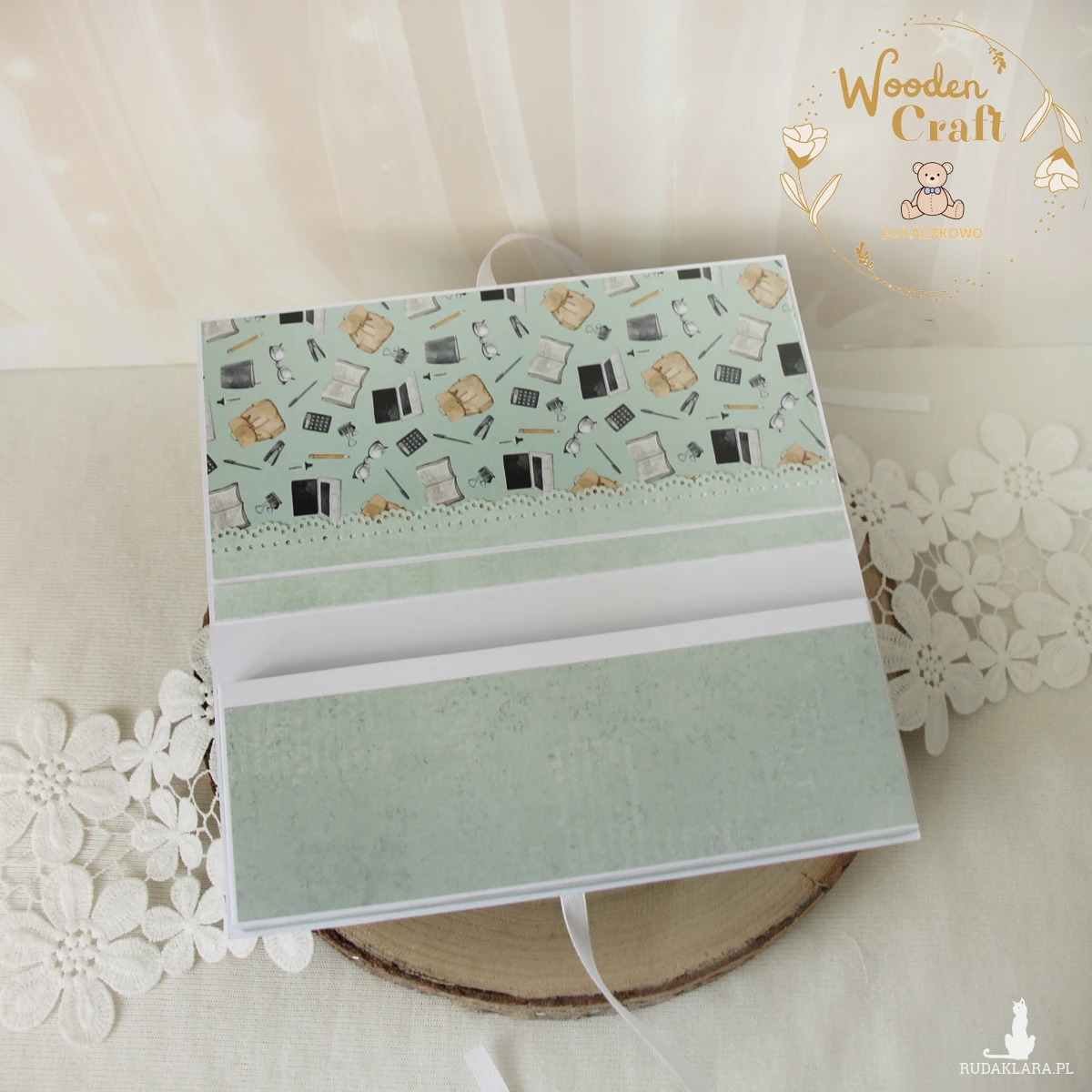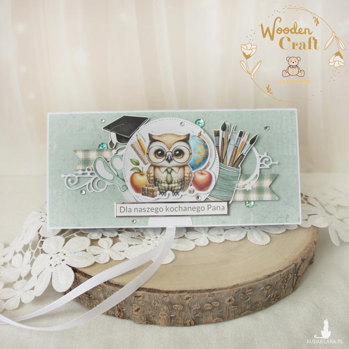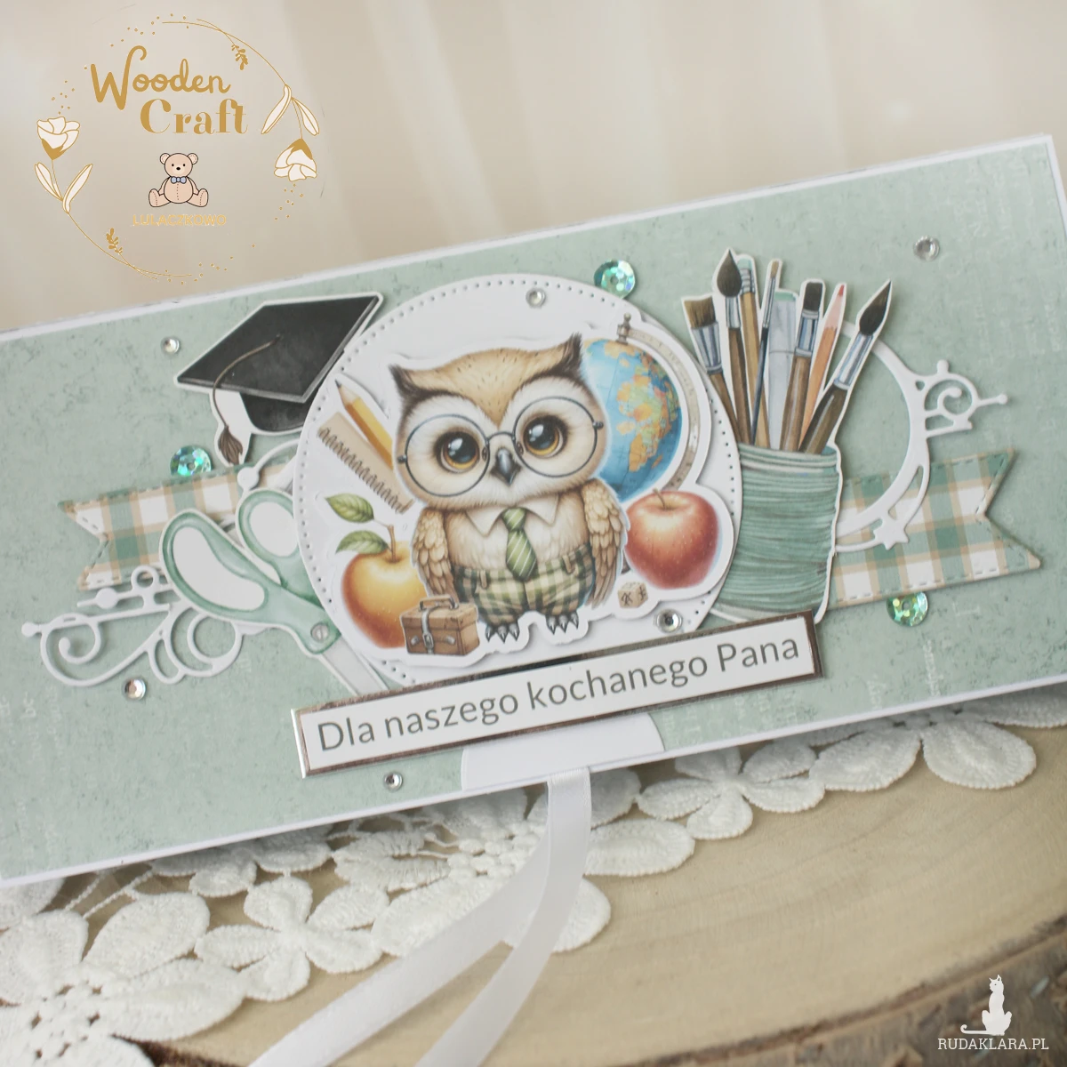 Czekoladownik z motywem sowy i przyborów szkolnych, został wykonany z grubego kartonu o gramaturze 300g, ozdobiony papierami scrapowymi w kolorze mięty i bieli, wiązany na wstążeczkę. Na wierzchu napis "Dla Naszemu Kochanego Pana" - mogę również zmienić na inny.