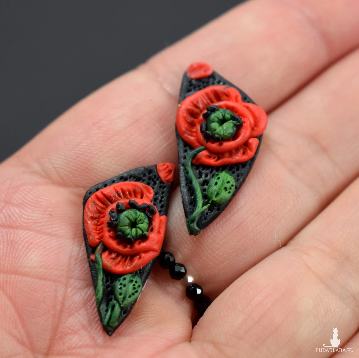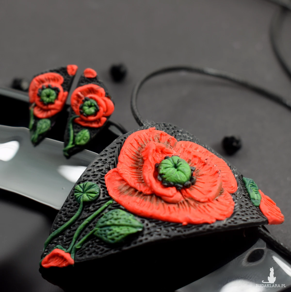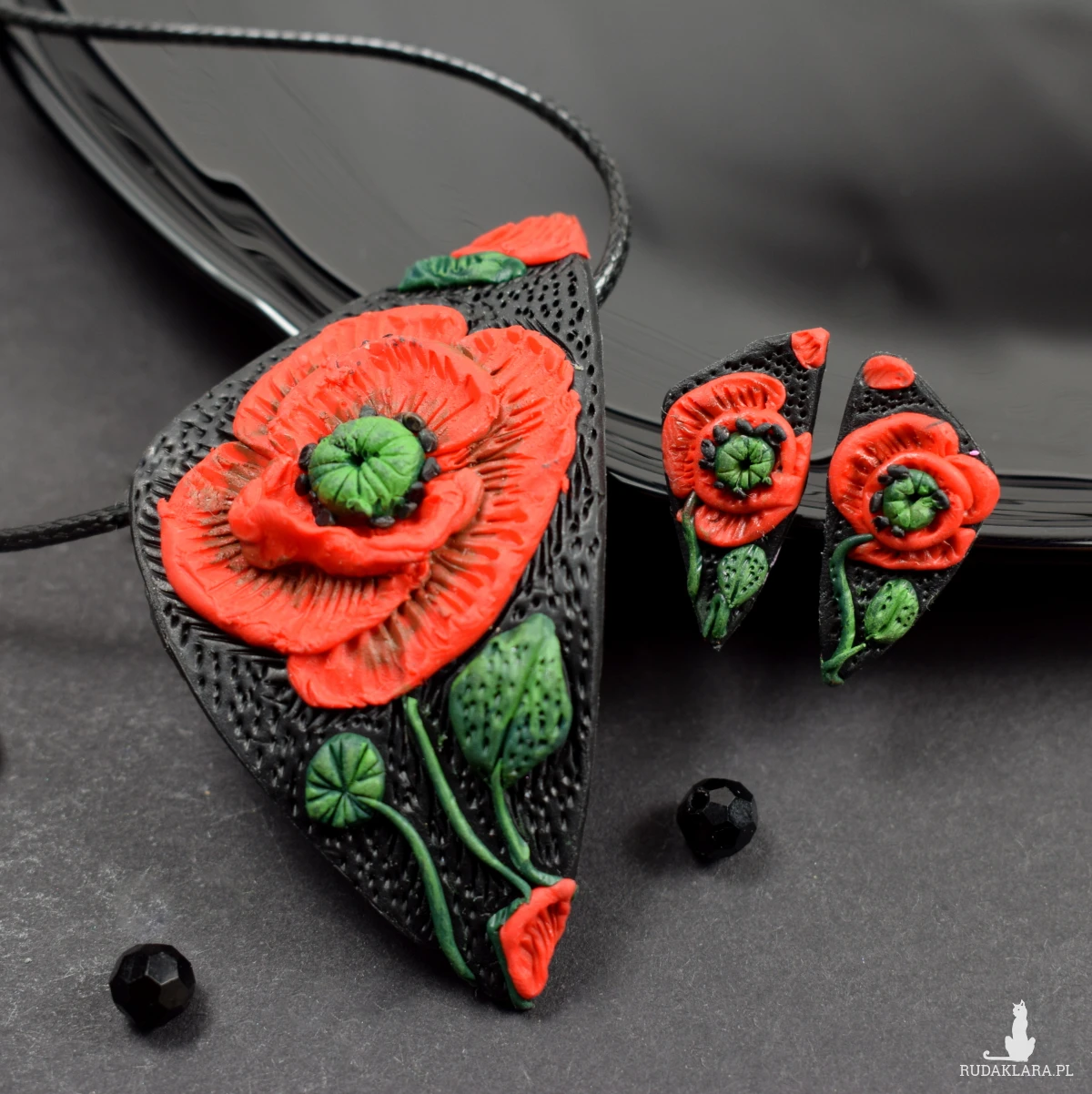 Wyjątkowy komplet biżuterii o asymetrycznym kształcie "czerwone maki".