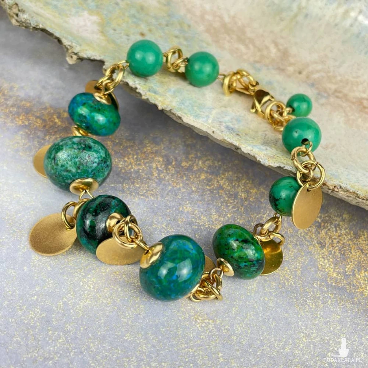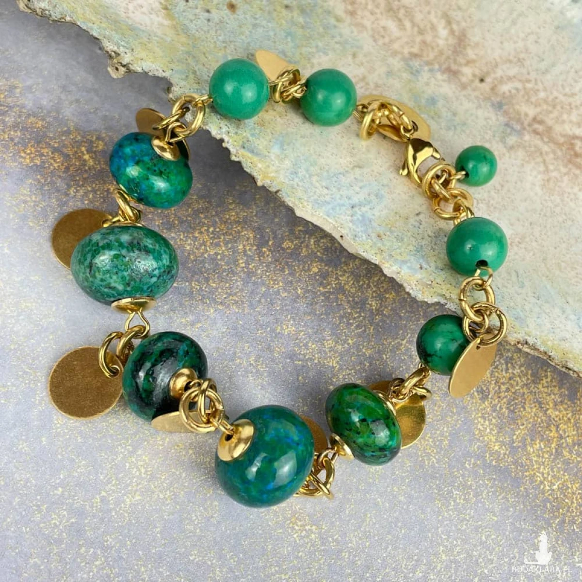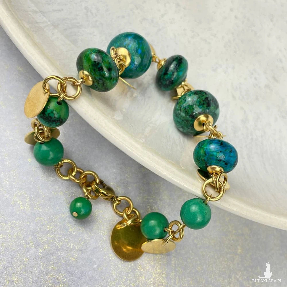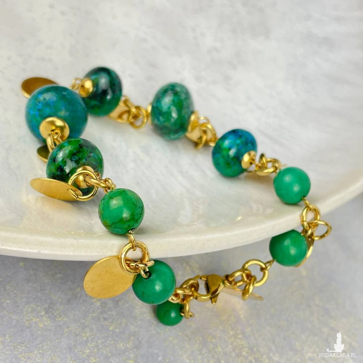 Bransoletka została stworzona z korali chryzokoli i turkusu afrykańskiego w odcieniach zieleni oraz turkusu. Kolory podkreślają pozłacane 23 karatowym złotem elementy ze stali szlachetnej oraz mosiądzu. Kolor złota został dobrany tak, aby miał kolor mosiądzu; dzięki temu, nawet jeśli warstwa złota miejscowo się zetrze na skutek codziennego użytkowania, nie będzie to widoczne, gdyż złoto i mosiądz mają taki sam kolor. Bransoletkę uzupełnia okrągła zawieszka z logo pracowni Artseko. Bransoletka zapinana jest na praktyczny karabińczyk. Z pewnością sprawdzi się jako dodatek do stylizacji dziennych lub jako prezent dla bliskiej osoby.
